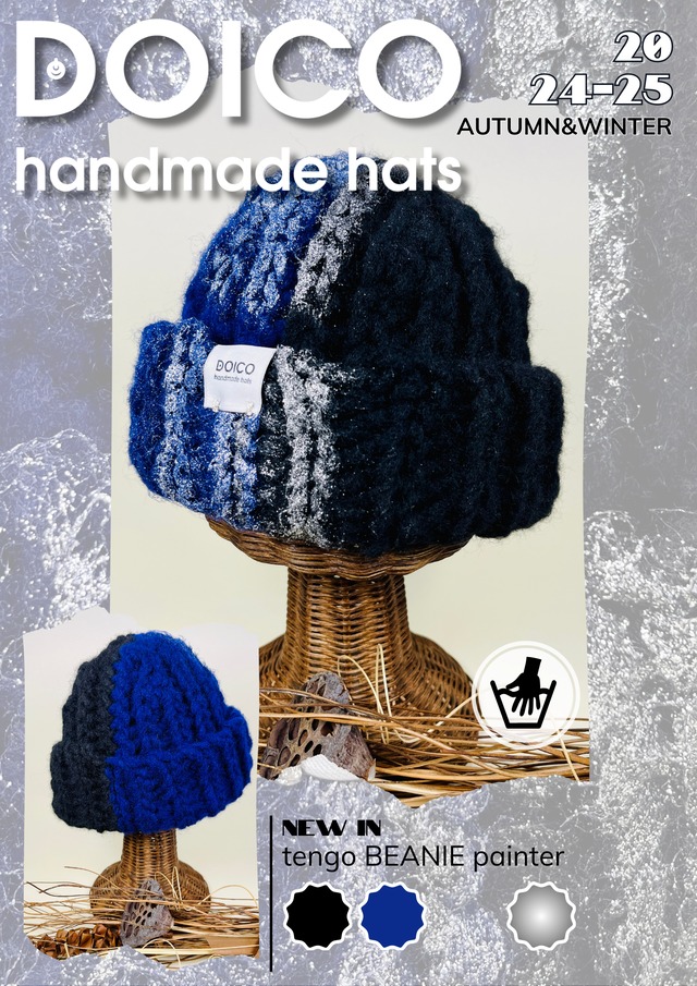 ||∥▶︎tengo BEANIE painter◀︎∥|| 2024-25 A/W new in Black × Navy × Silver Glitter 0.5番の超太番手のビーニー帽です。 帽子の一部分にシルバーラメの絵の具でペイントしました。たっぷり絵の具を使いましたのでペイント部分はゴワつきます ラメ糸を編んで上品に表現することも出来ますが、敢えてのペイントです…超楽しい なかなかヤンチャな感じに仕上がりました。 布用絵の具なので手洗いも出来ます。 ペイントのインパクトが大きいですが、ベースの毛糸もバルキーな超太番手でリッチな存在感があります 本体 72%ウール/28%ナイロン 部分 布用絵の具 ///サイズ/// 頭周り 54〜58㎝(Mサイズ) 深さ 20㎝+9㎝(折り返し) 130g ///// 汚れ防止 ///// 帽子の内側に不織布のカバーが付いています。赤いしつけ糸は手で外せます。不要でしたら外してご利用下さい。 ///// お手入れ ///// 普段は半日以上陰干ししてから収納してください。 季節の終わりや汚れが気になる場合には 手洗いが可能です。 ①不織布カバーがついたままでしたら外してください。折り返しを広げて洗濯ネットに入れます。 ②オシャレ着洗い用中性洗剤にて容量用法をまもり《単独で》優しく押し洗いすすぎして下さい。 ③脱水は1分未満またはタオルドライしてください。 ③形を左右対称に整え、直射日光を避けて平置き乾燥します。 ④伸び縮みがあればスチームアイロンを浮かしてかけて下さい。暖かいうちに形を整えて完全に乾かしてください。 ///// 保管 ///// 摩擦でプリント部分が剥がれないように 裏返しにするか通気性の良い袋に入れて収納して下さい