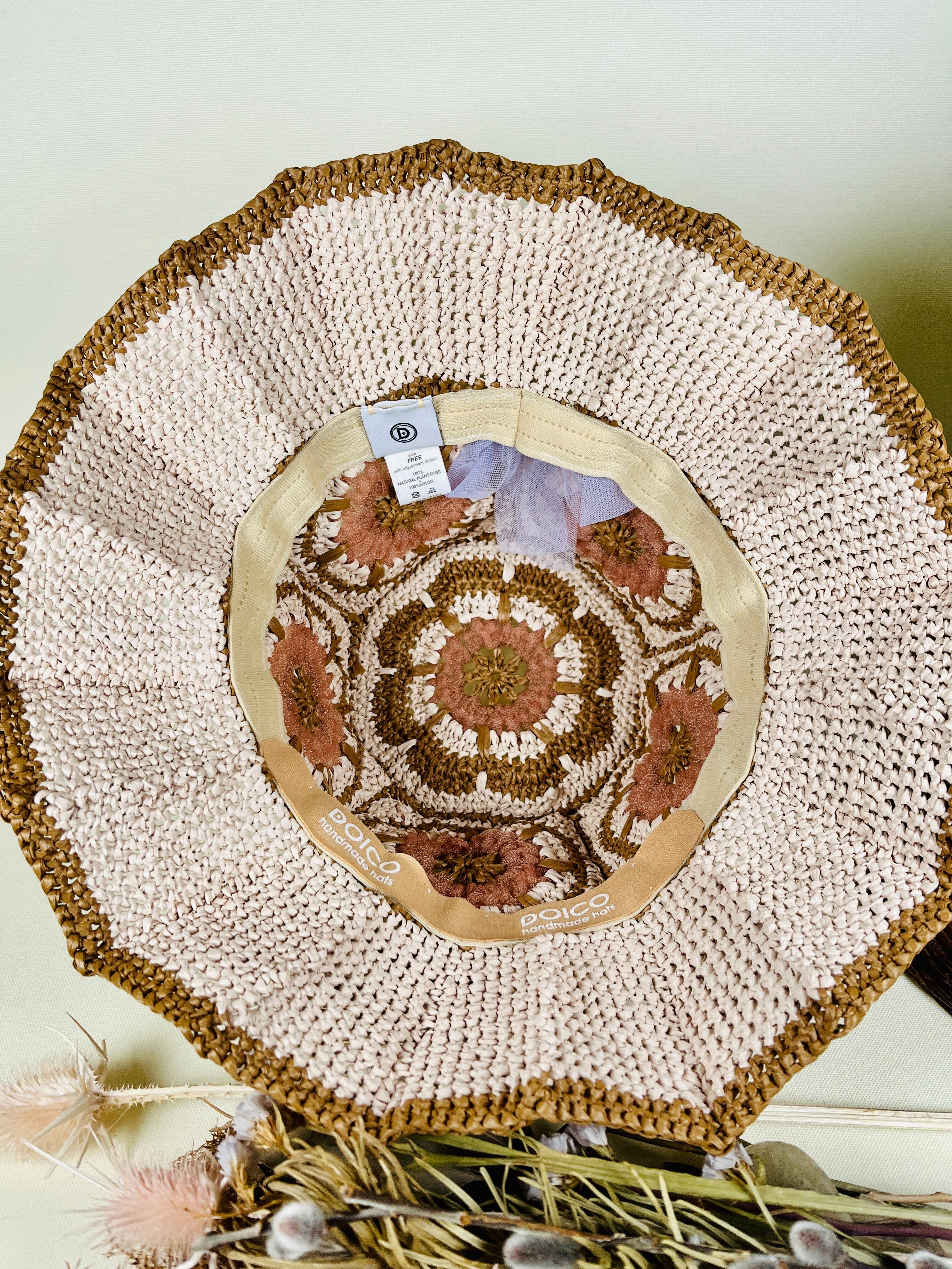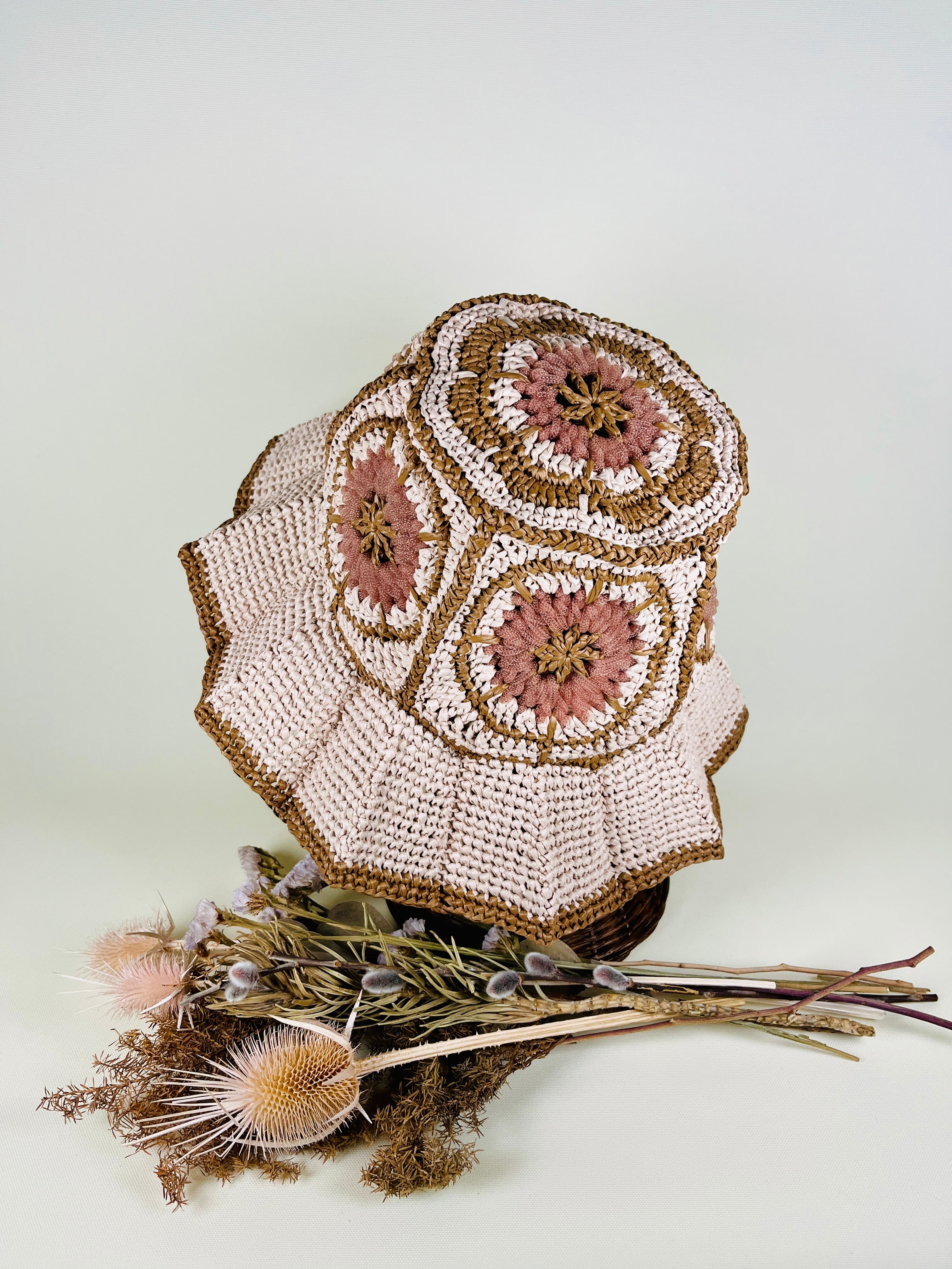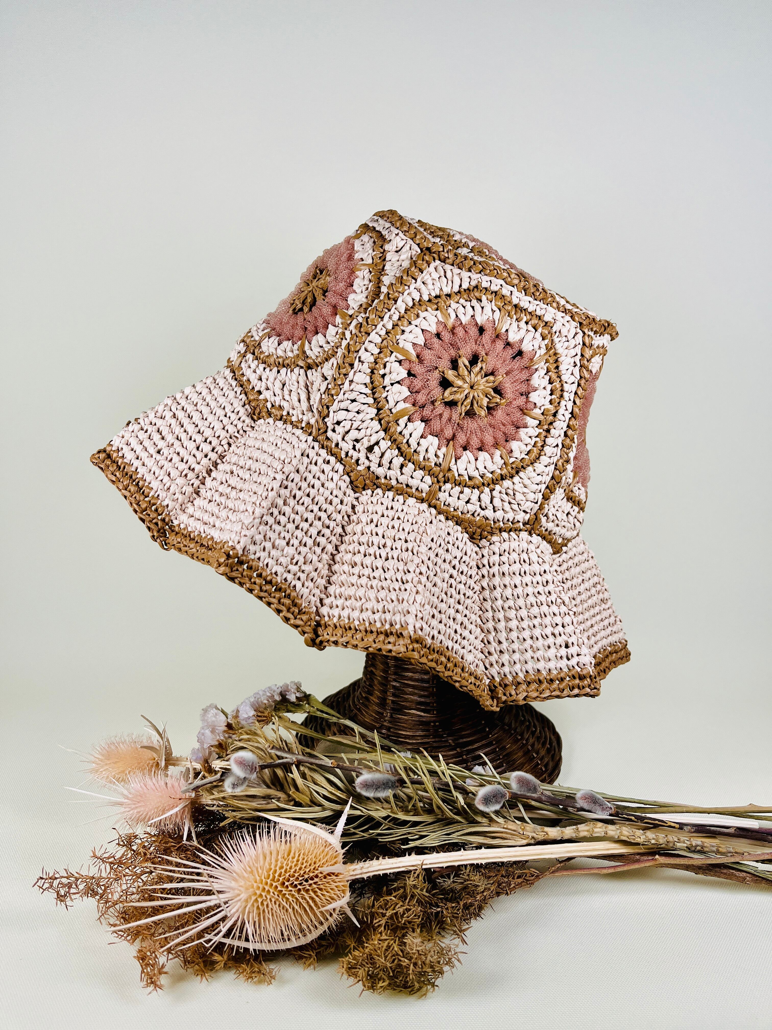 未来的なチューブ状のナイロン糸を伝統的なアフリカンモチーフにアクセントとして加えたら…という発想で出来ました。全体的にはコットンリンター(綿の種)由来の再生繊維で調和をとりました。ギザギザプリーツのブリムもオリエンタルなムードがあります。