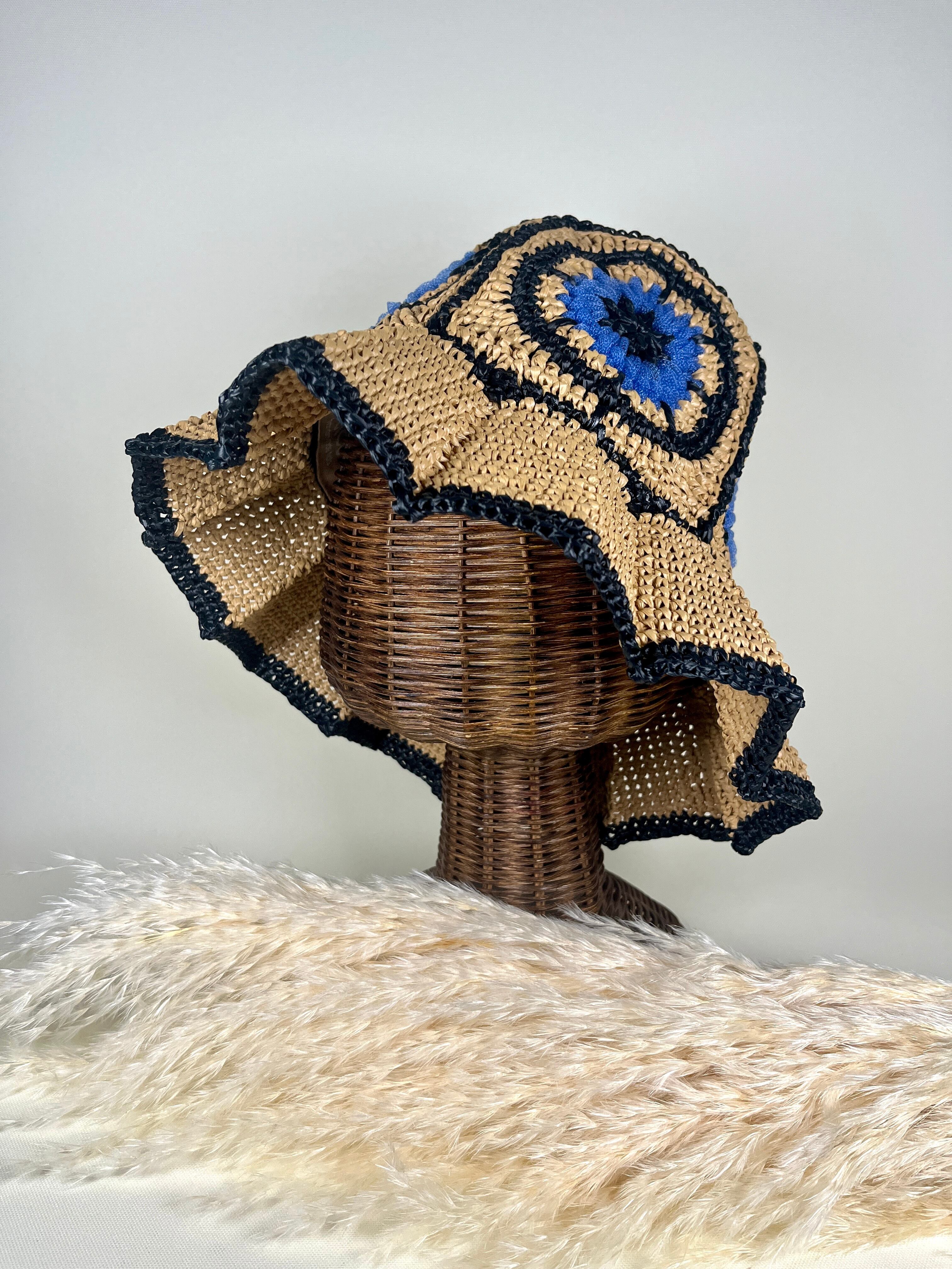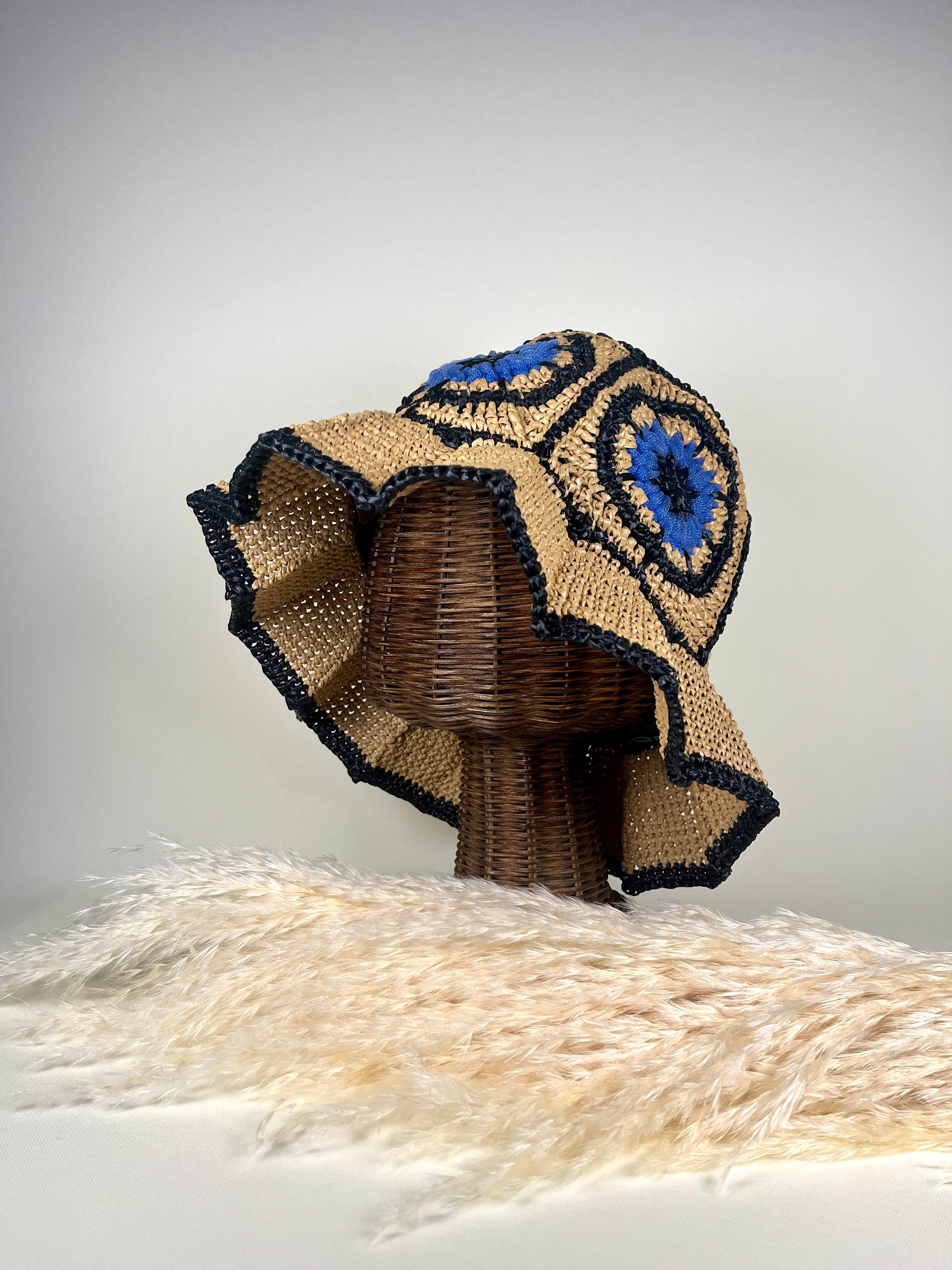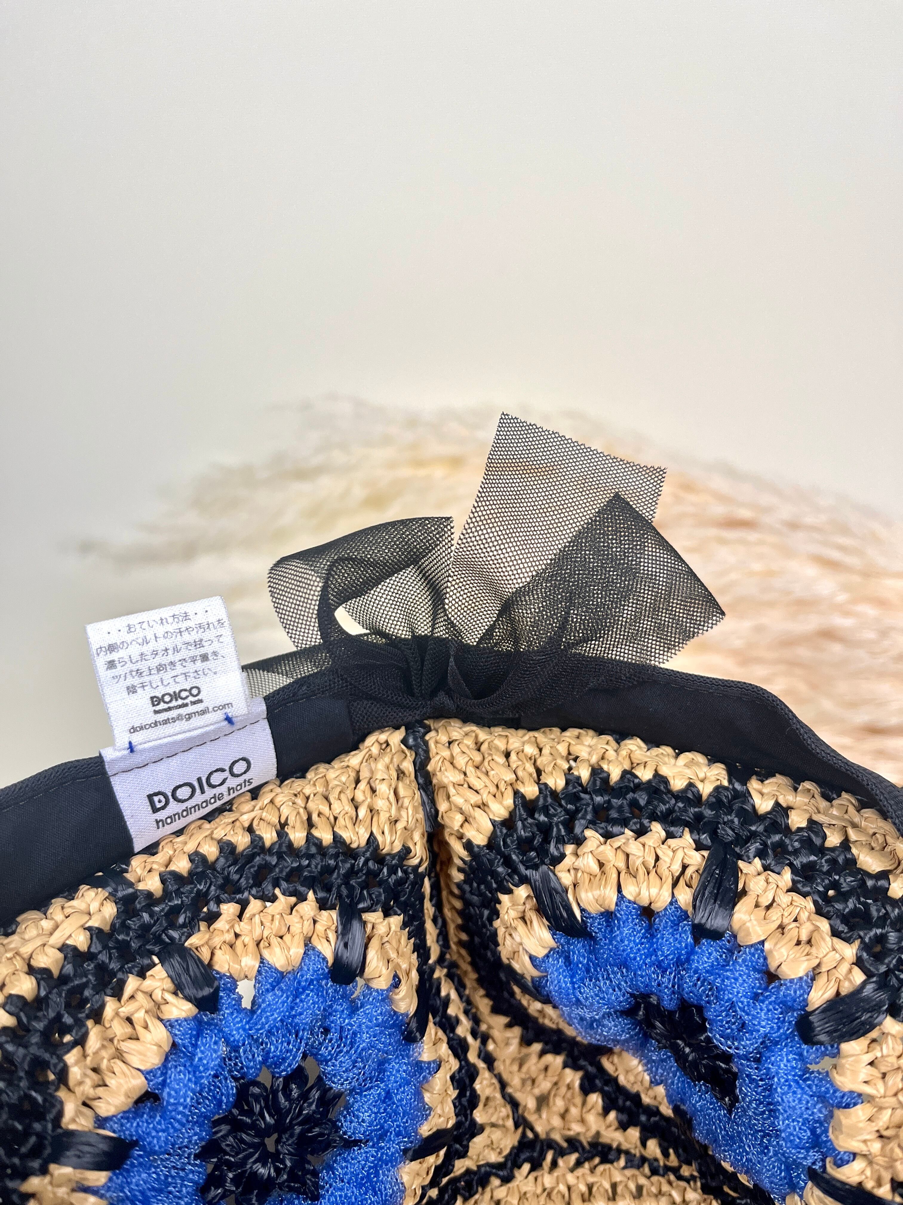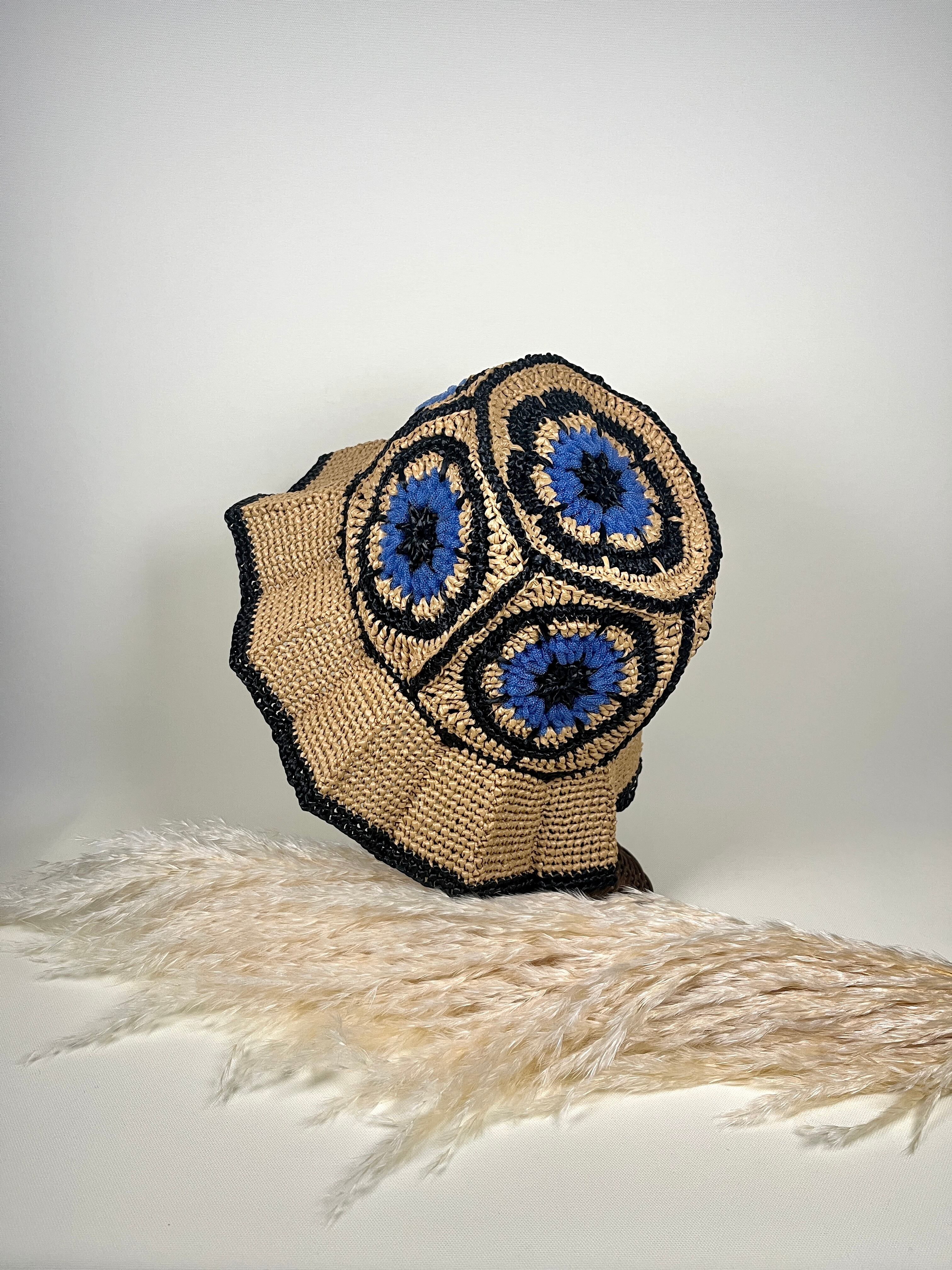 DARUMA @yokota_co_ltdさんの未来的なチューブ状のナイロン糸を伝統的なアフリカンモチーフにアクセントとして加えたら…という発想で出来ました。全体的には再生繊維のコットンラフィア®︎ @cottonraffiaさんで調和をとりました。ギザギザプリーツのブリムもオリエンタルなムードがあります。