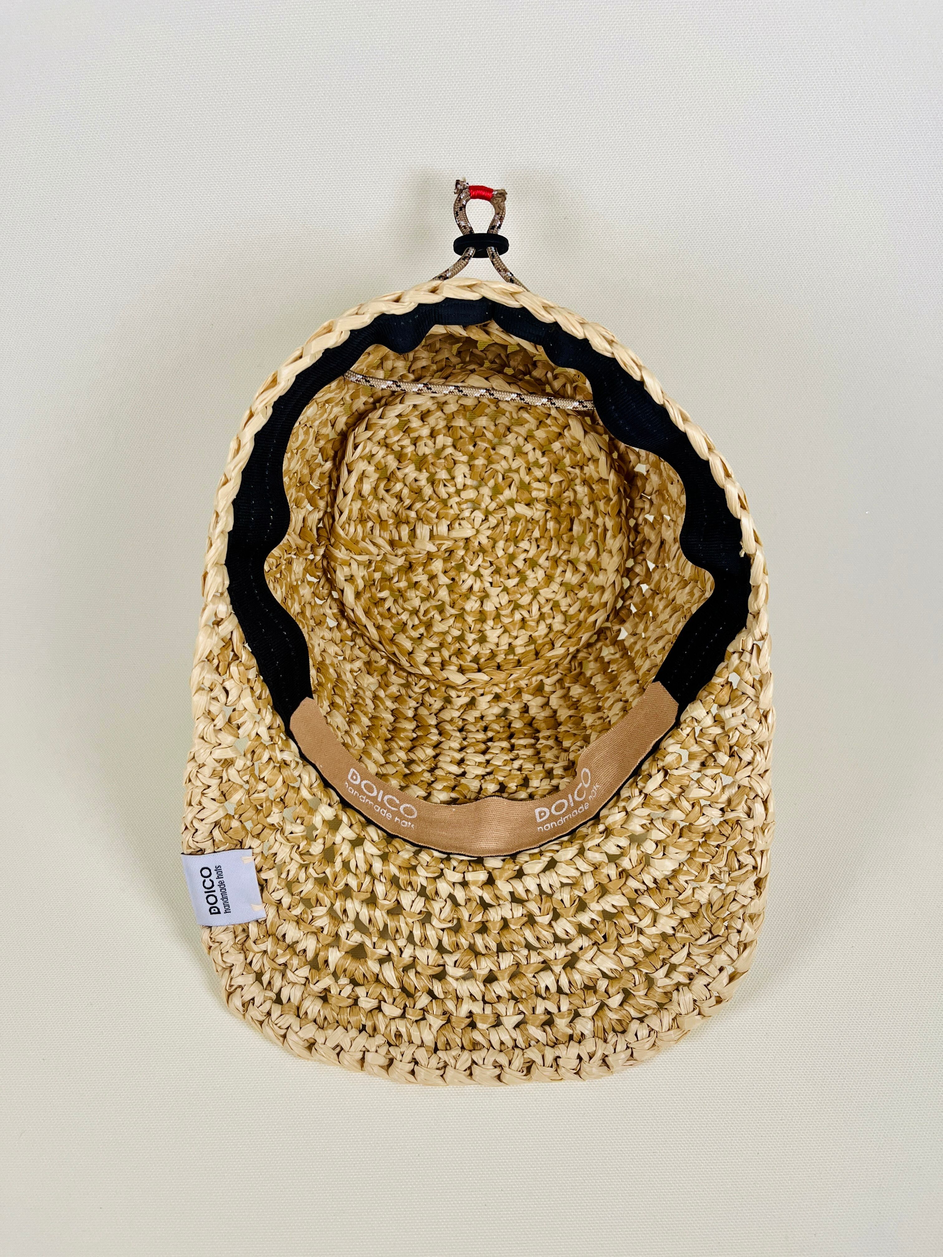 ハトメとパラコードでアウトドア感を演出してます。パラコードの端始末は炙ると固くて刺さるので刺繍糸で巻きました。