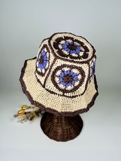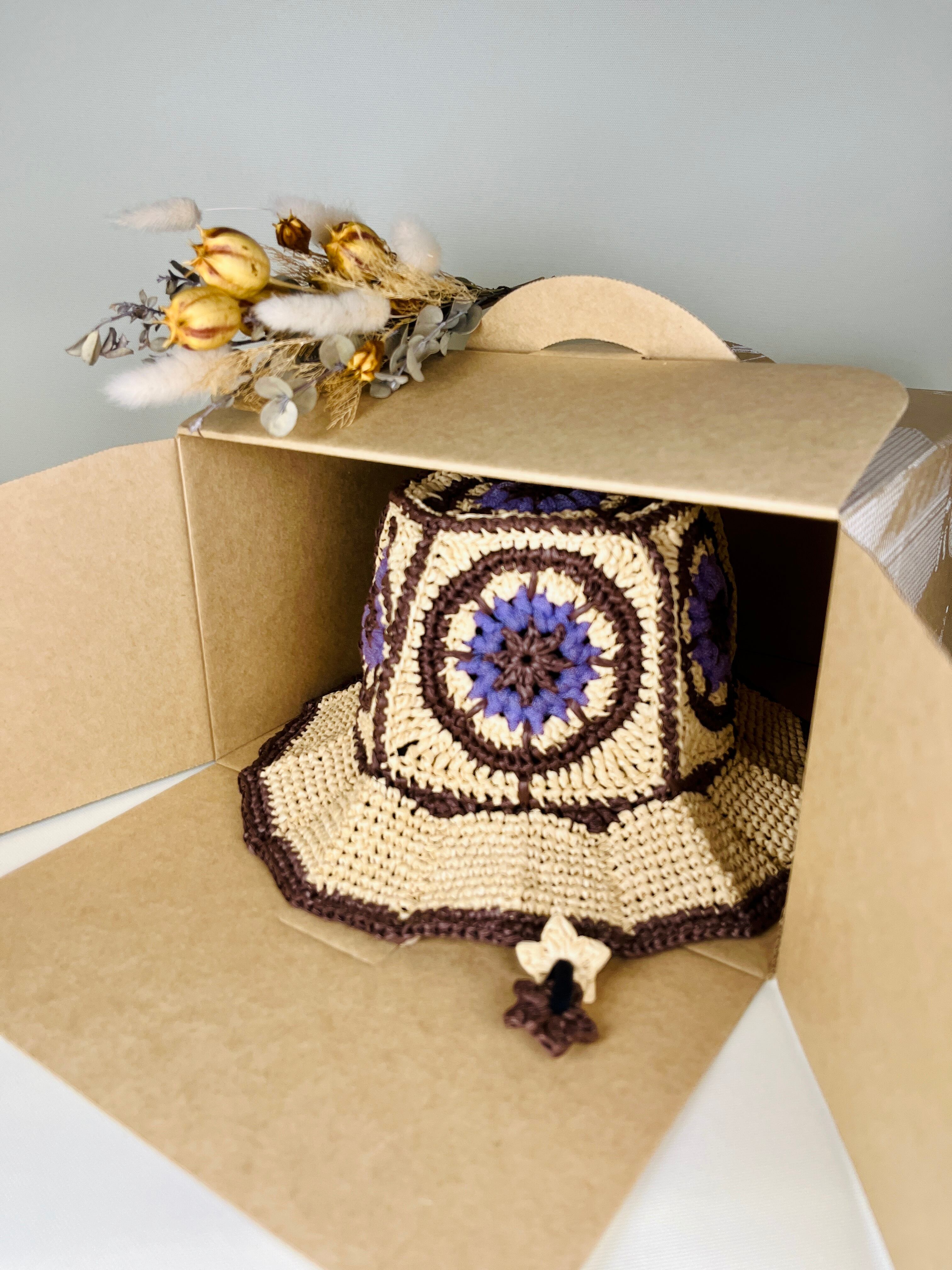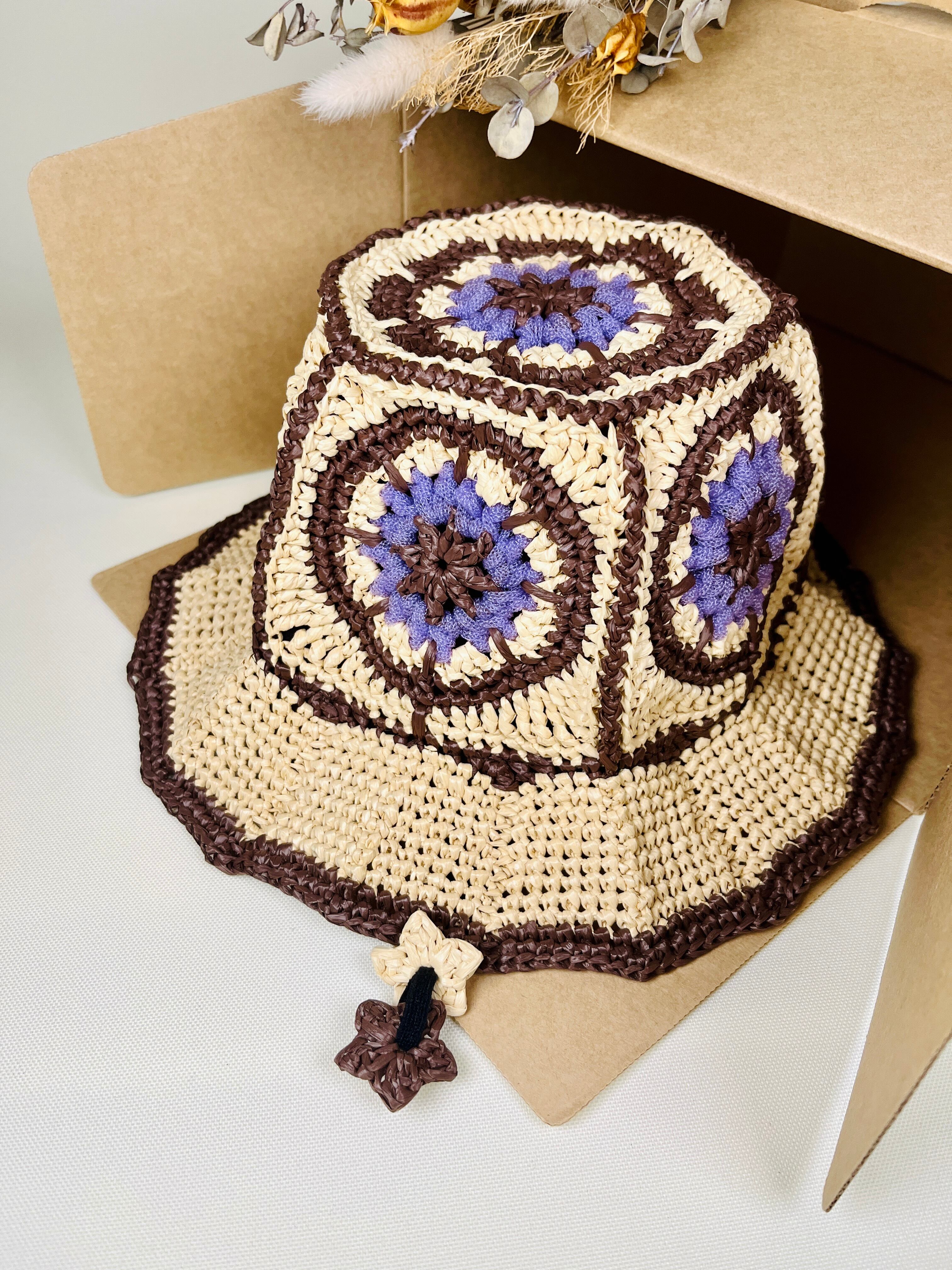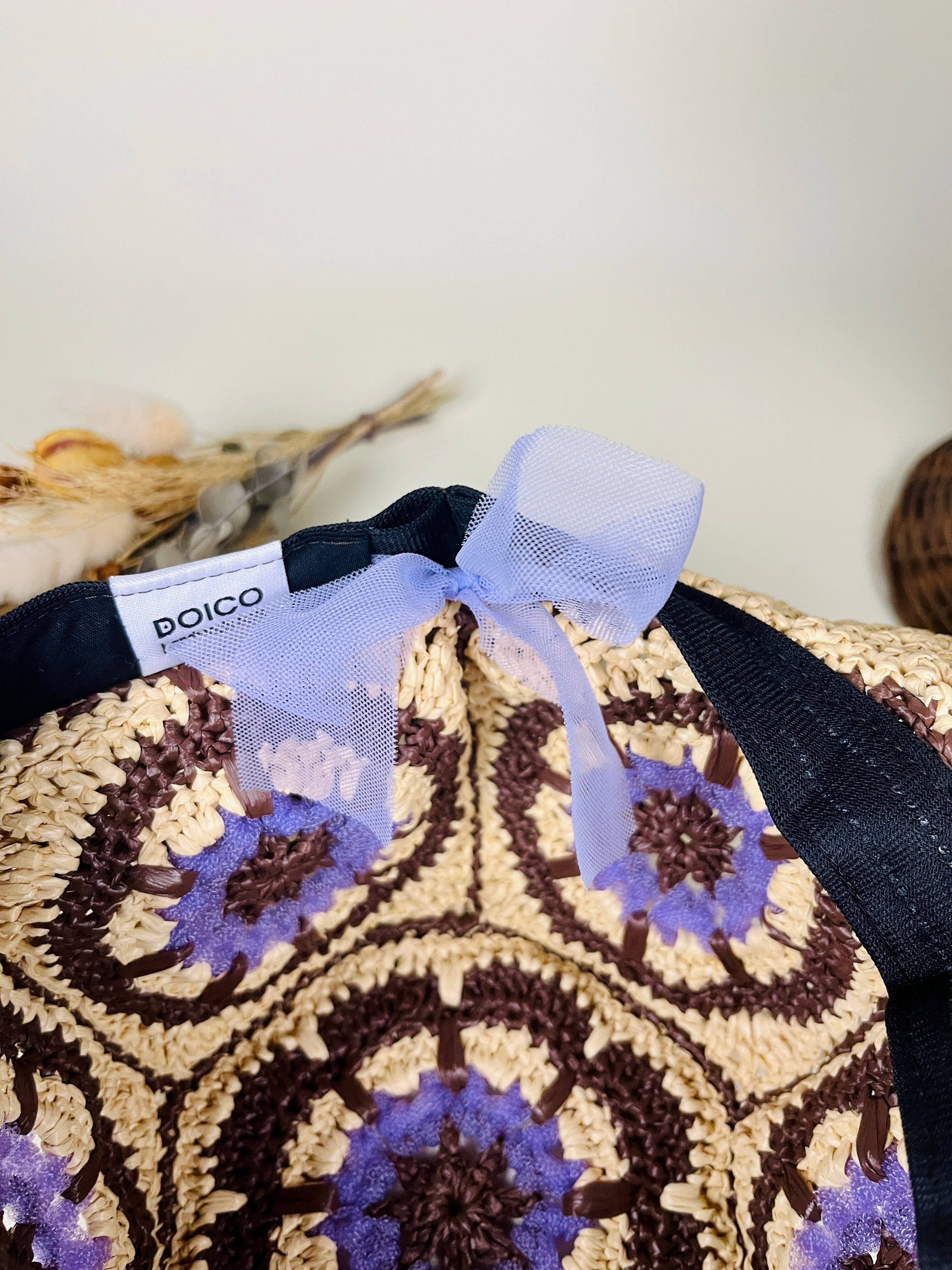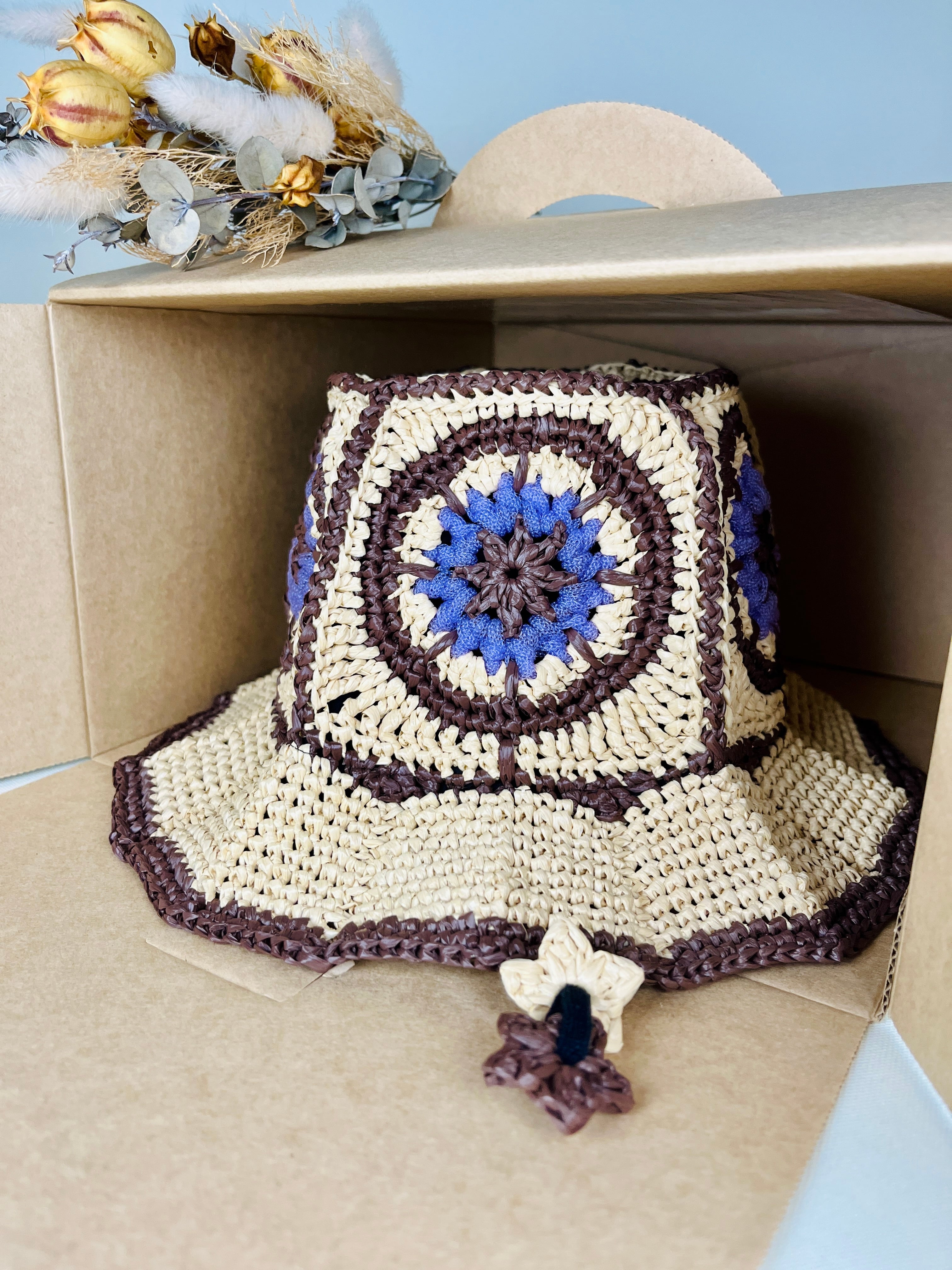 未来的なチューブ状のナイロン糸を伝統的なアフリカンモチーフにアクセントとして加えたら…という発想で出来ました。全体的にはコットンリンターの再生繊維で調和をとりました。ギザギザプリーツのブリムもオリエンタルなムードがあります。