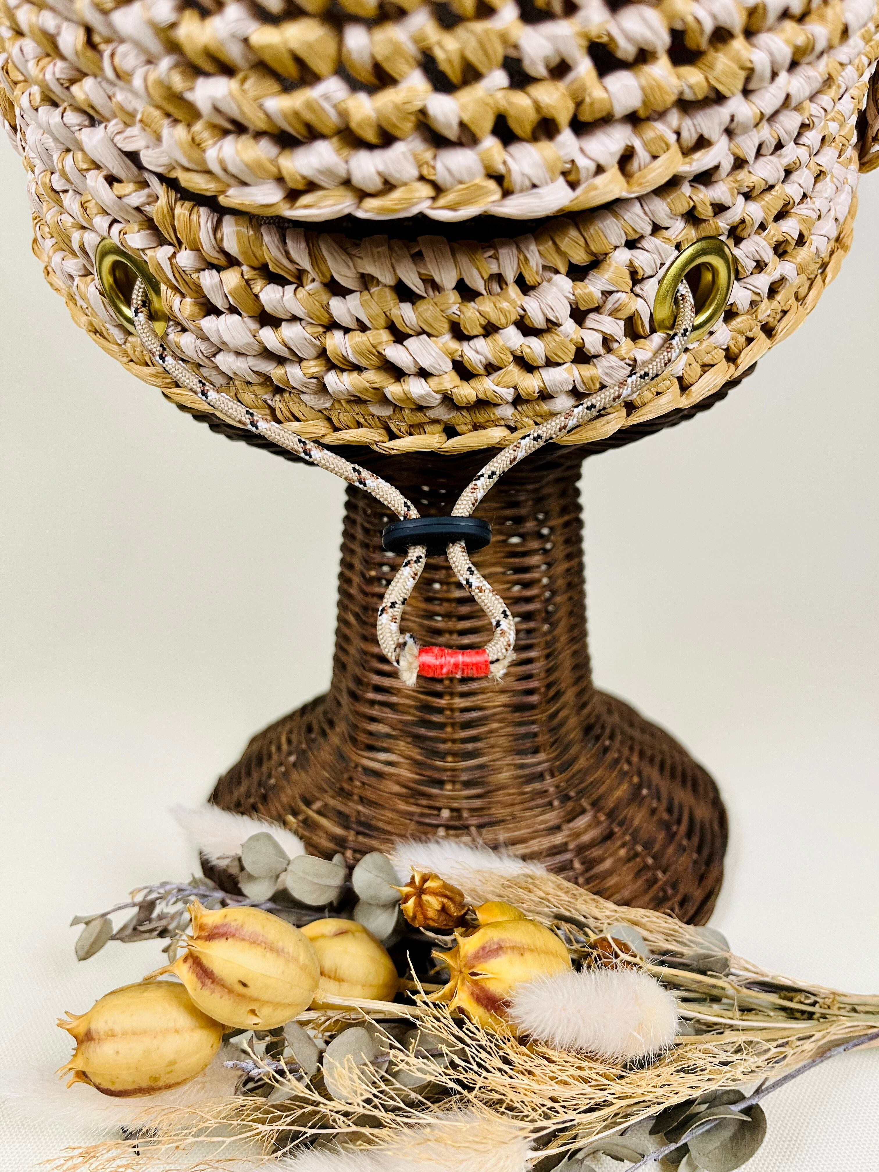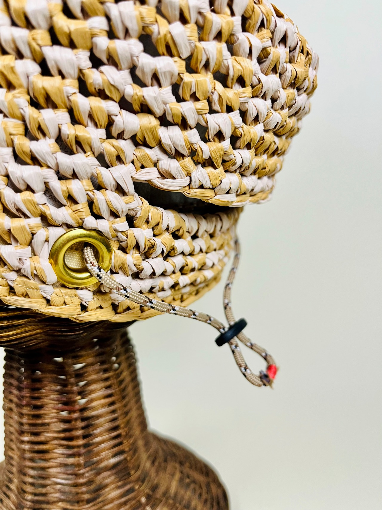 ハトメとパラコードでアウトドア感を演出してますパラコードの端始末は炙ると固くて刺さるので刺繍糸で巻きました。