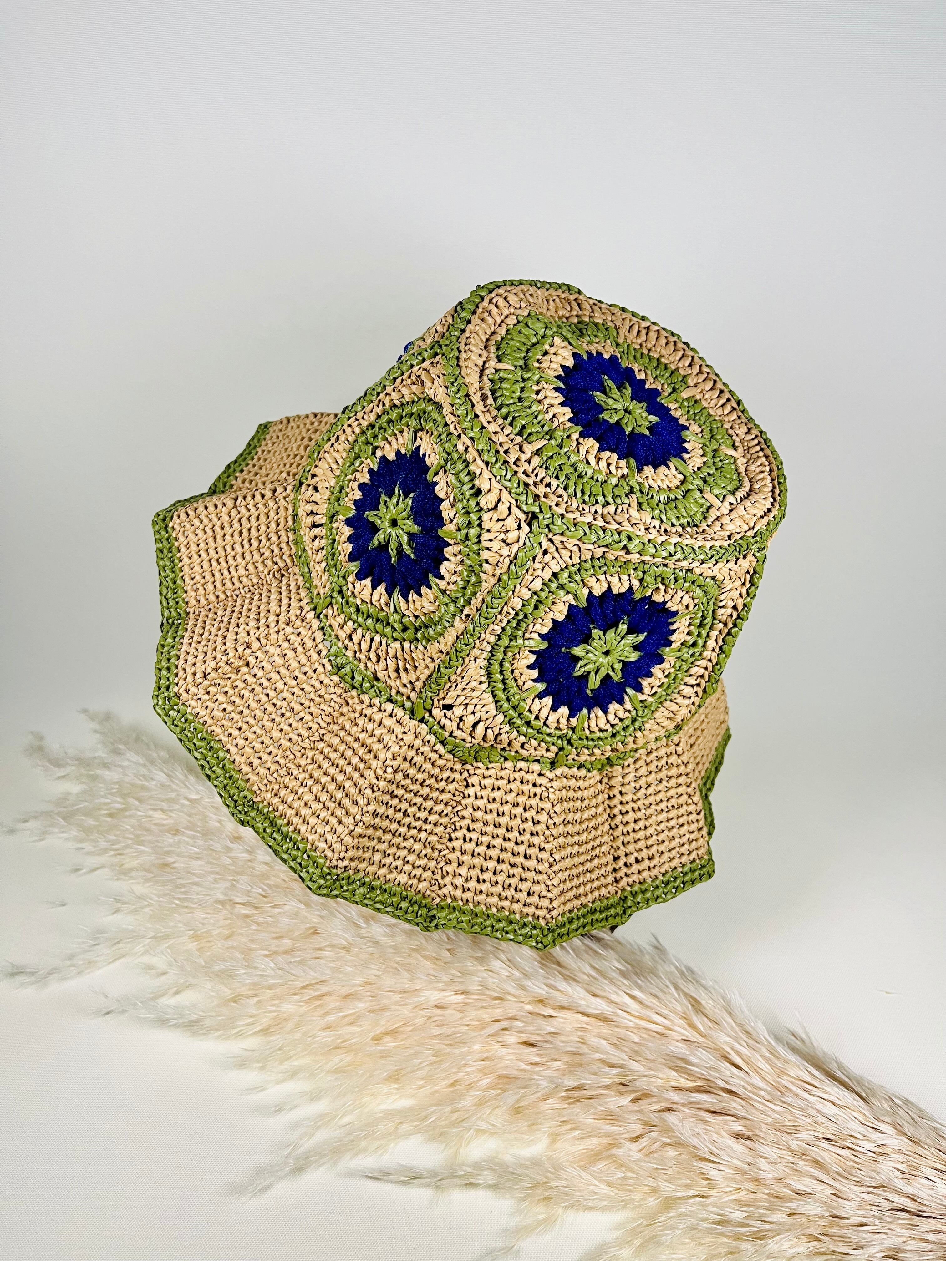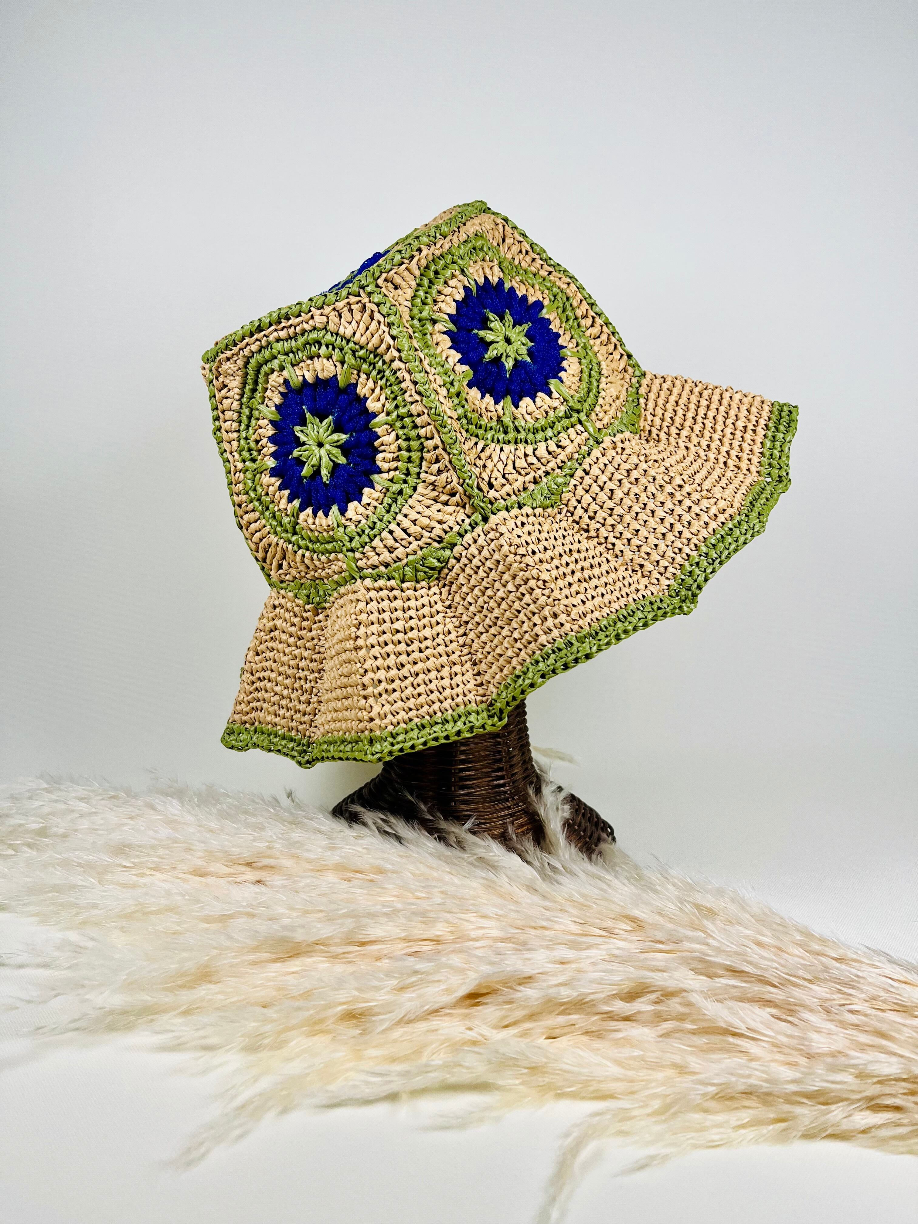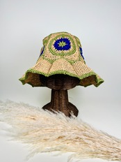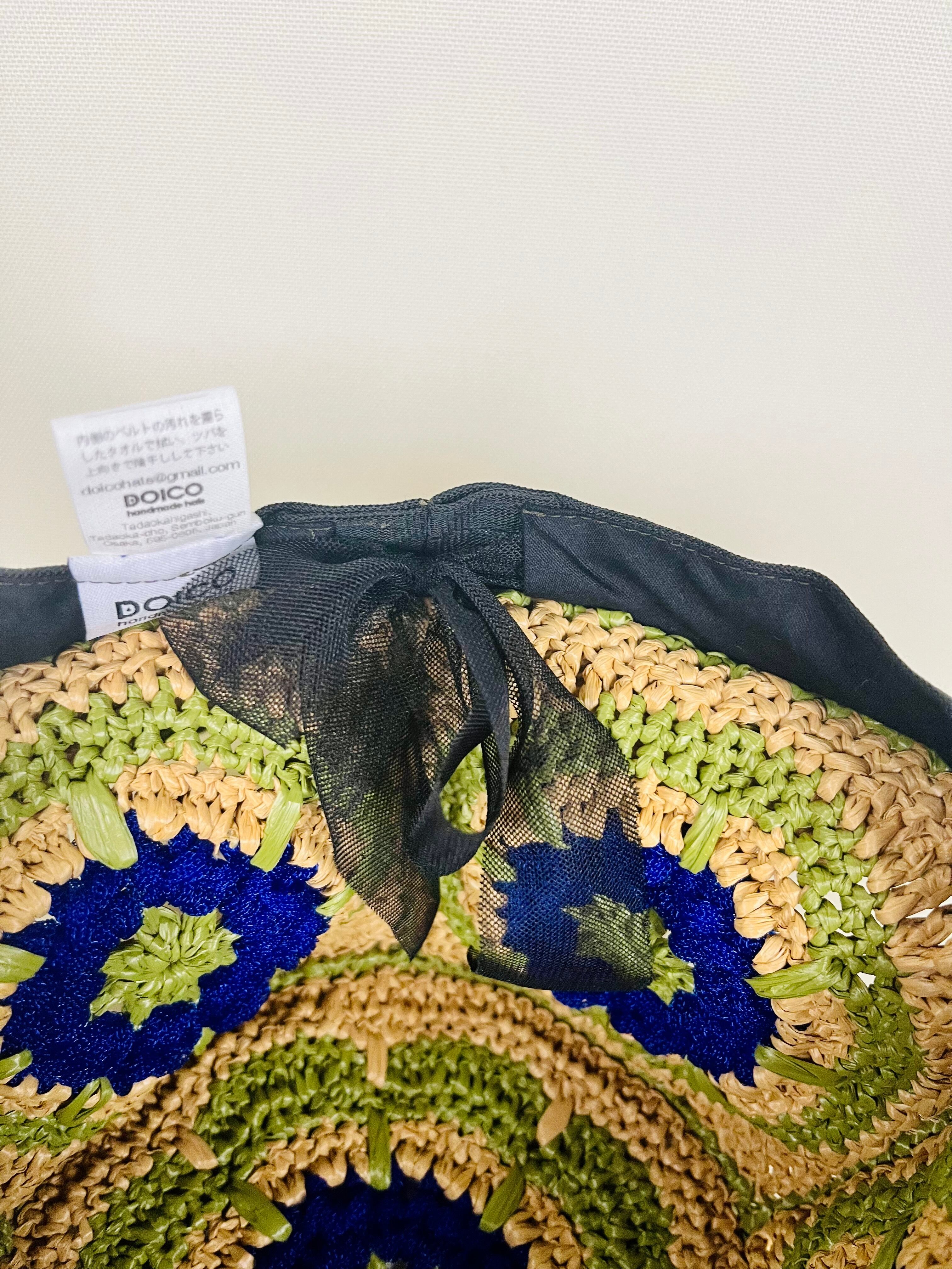 伝統的なアフリカンモチーフに未来的なチューブ状のナイロン糸をアクセントとして加えたら…という発想で出来ました。全体的にはコットンリンターの再生繊維で調和をとっています。ギザギザプリーツのブリムもオリエンタルなムードがあります。