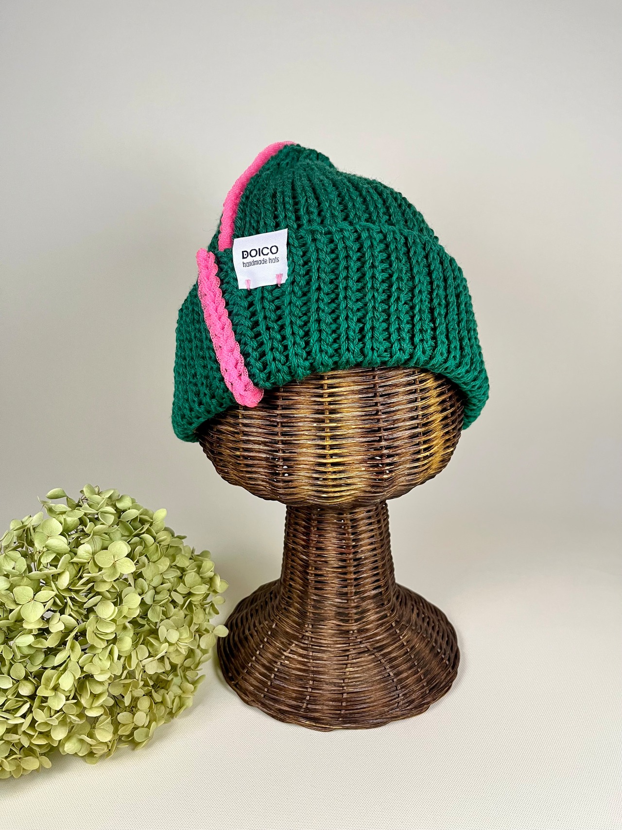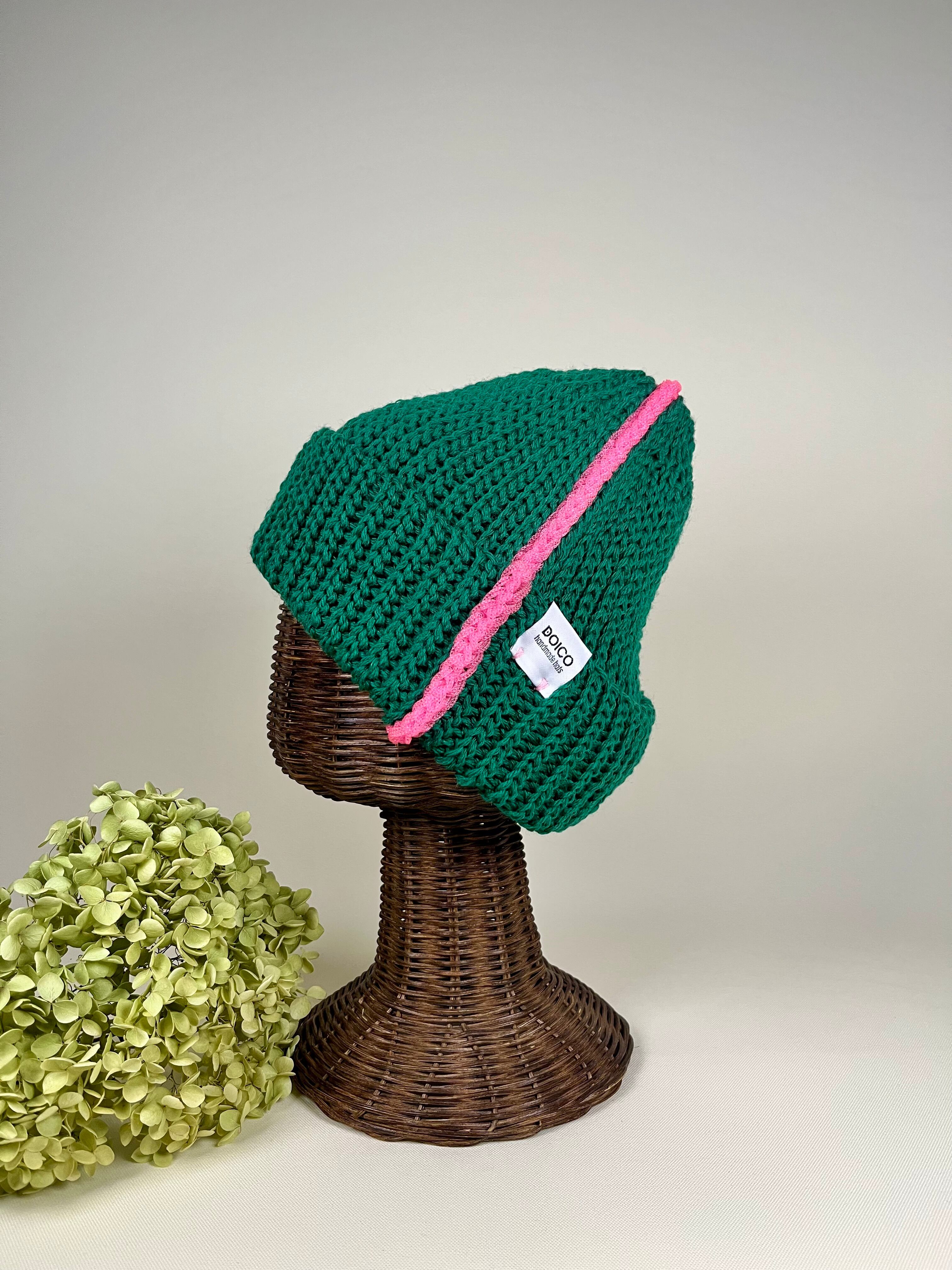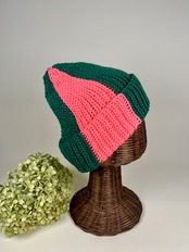 くつ下用の糸で手編みしたビーニー帽