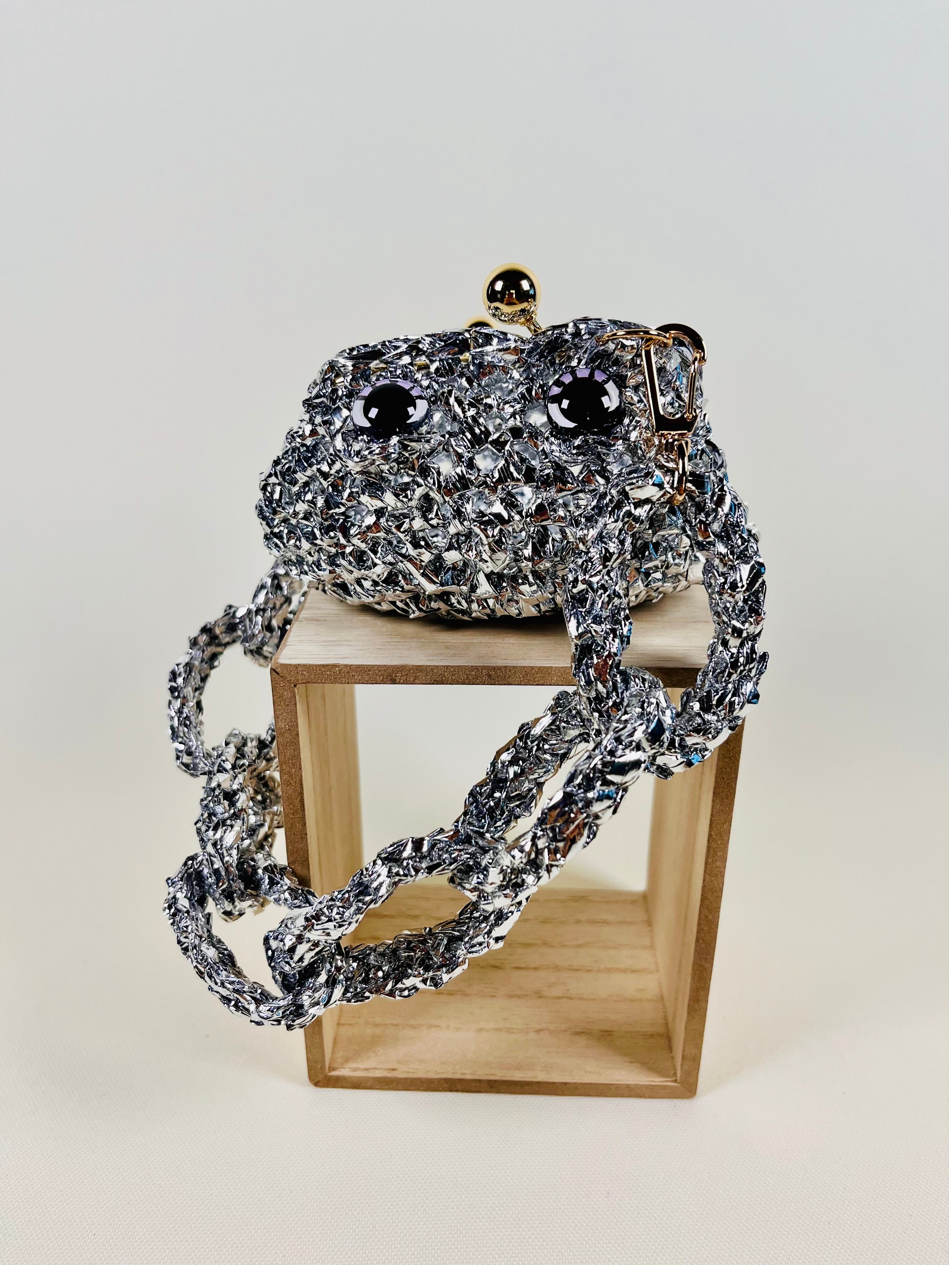 まるで金属のようにキラッキラに輝くテープヤーンでミニがま口をつくりました。メカみたいな重厚感ですが驚くほど軽やかです。ユーモアで60年代の漫画風な目を描いてみました⭐︎