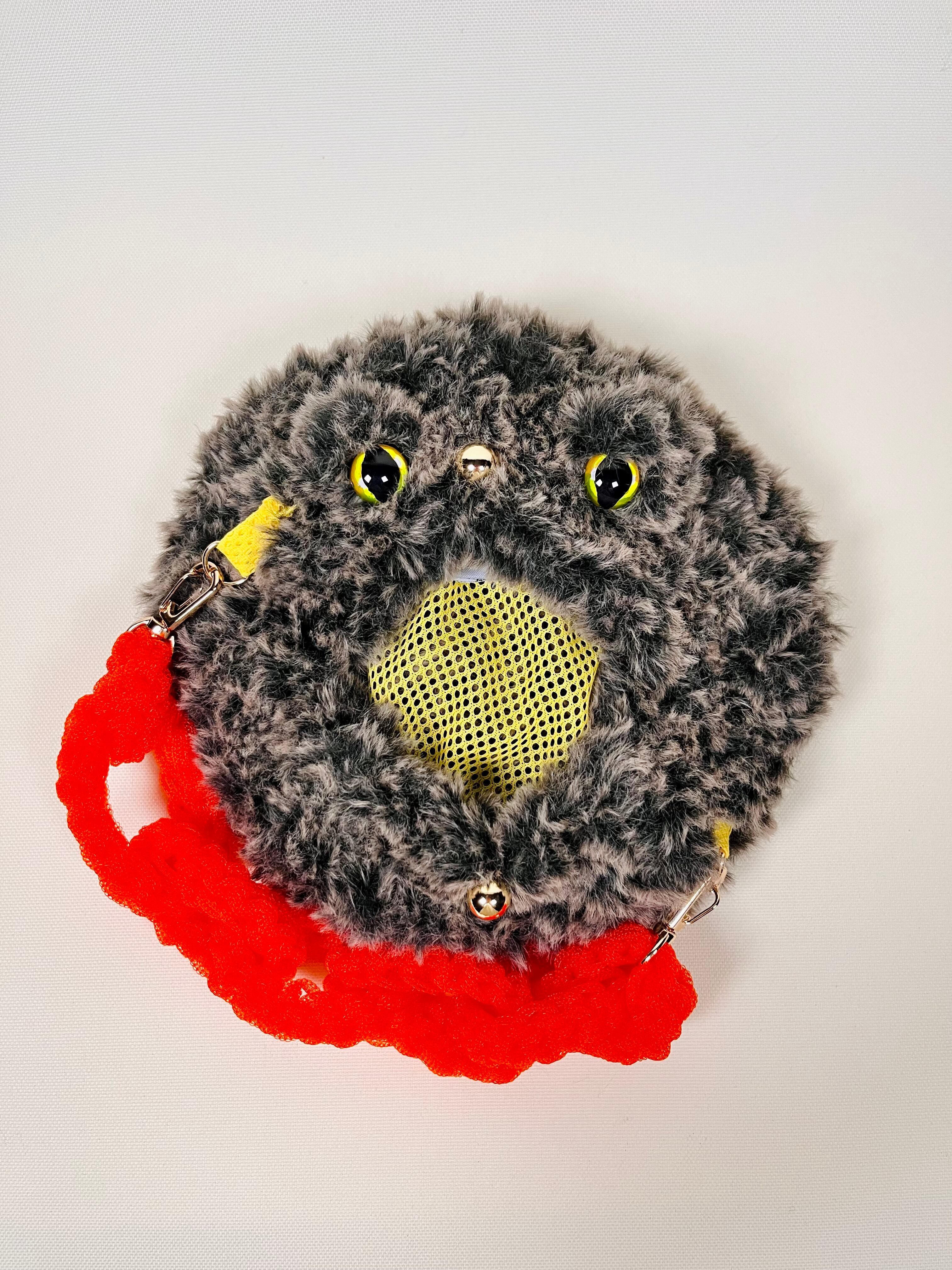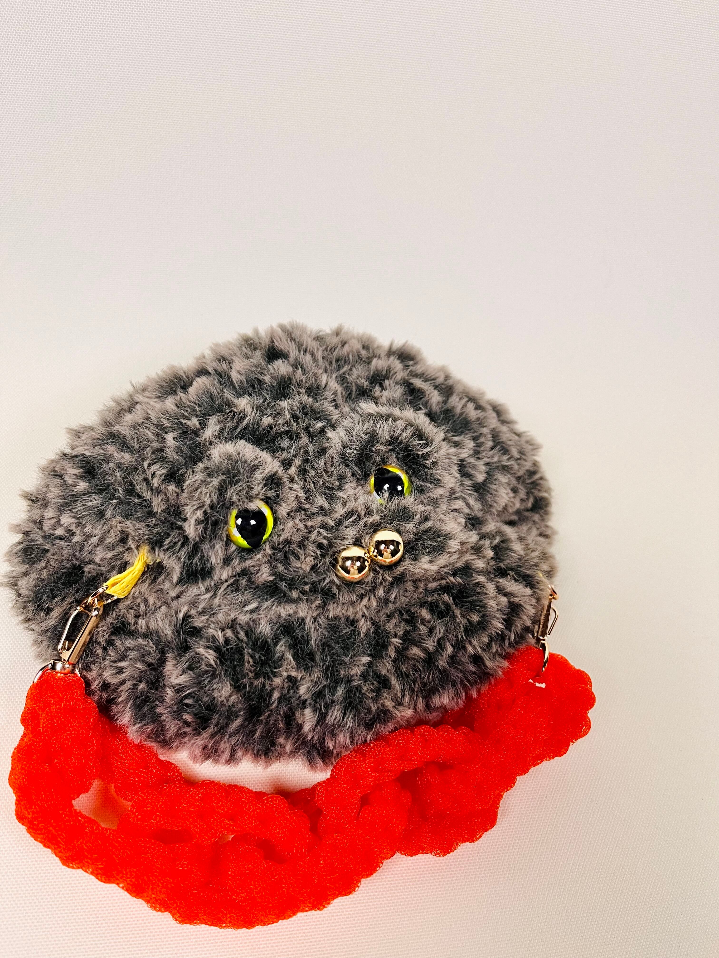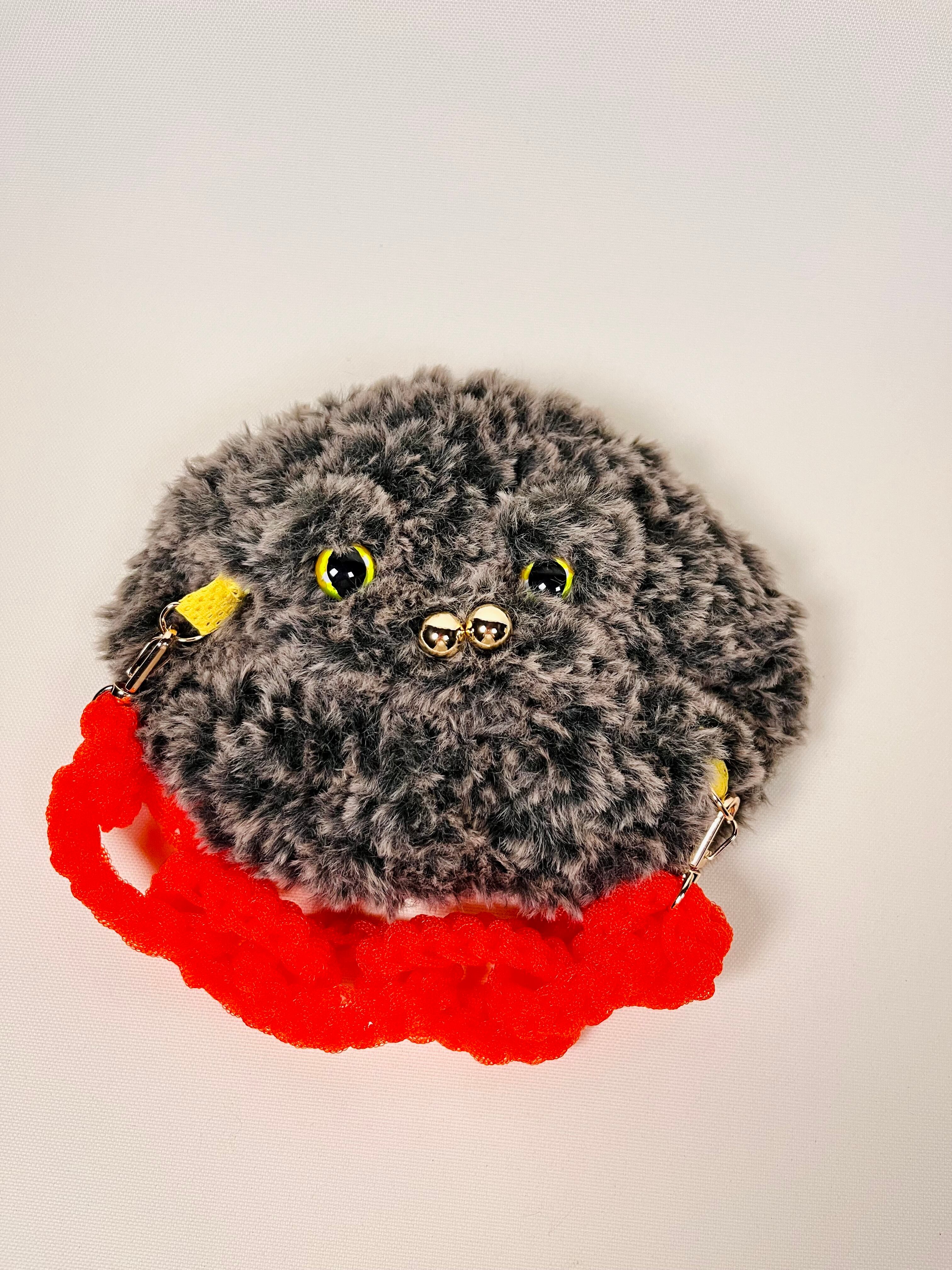 エコファーのがまぐちポーチ。ファーカラーは猫ちゃんのイメージですが形は想像上の“ゴジ◯”っぽい動物です