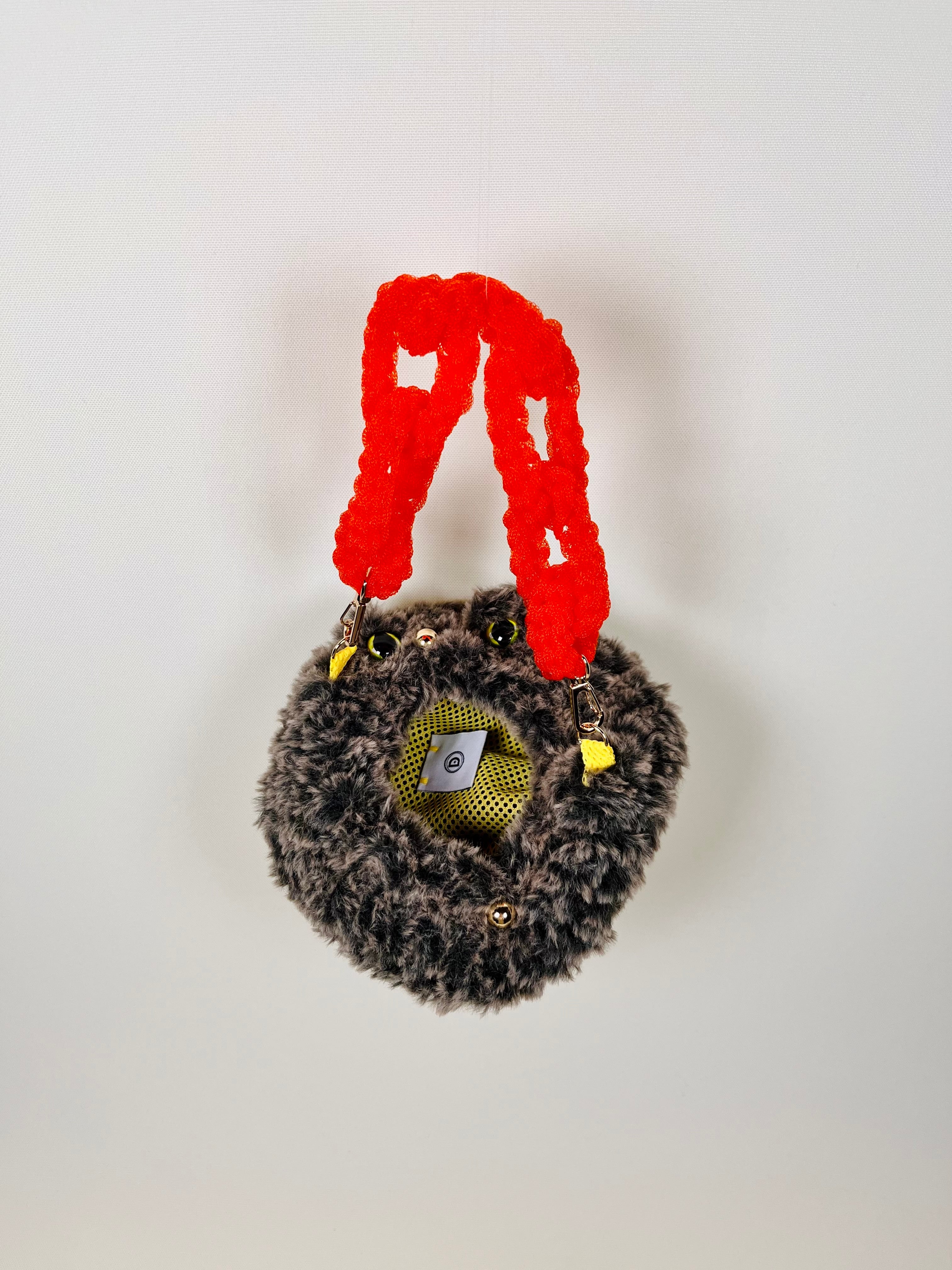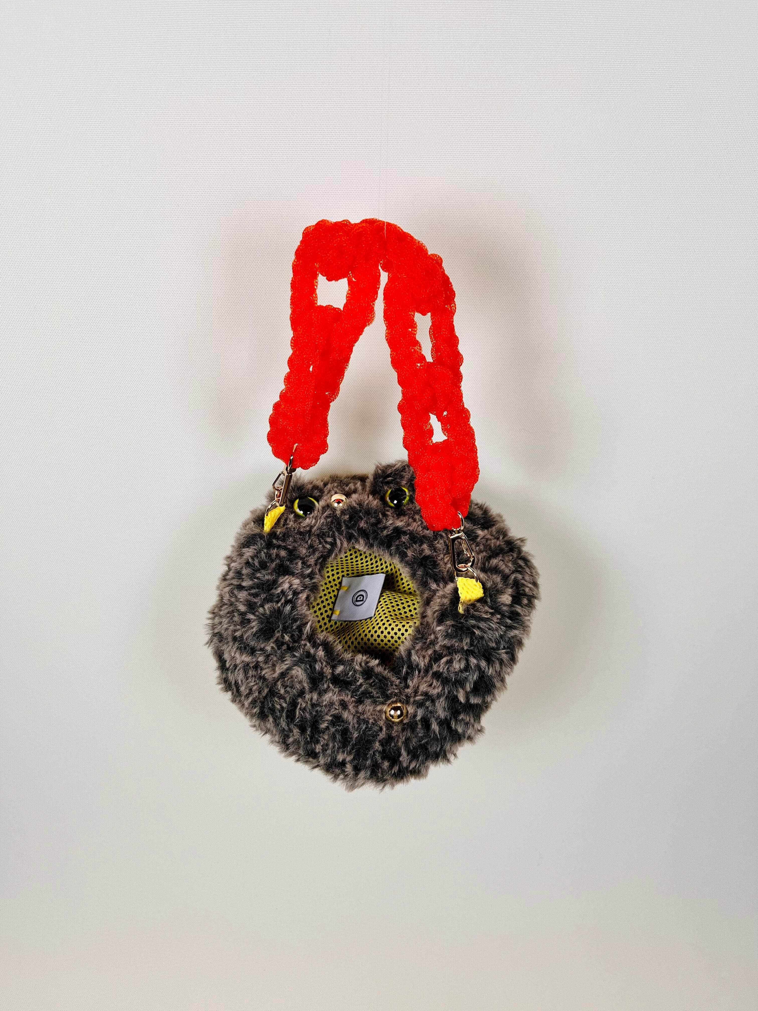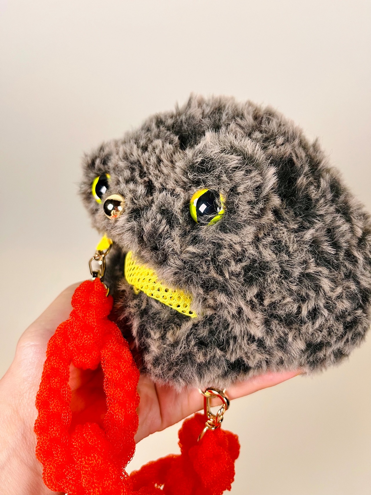 エコファーのがまぐちポーチ。ファーカラーは猫ちゃんのイメージですが形は想像上の“ゴジ◯”っぽい動物です