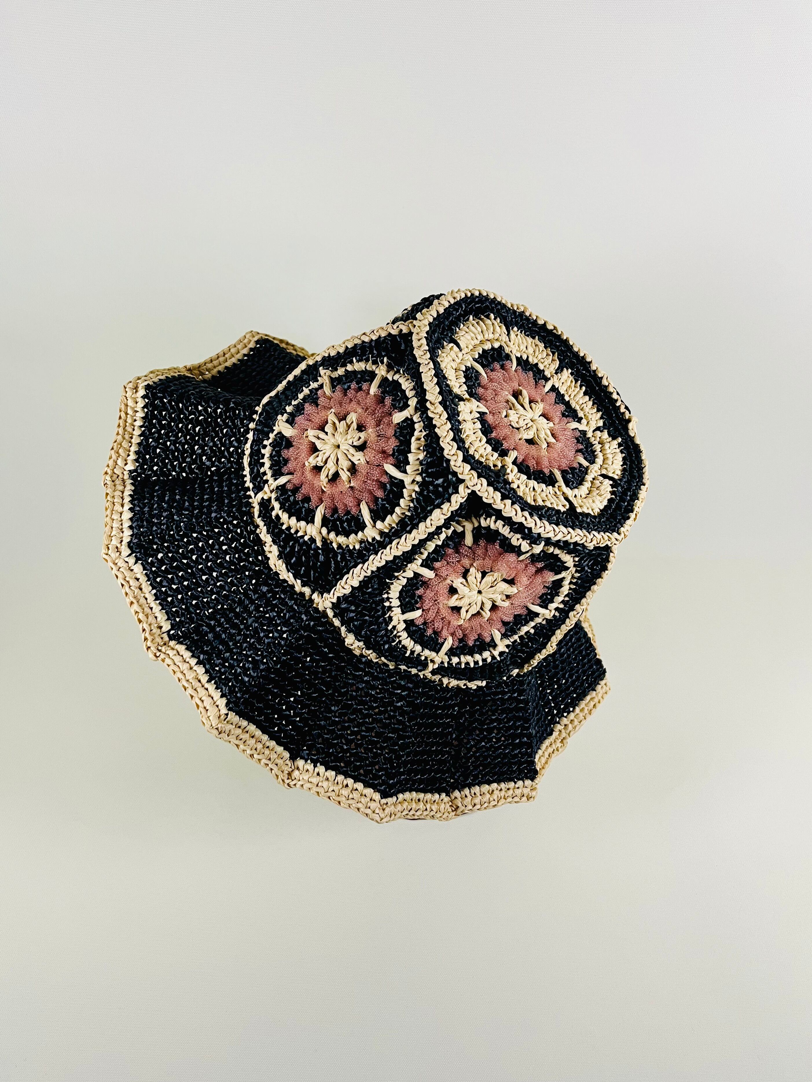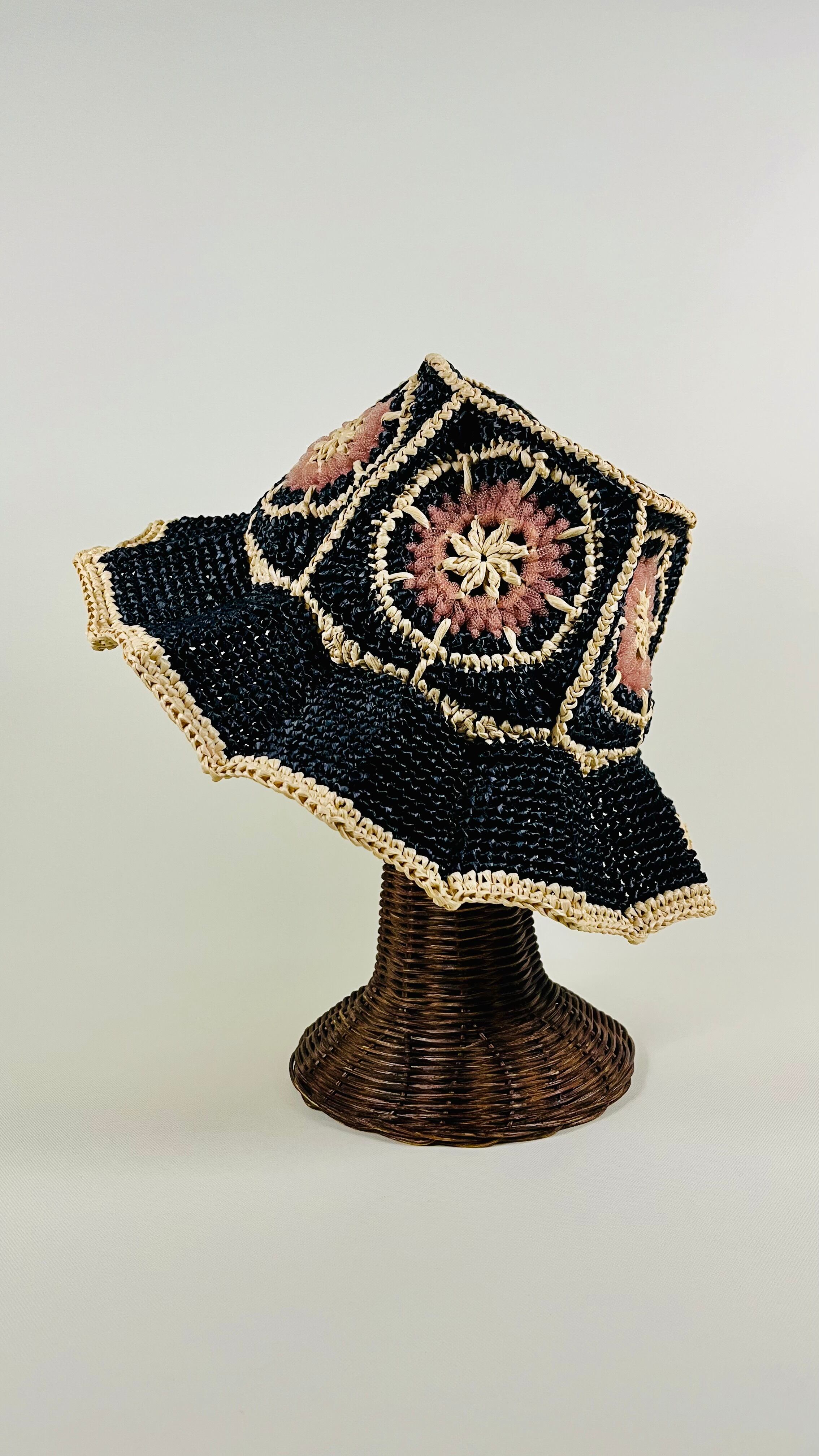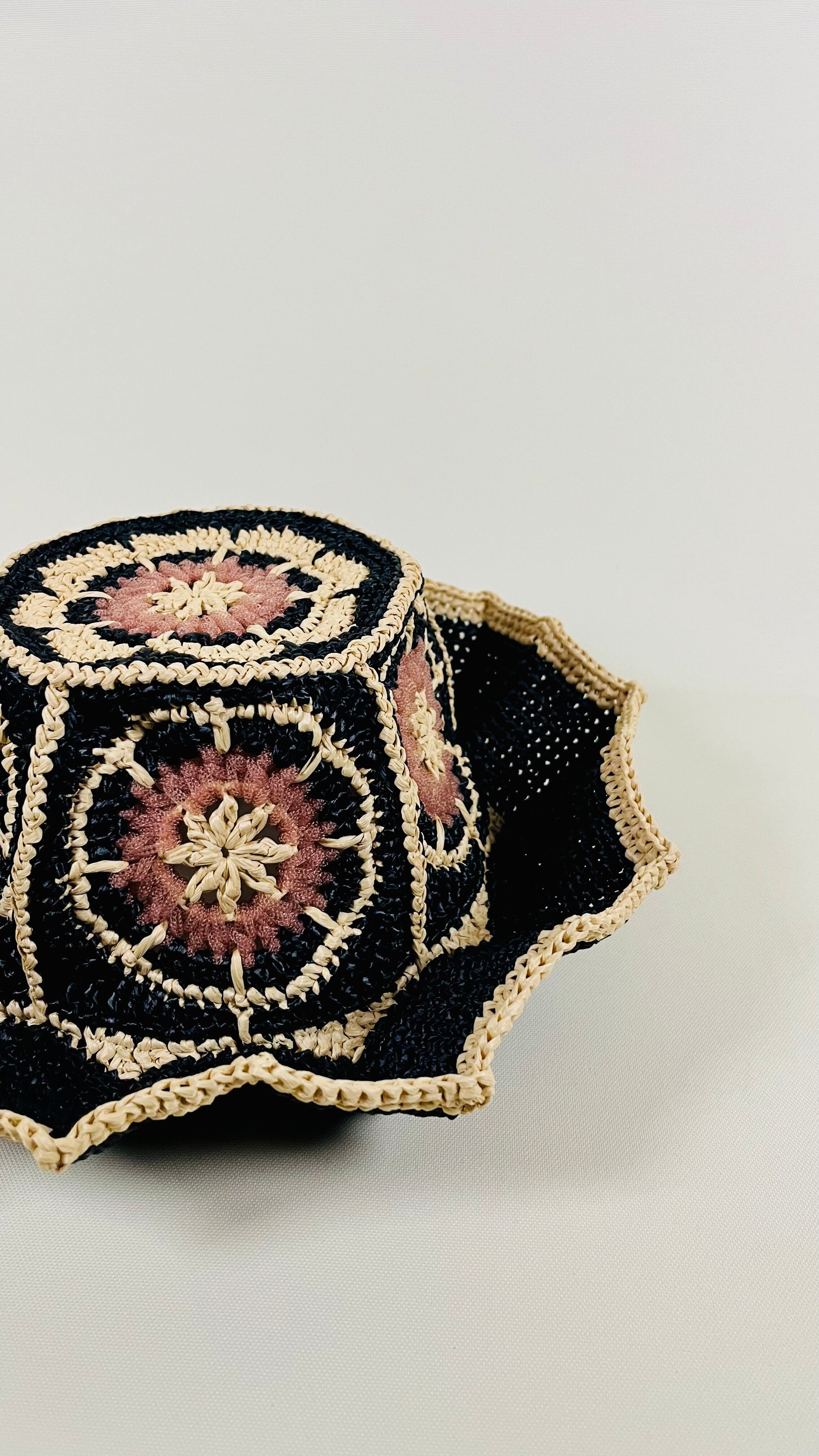 伝統的なアフリカンモチーフに未来的なチューブ状のナイロン糸をアクセントとして加えたら…という発想で出来ました。全体的にはコットンリンターの再生繊維で調和をとっています。ギザギザプリーツのブリムもオリエンタルなムードがあります。
