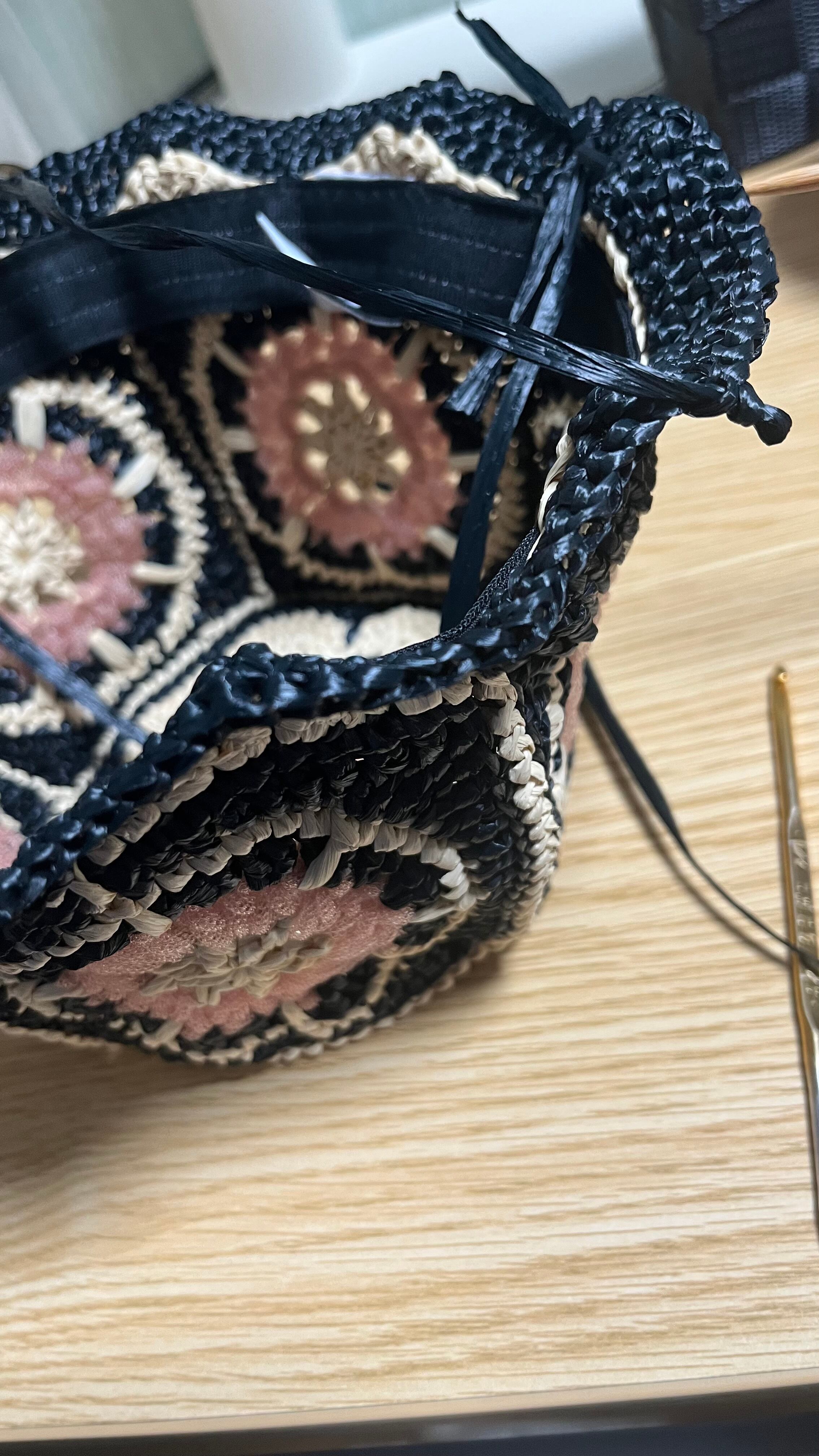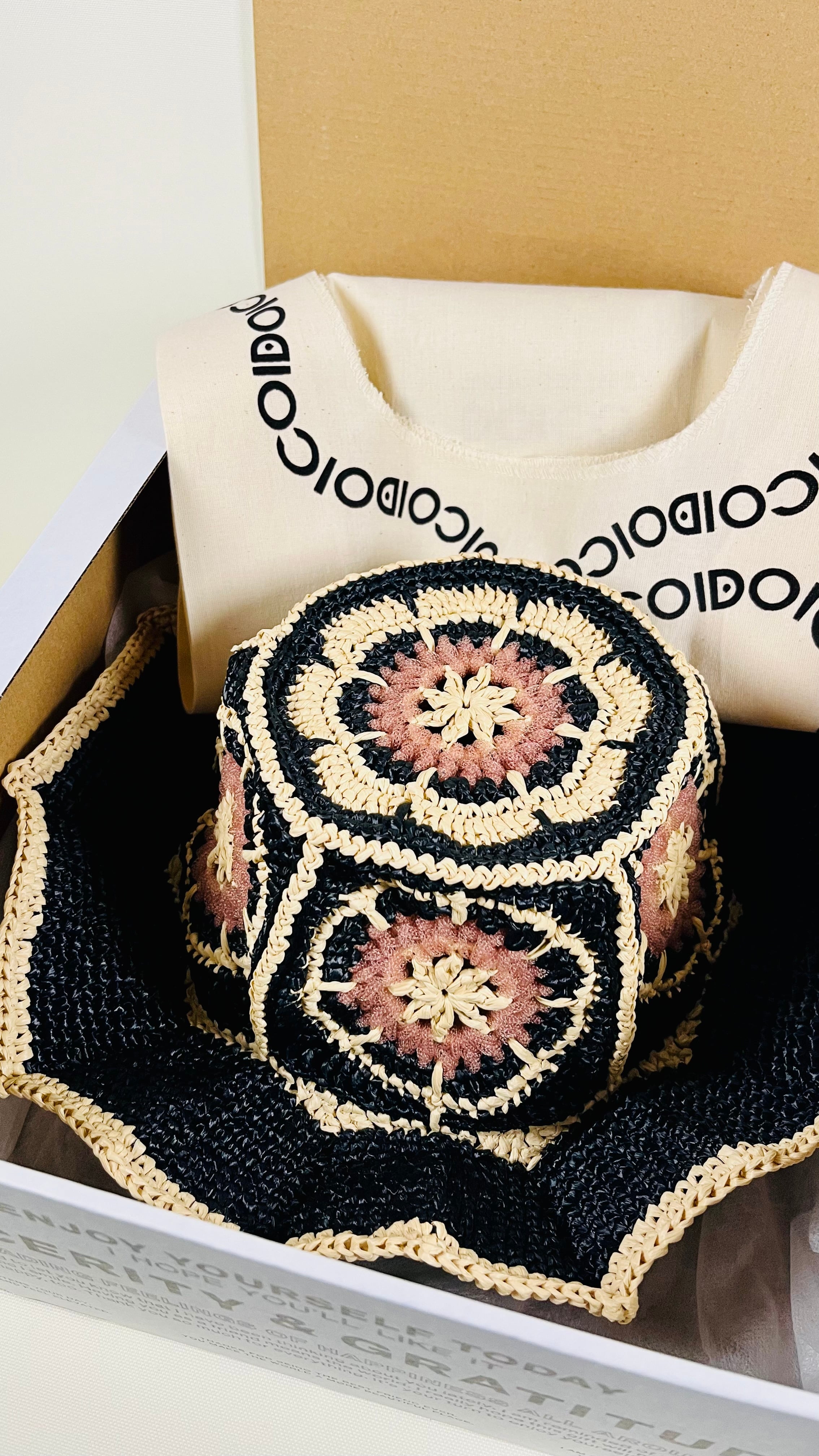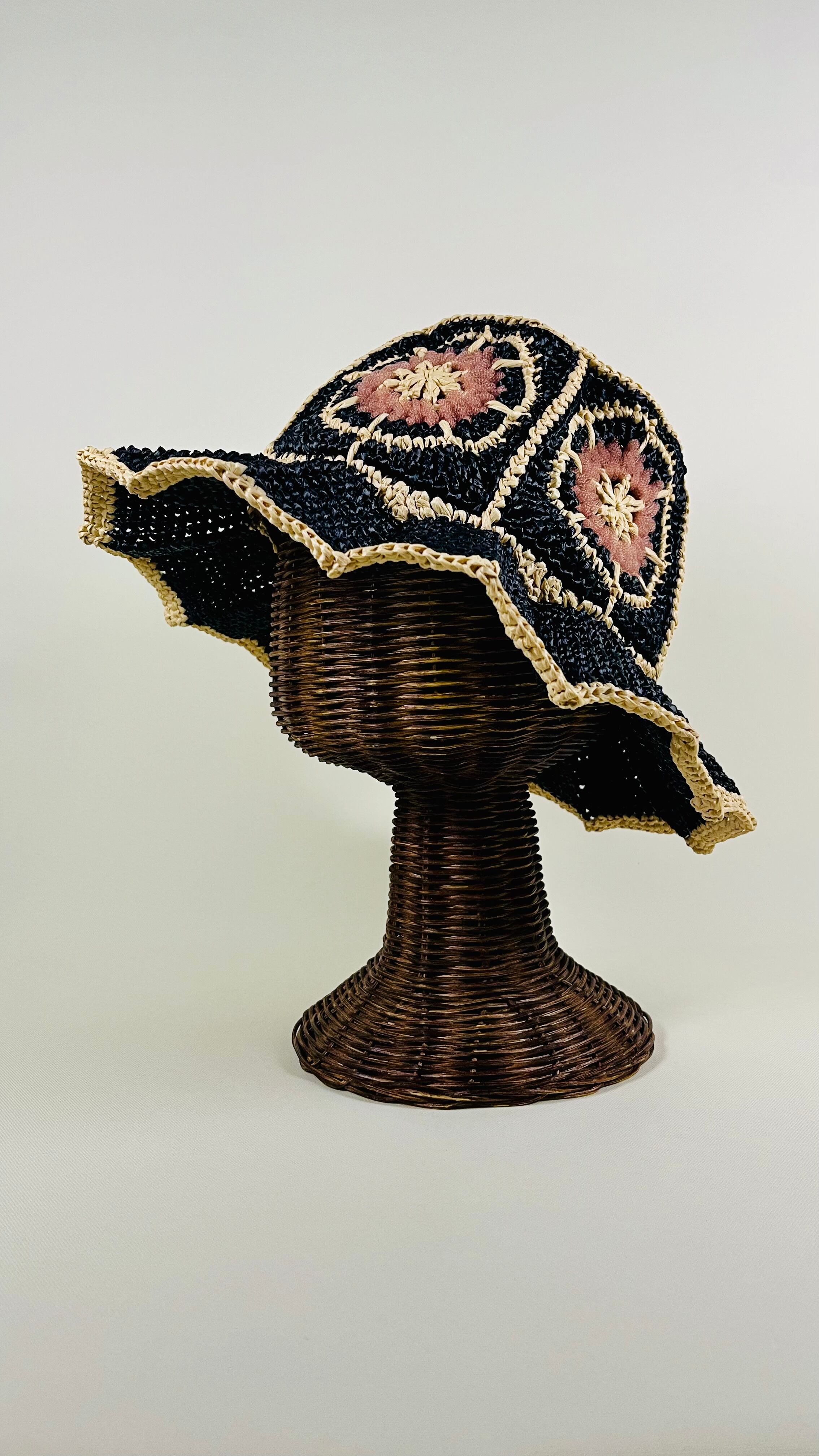 伝統的なアフリカンモチーフに未来的なチューブ状のナイロン糸をアクセントとして加えたら…という発想で出来ました。全体的にはコットンリンターの再生繊維で調和をとっています。ギザギザプリーツのブリムもオリエンタルなムードがあります。