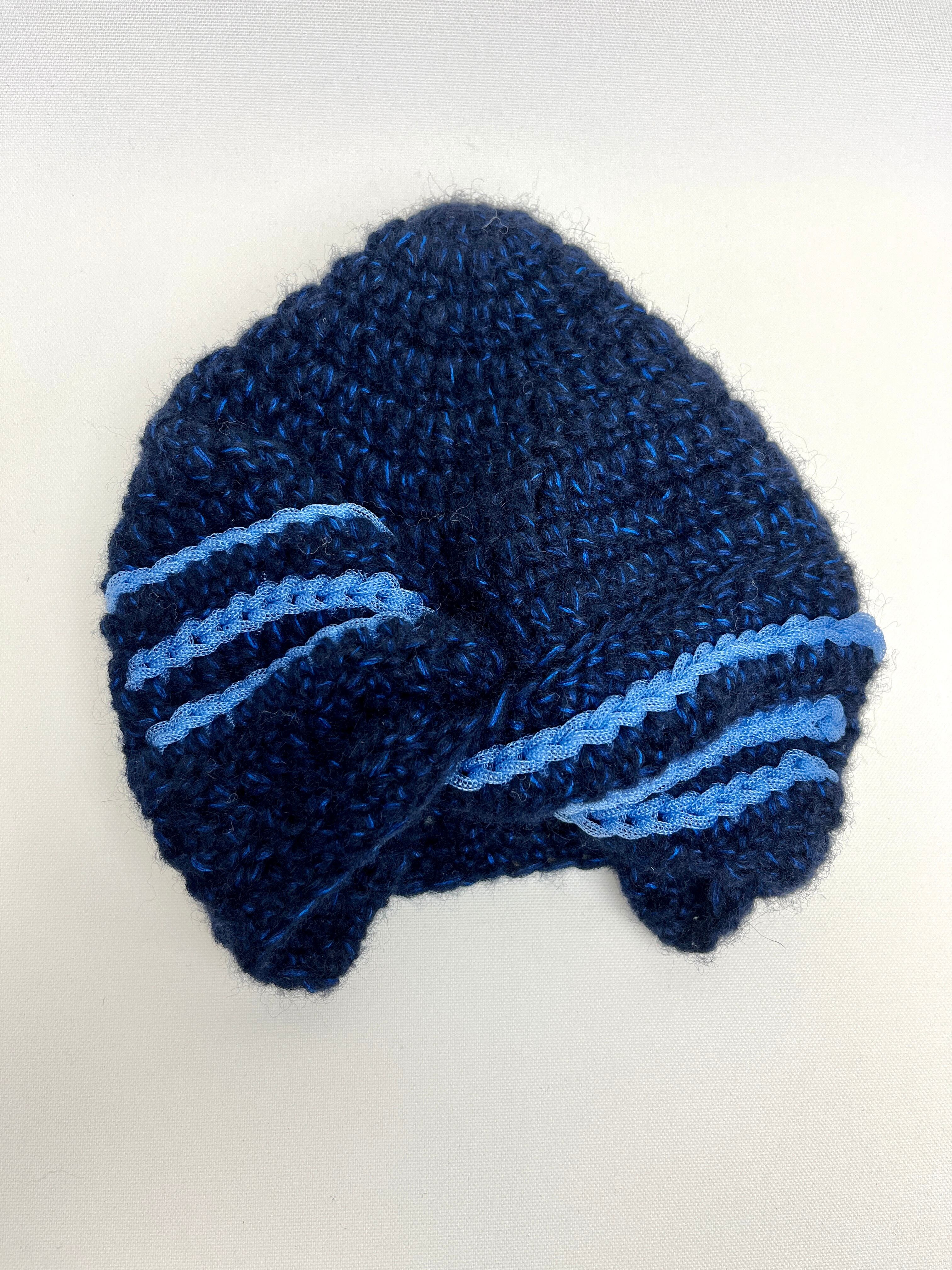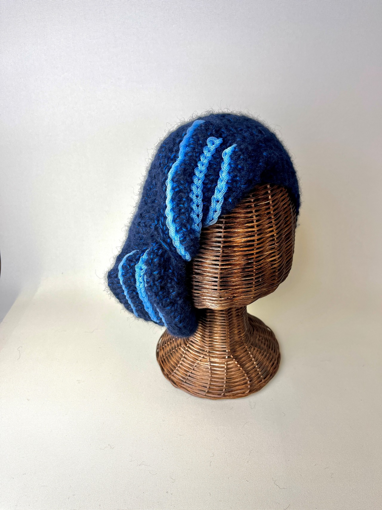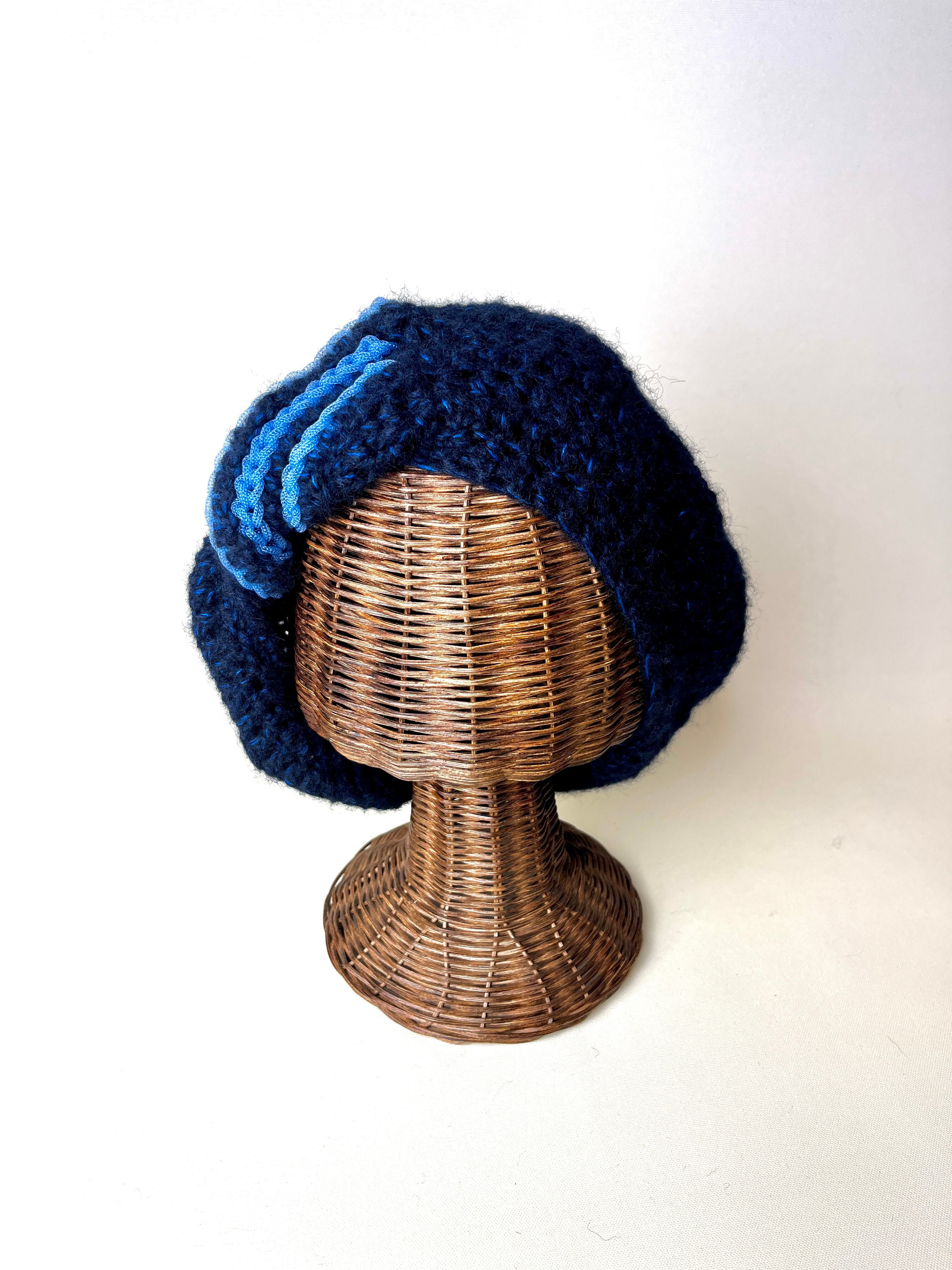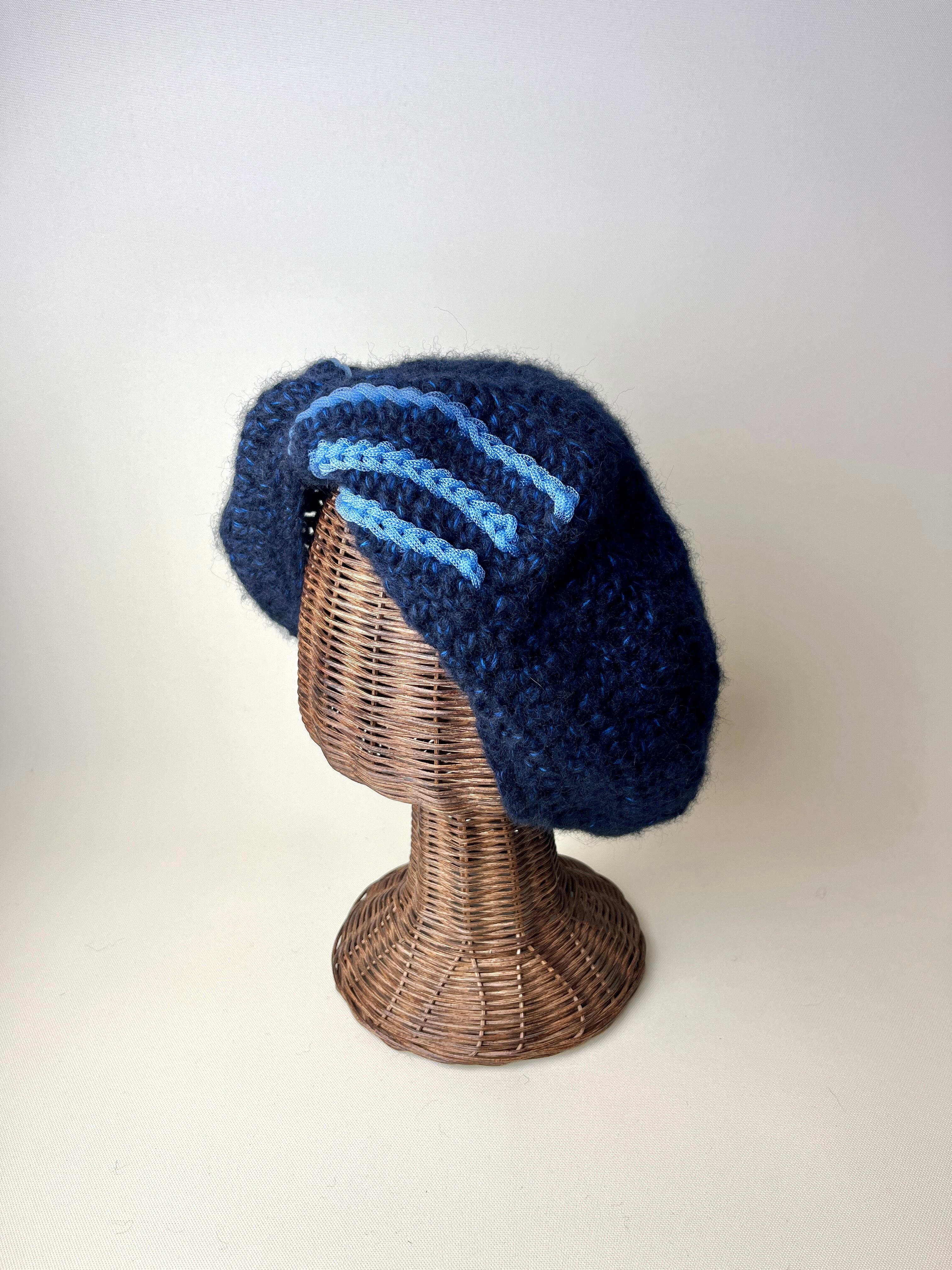 ぐるんとねじったベレー帽です。ねじり目を正面にするとターバン風。斜め上や斜め下、真横や真後ろにとボリューム位置を何通りにも替えてお楽しみいただけます。