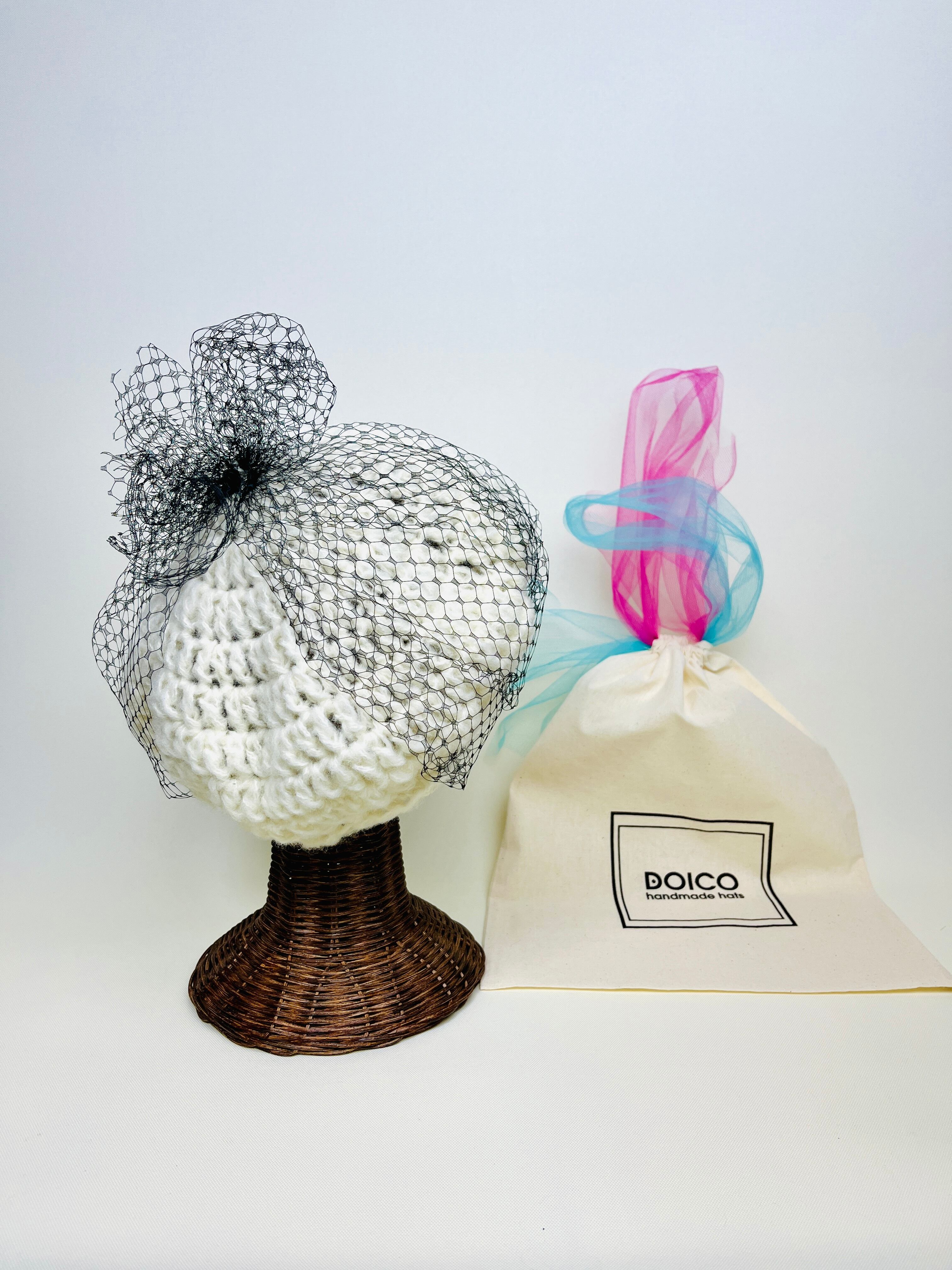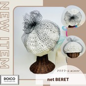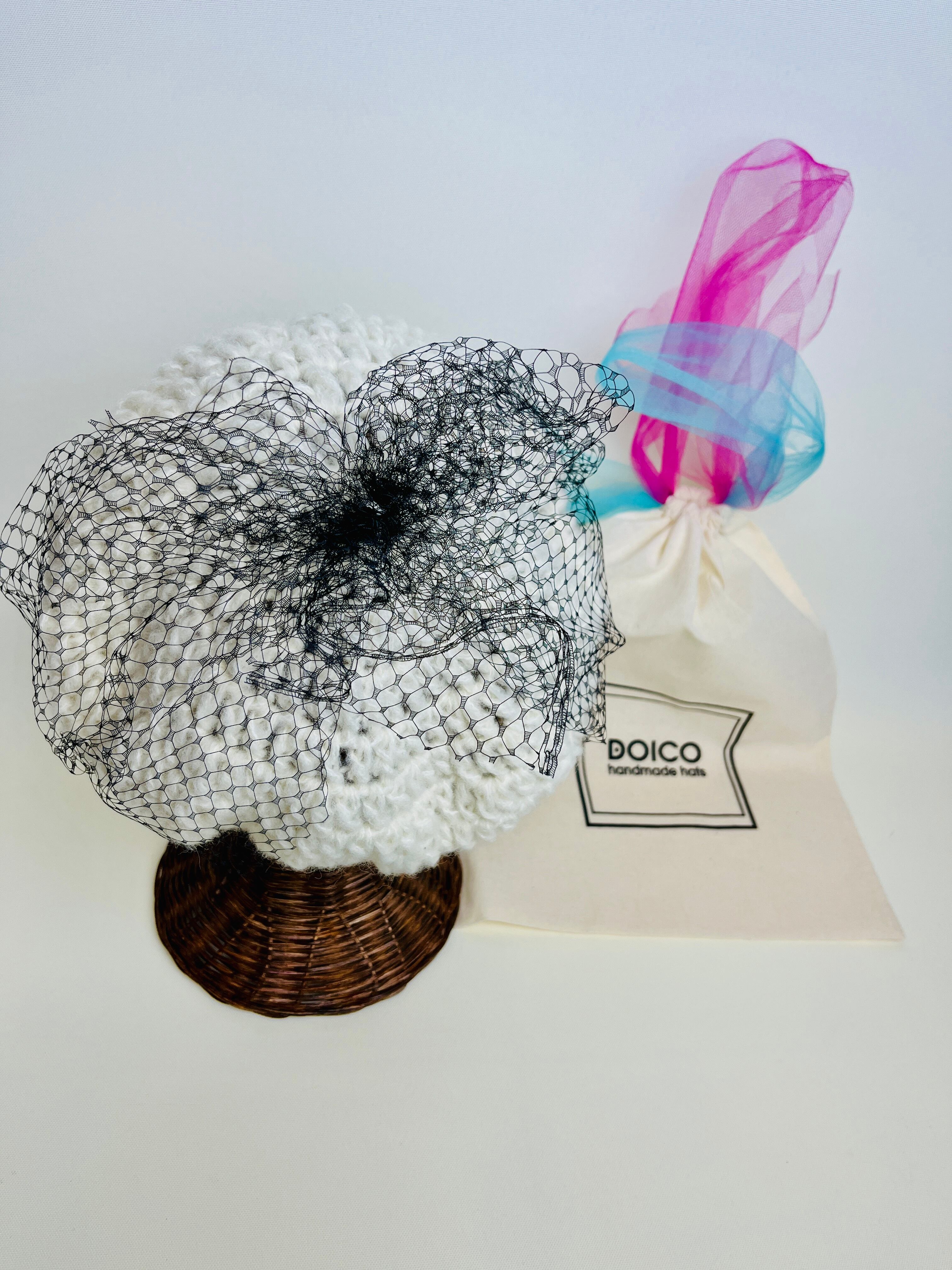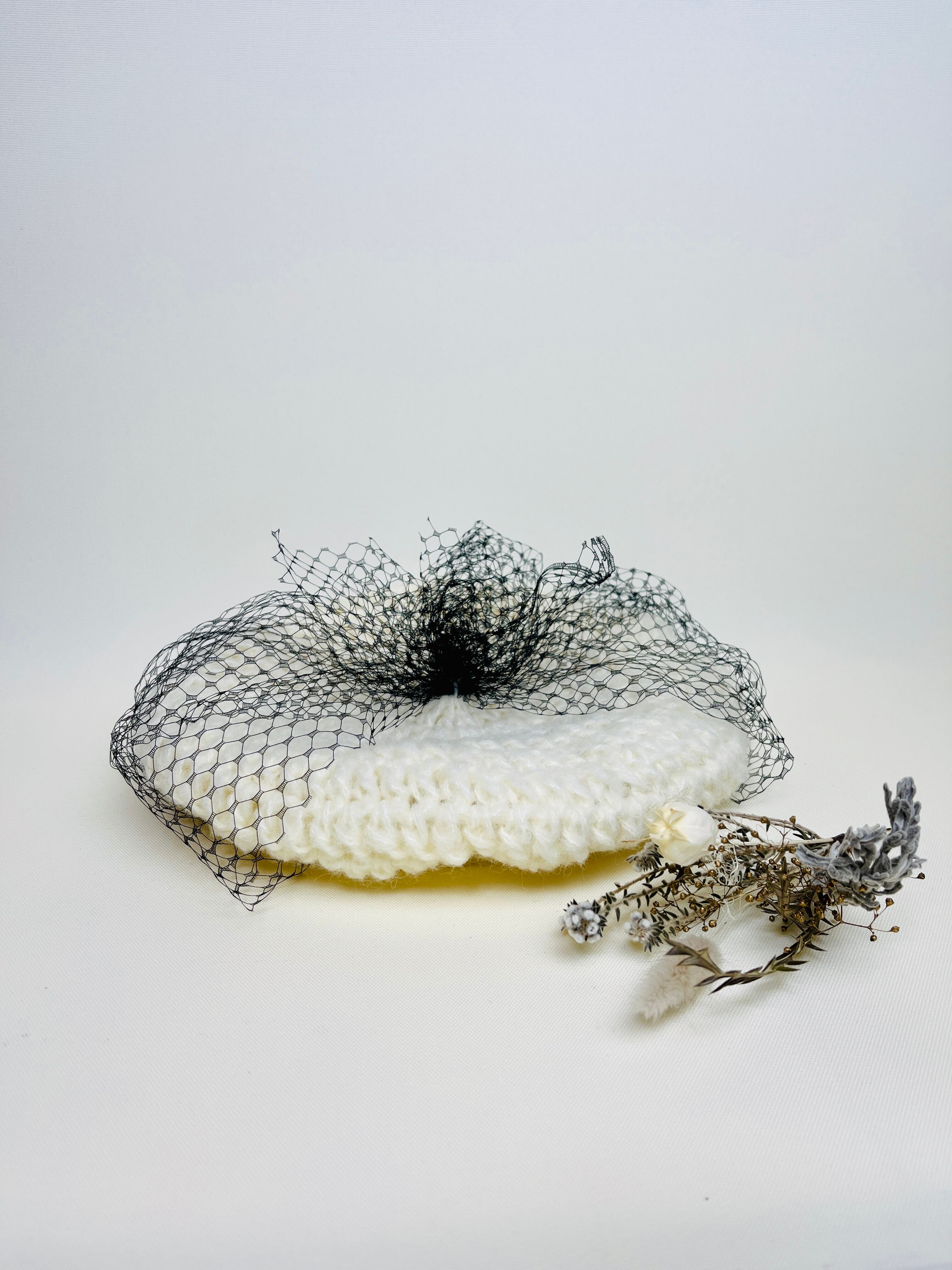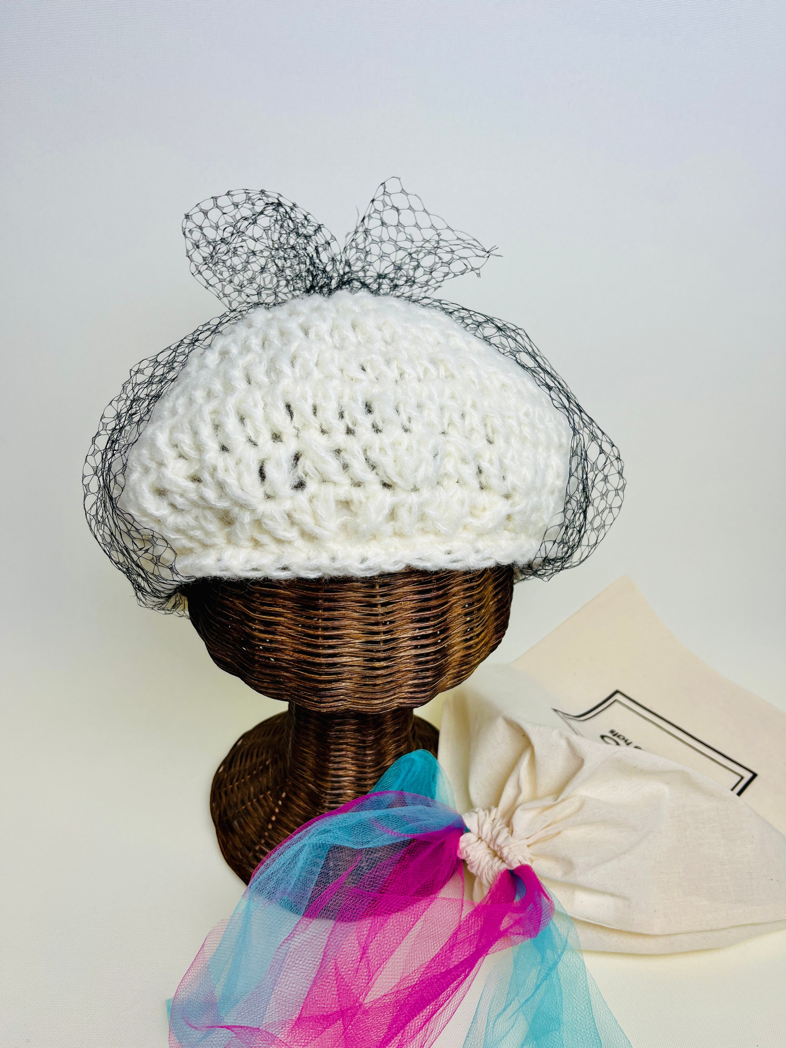 ネット飾りのベレー帽です。フォーマルなヘッドドレスに用いられるようなエレガントなチュールネットをニットベレー帽に併せました。ガーリースタイルにはもちろん、敢えてミリタリーなどのワークアイテムをカジュアルアップさせるのもオススメです。キモノ×ブーツ×ベレー帽のレトロなモガスタイルにも◎