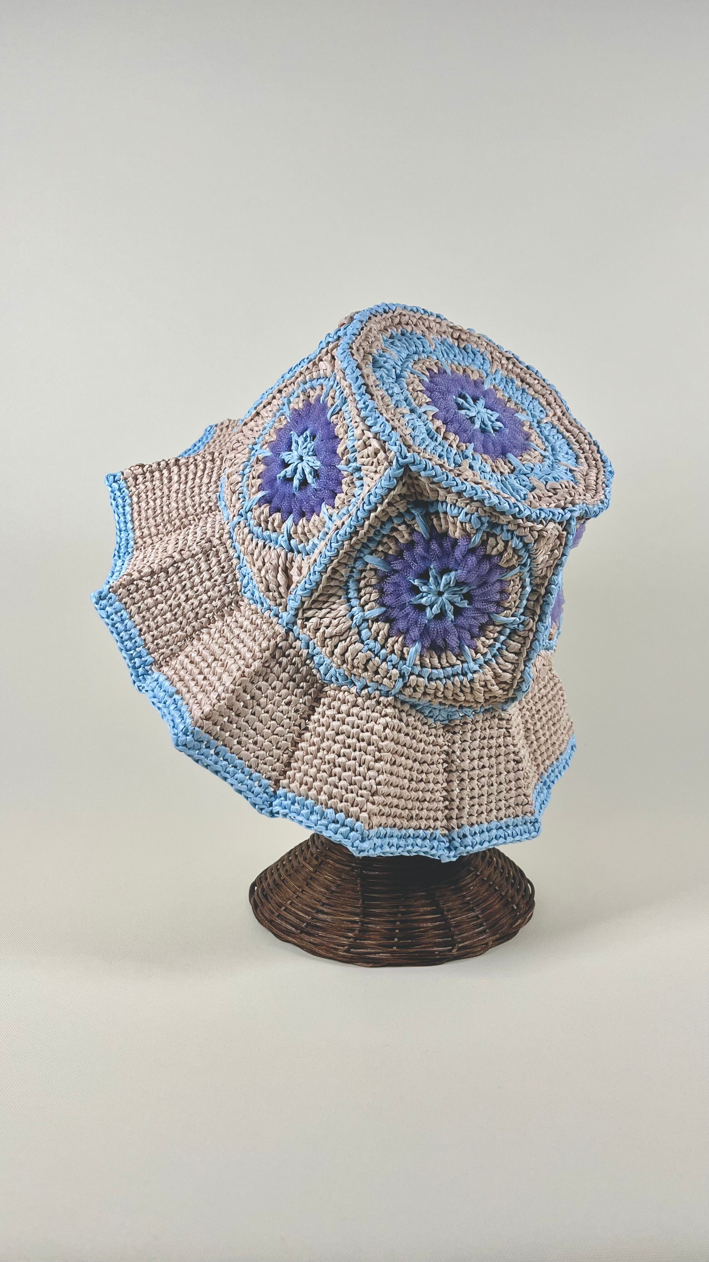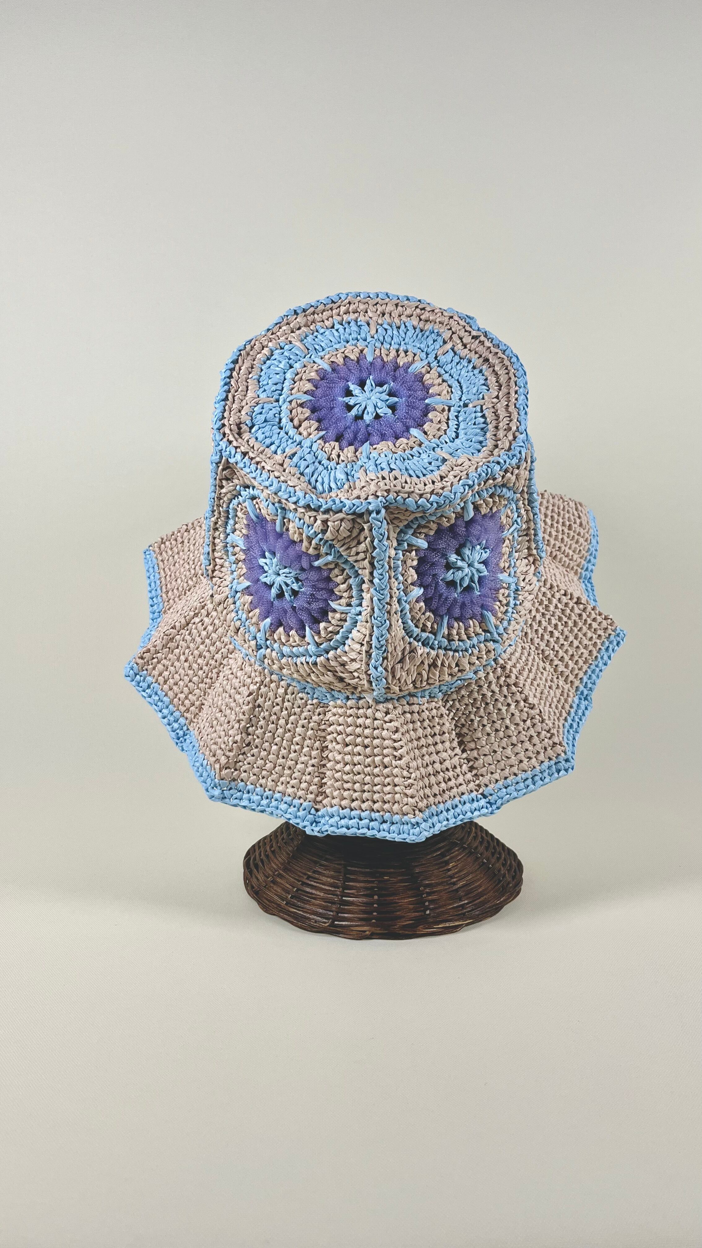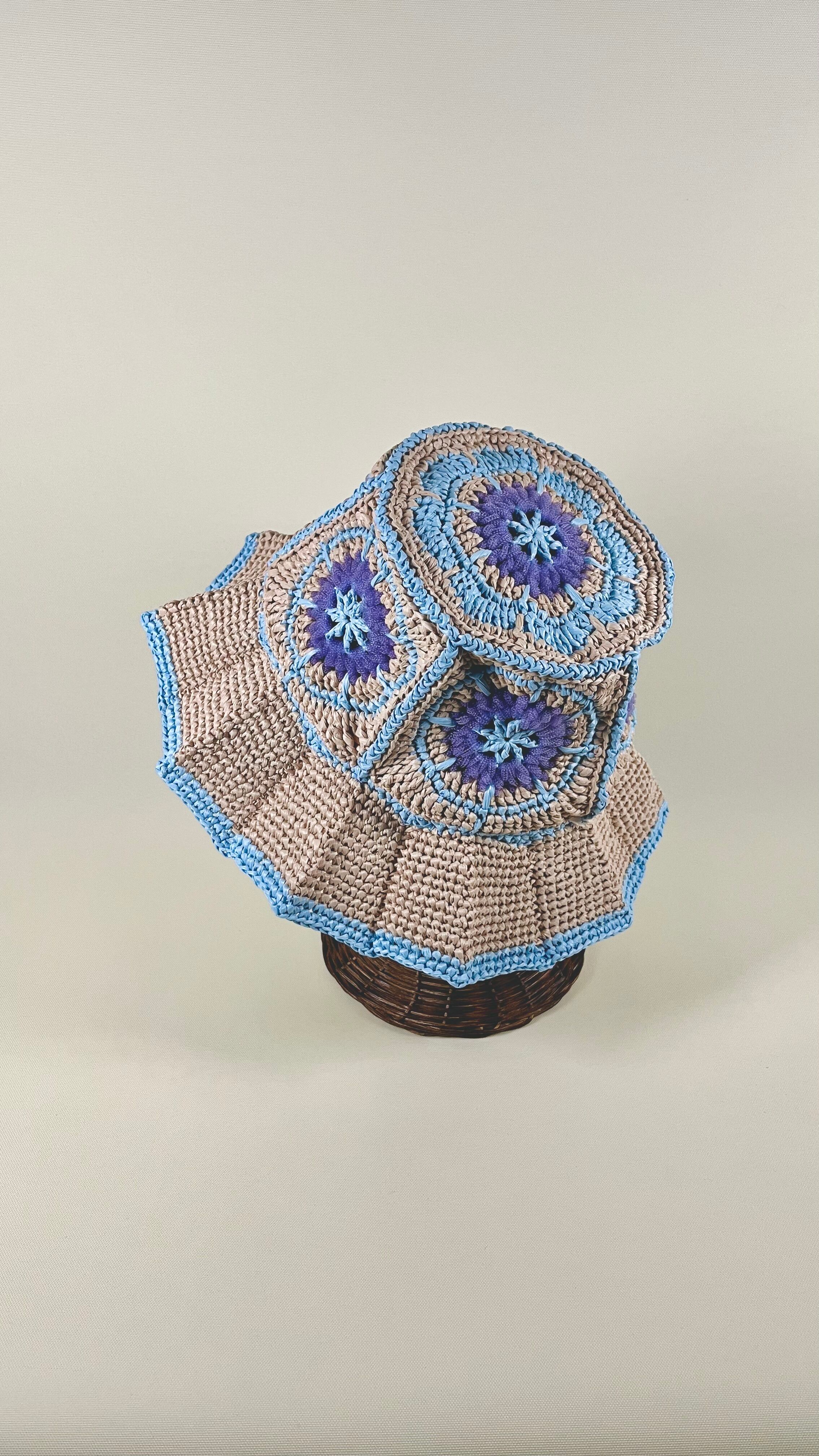 伝統的なアフリカンモチーフに未来的なチューブ状のナイロン糸をアクセントとして加えたら…という発想で出来ました。全体的にはコットンリンターの再生繊維で調和をとっています。ギザギザプリーツのブリムもオリエンタルなムードがあります。