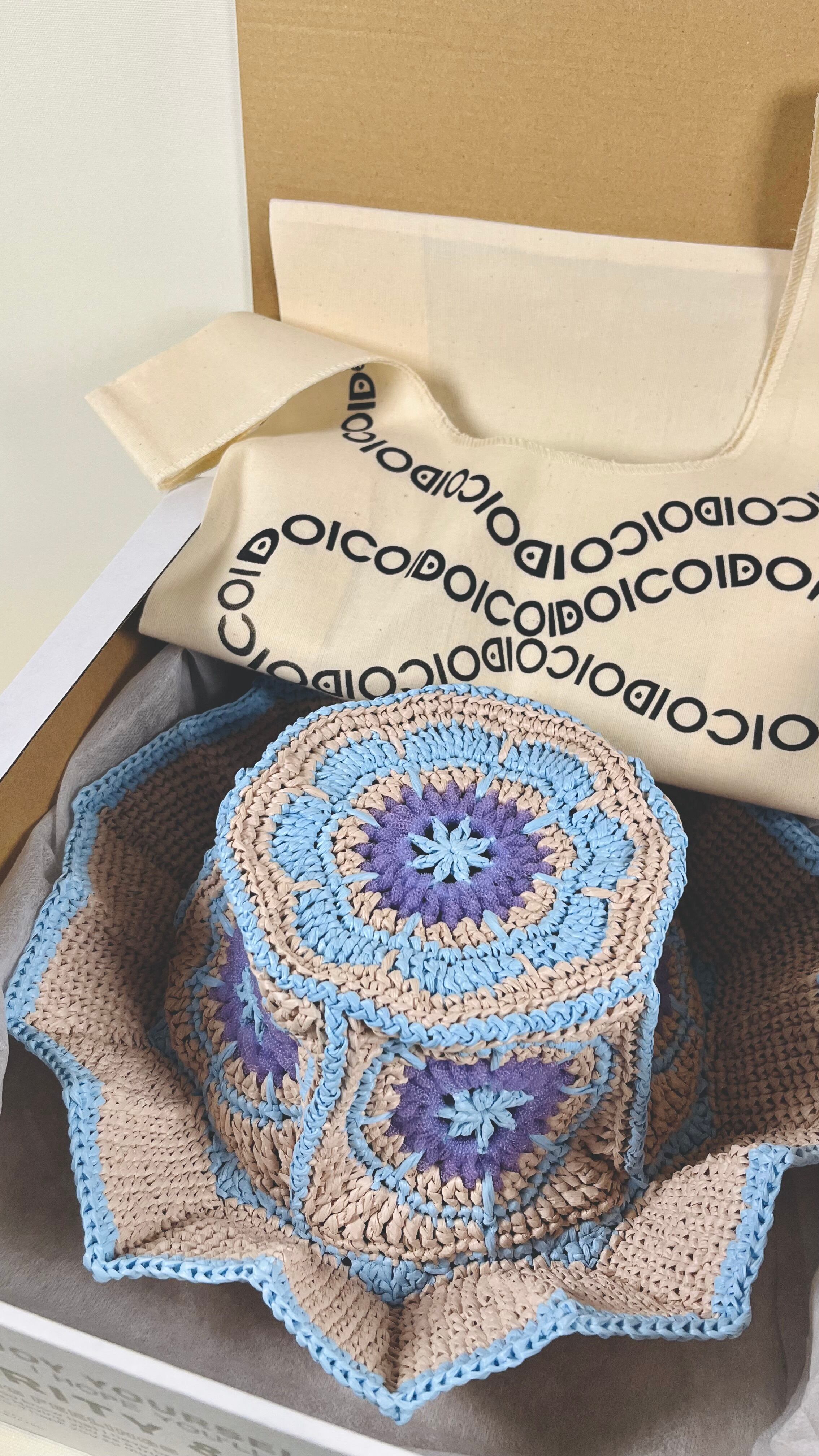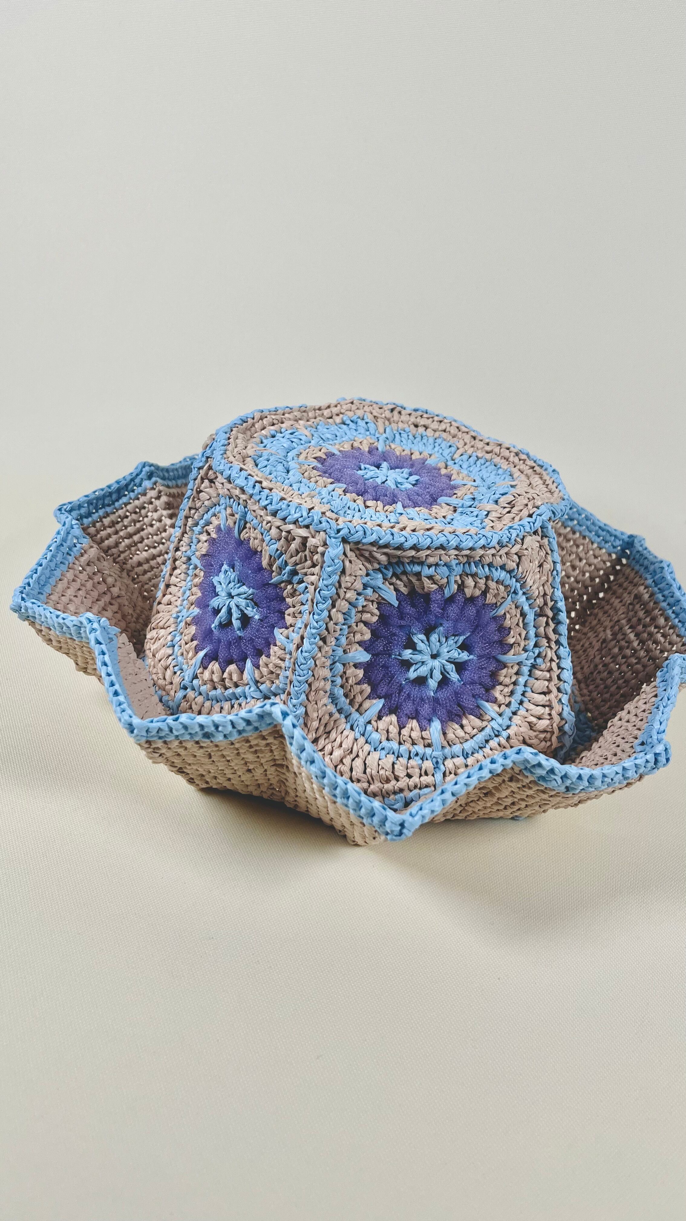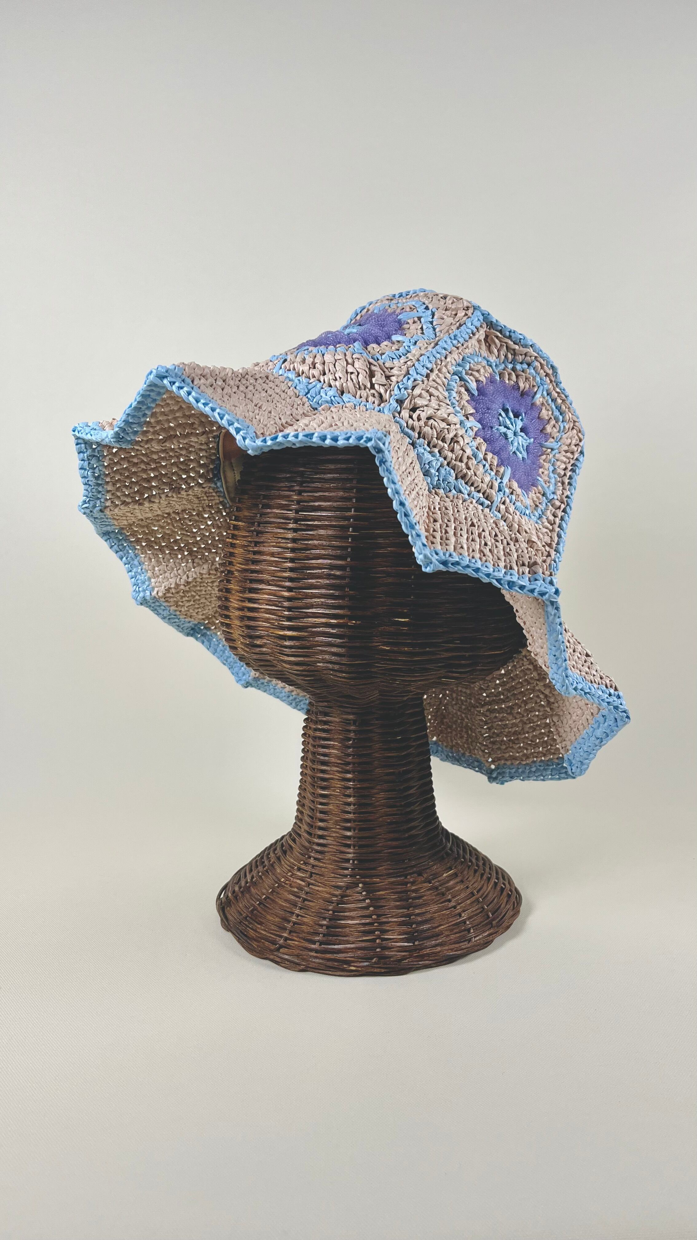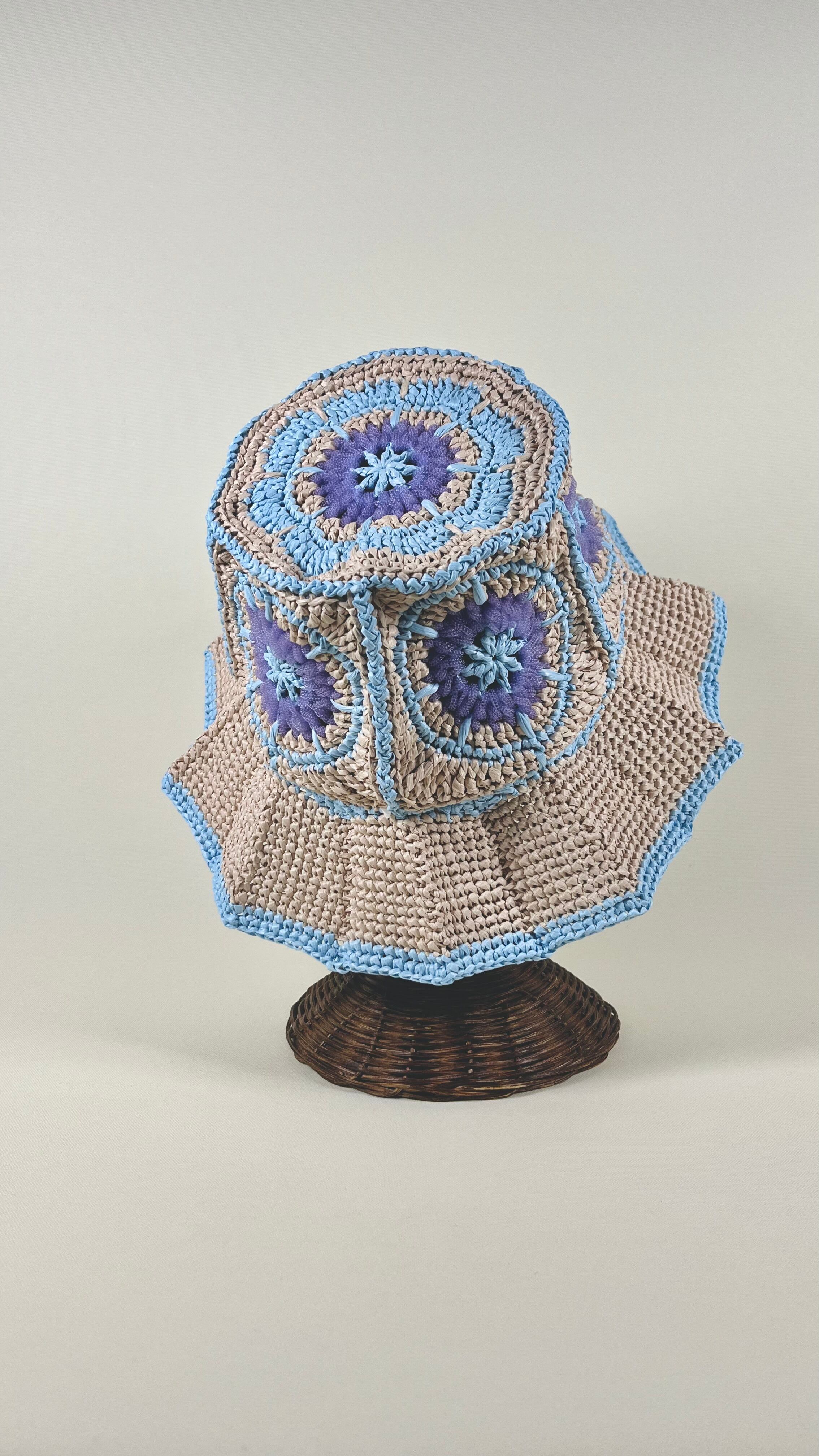 伝統的なアフリカンモチーフに未来的なチューブ状のナイロン糸をアクセントとして加えたら…という発想で出来ました。全体的にはコットンリンターの再生繊維で調和をとっています。ギザギザプリーツのブリムもオリエンタルなムードがあります。