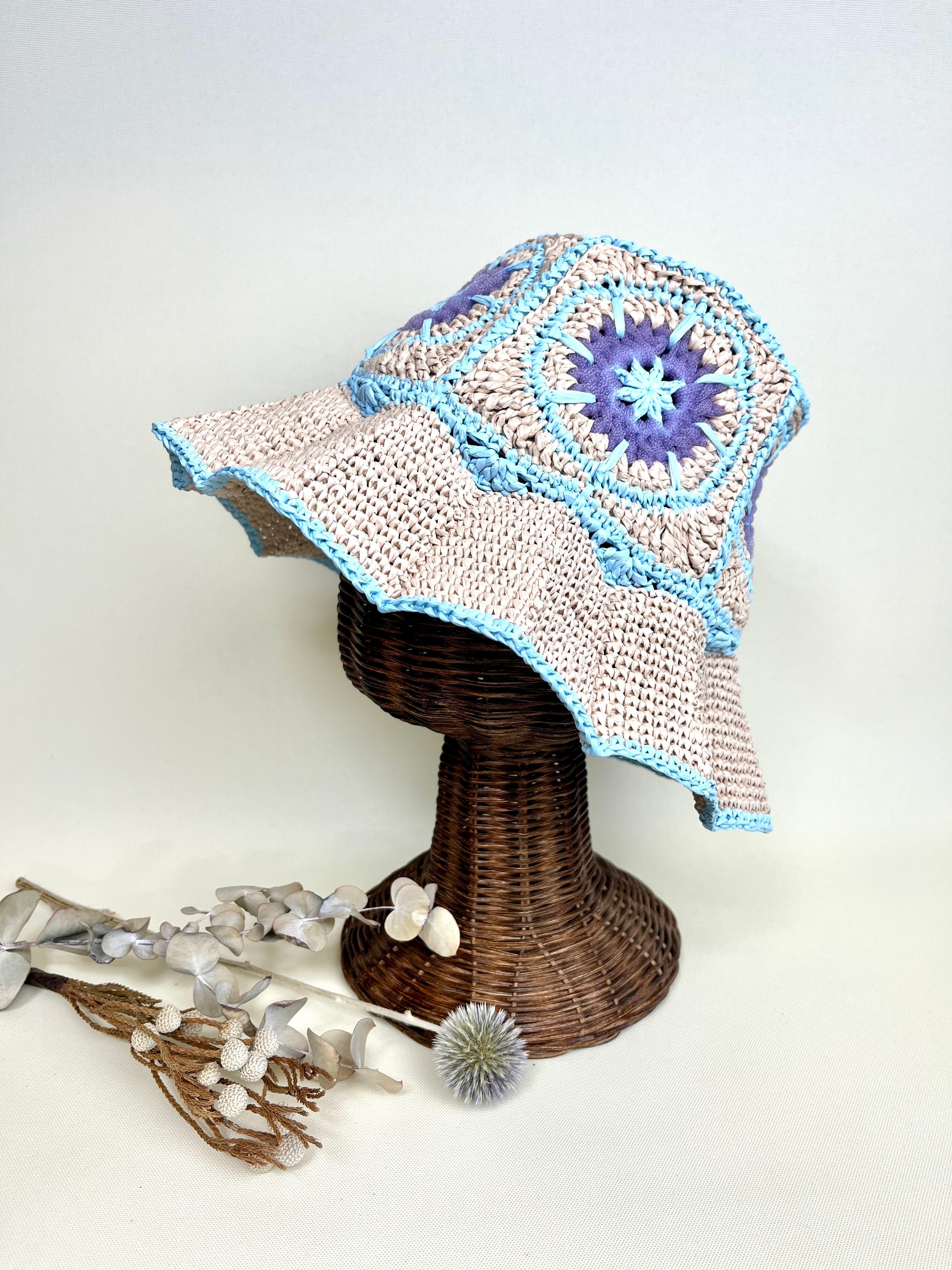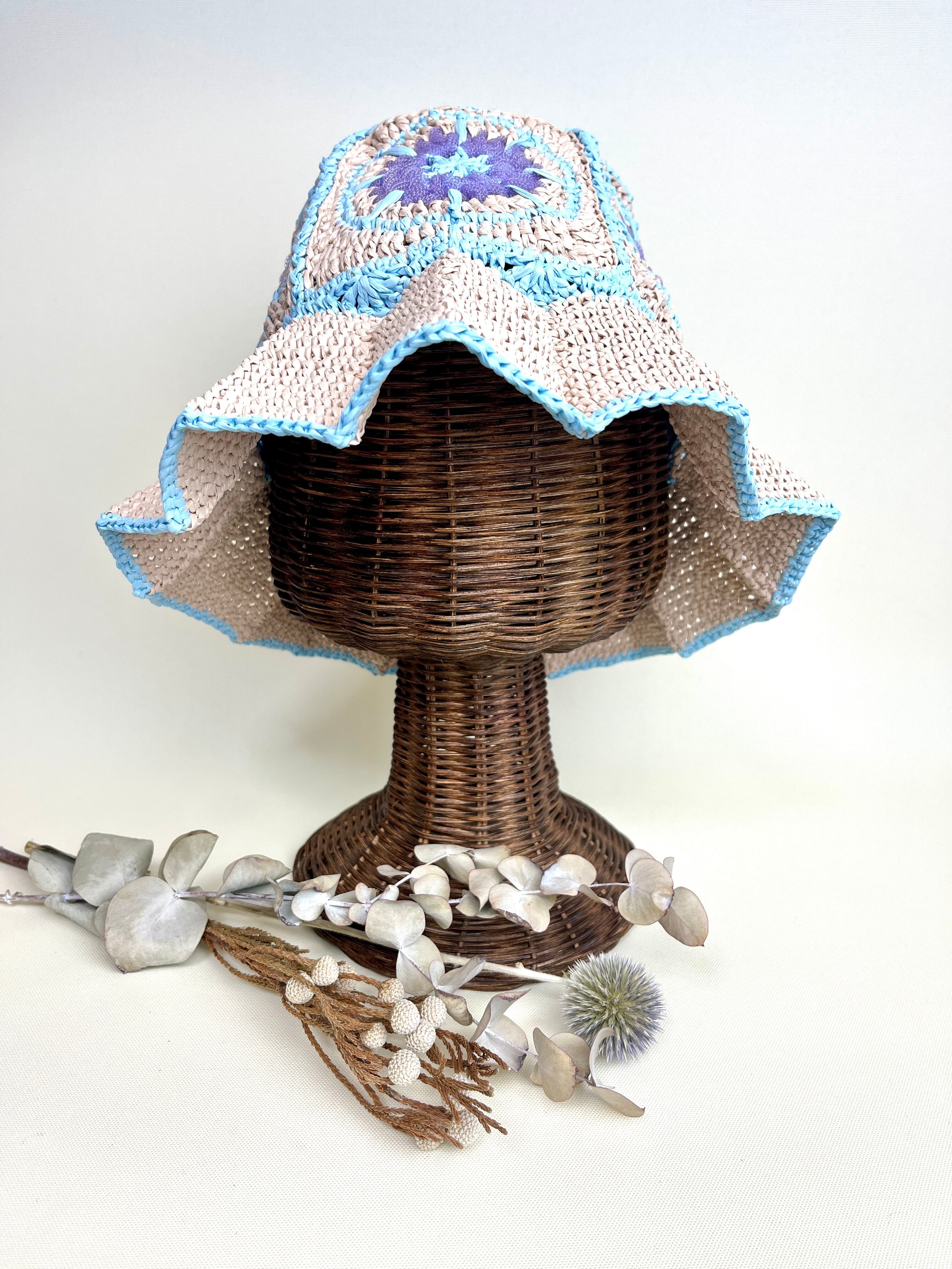 未来的なチューブ状のナイロン糸を伝統的なアフリカンモチーフにアクセントとして加えたら…という発想で出来ました。全体的にはコットンリンター(綿の種)由来の再生繊維で調和をとりました。ギザギザプリーツのブリムもオリエンタルなムードがあります。