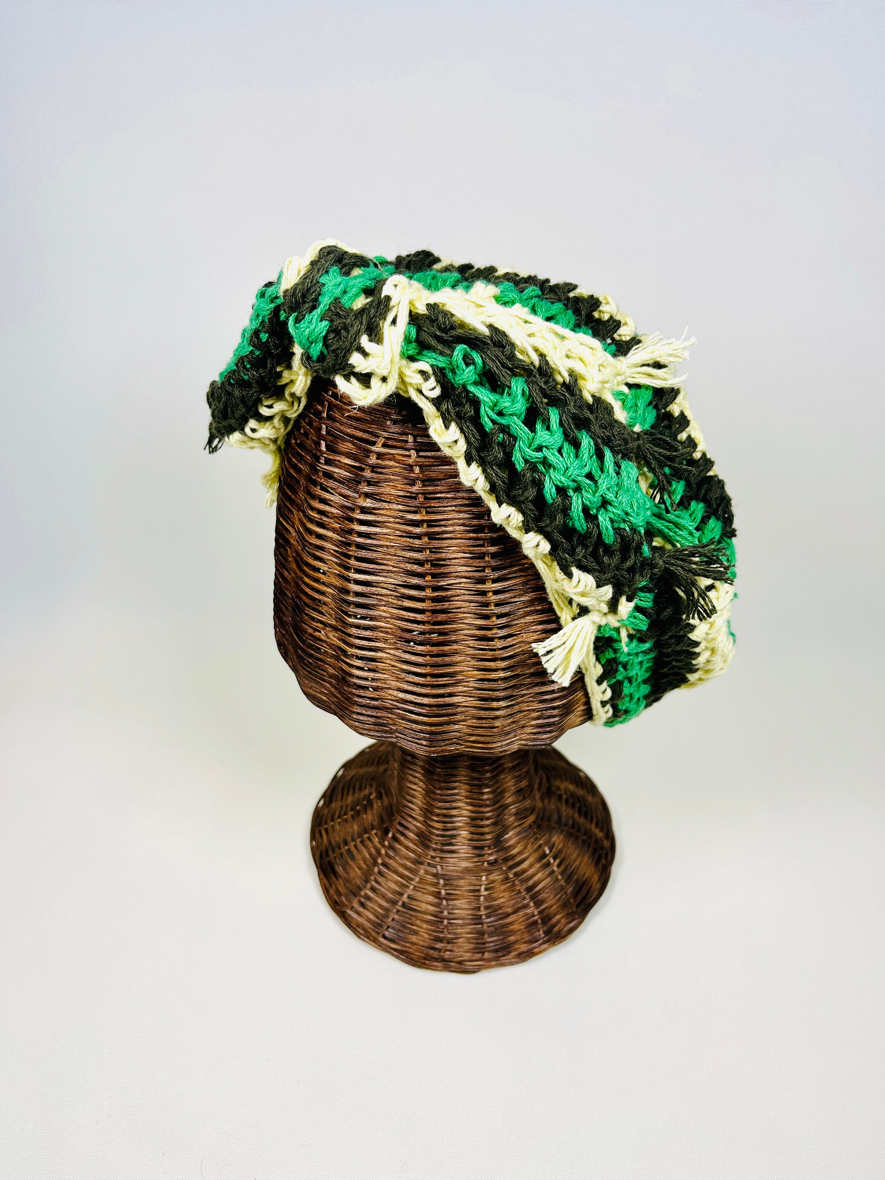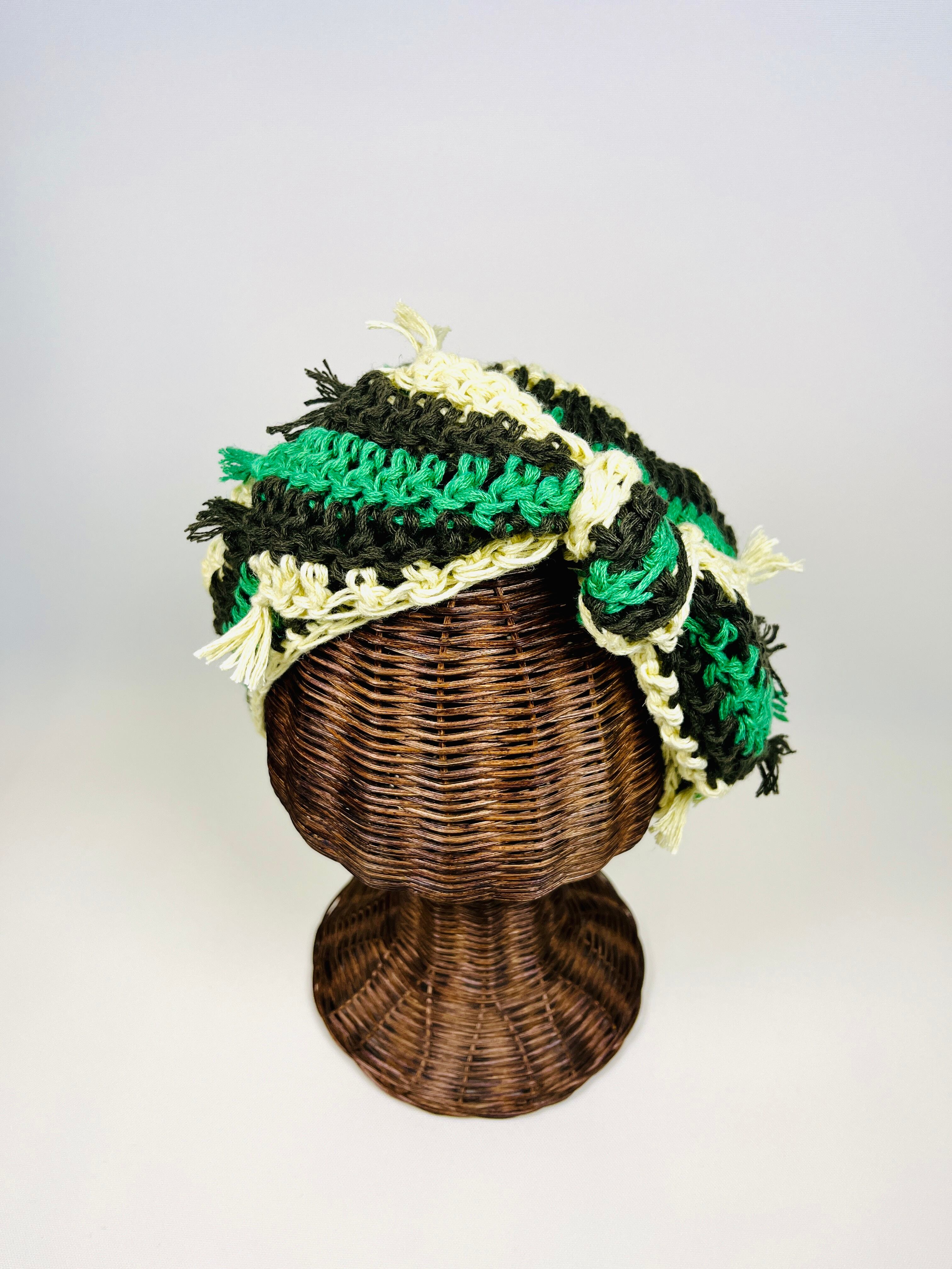 フリンジリボンを結んだ三色ベレー帽です。リボン部分は無造作にみせるために本体とは編み方を替えて成形しています。