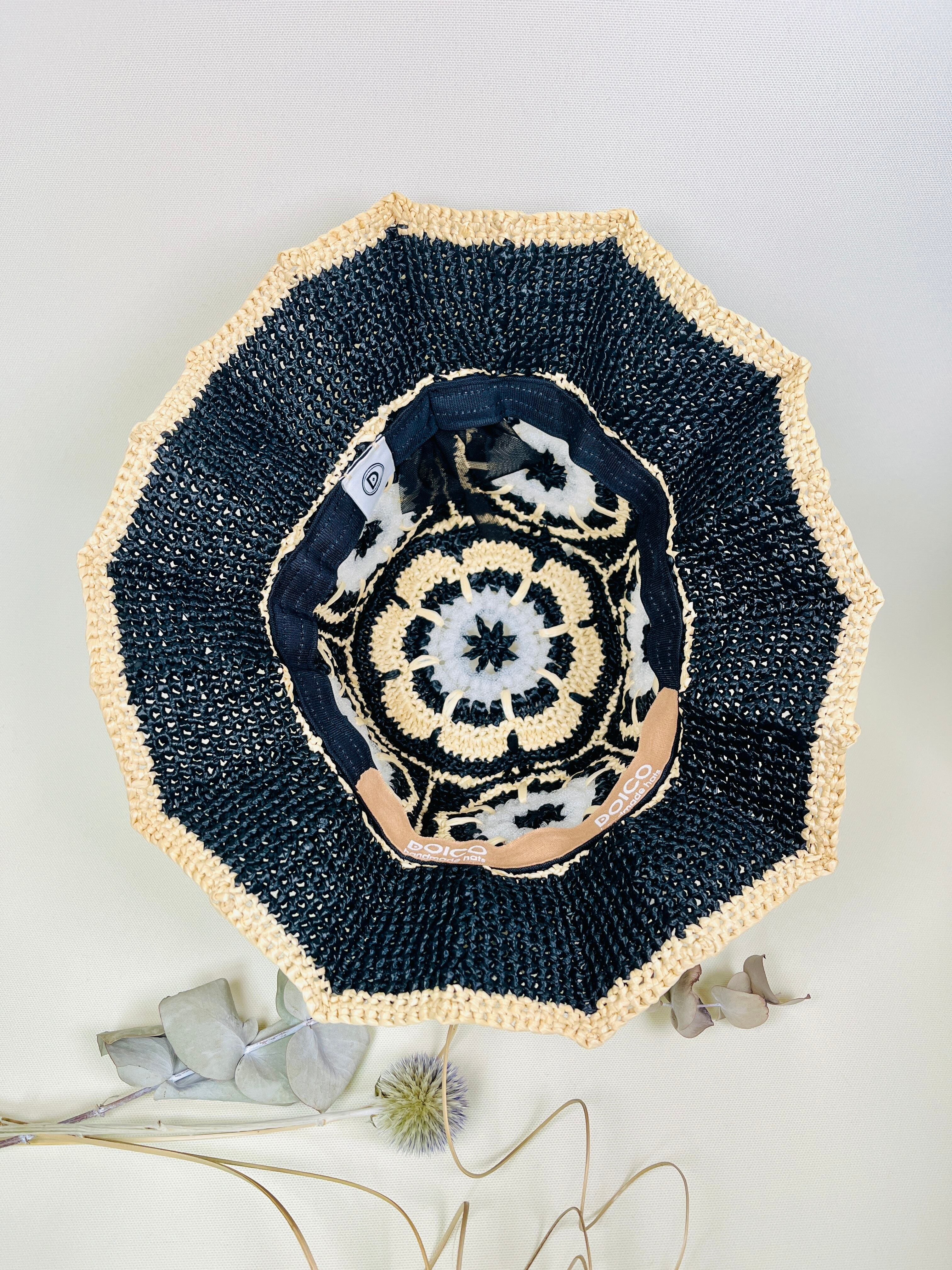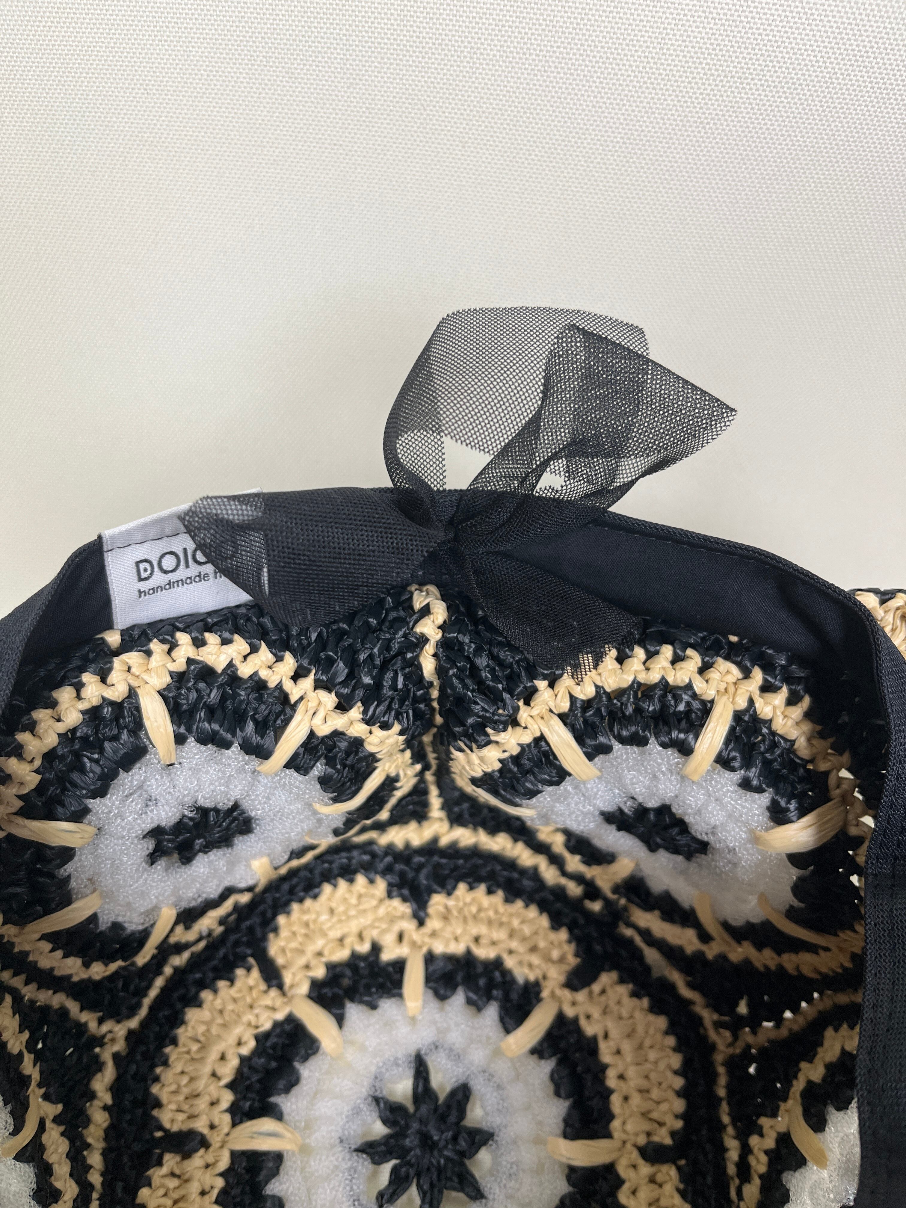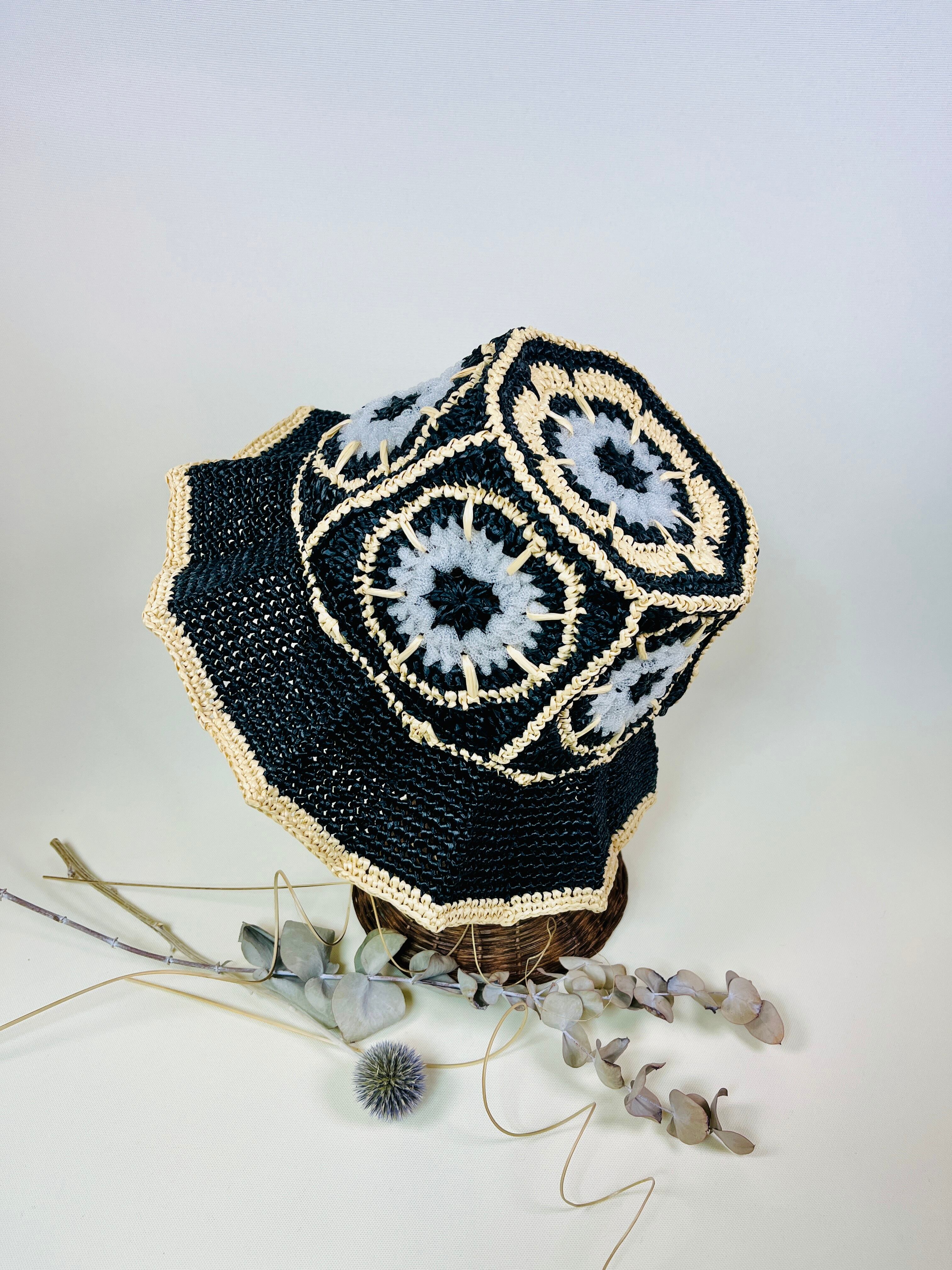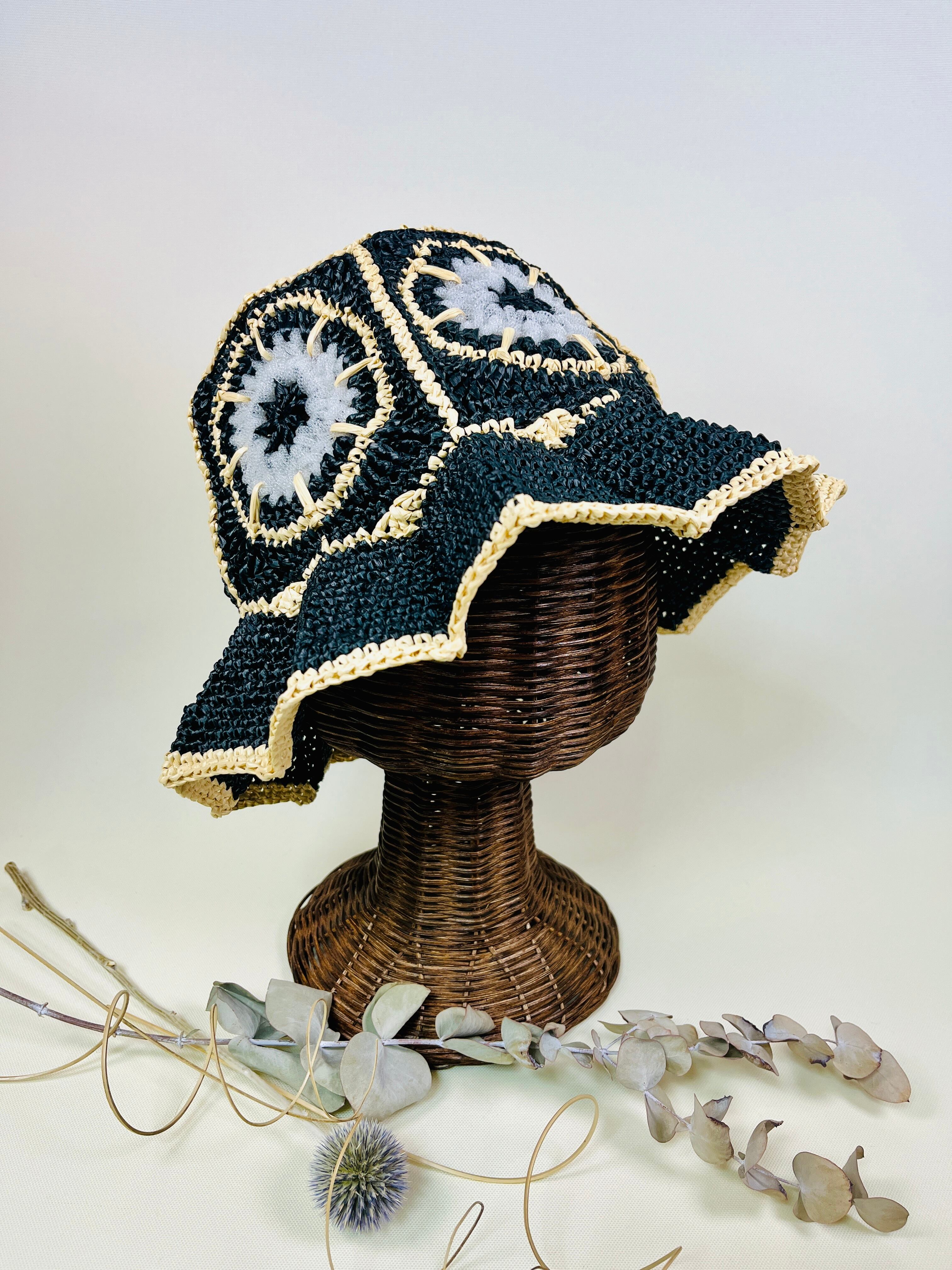 未来的なチューブ状のナイロン糸を伝統的なアフリカンモチーフにアクセントとして加えたら…という発想で出来ました。全体的にはコットンリンター(綿の種)の再生繊維で調和をとりました。ギザギザプリーツのブリムもオリエンタルなムードがあります。