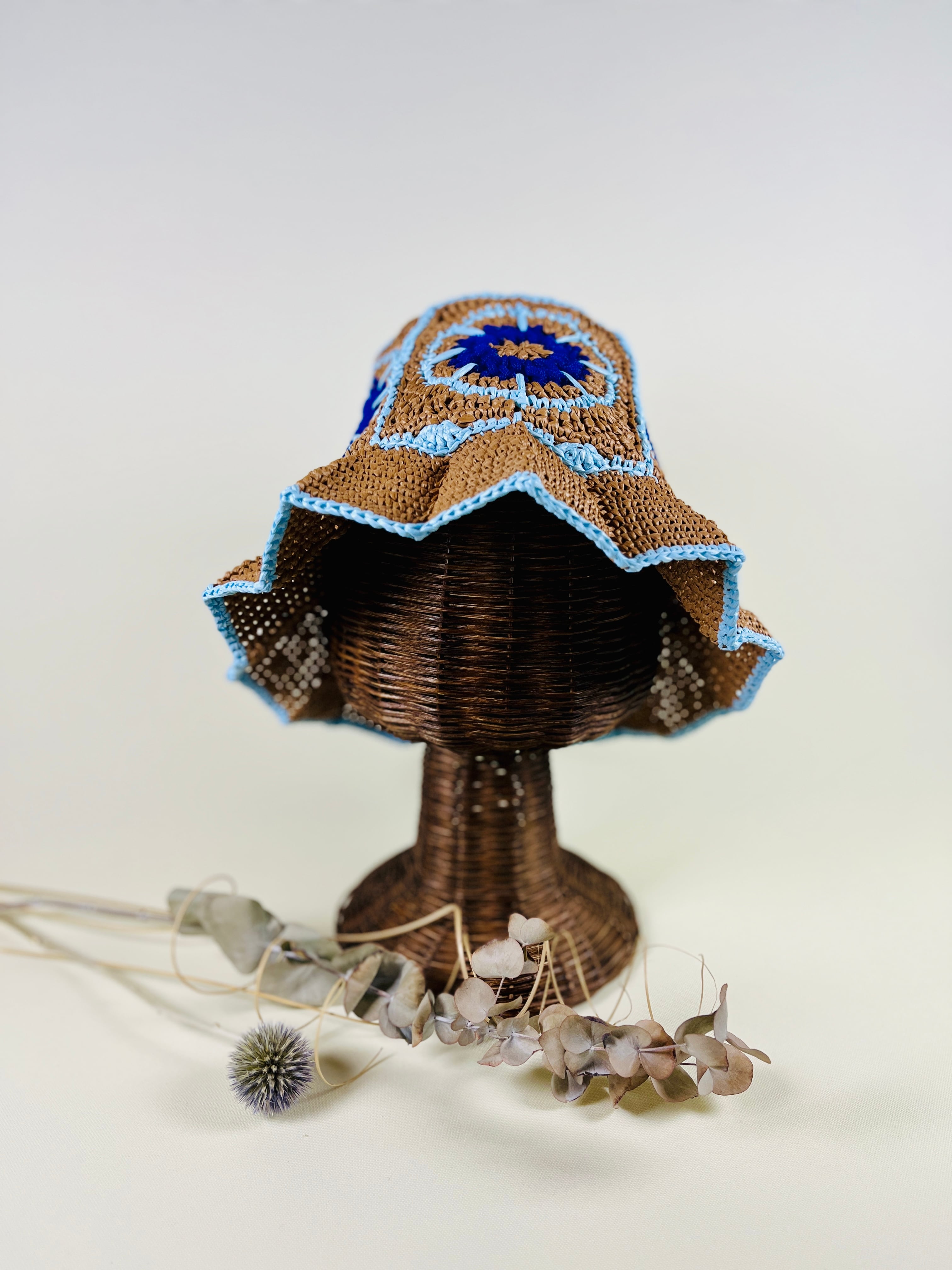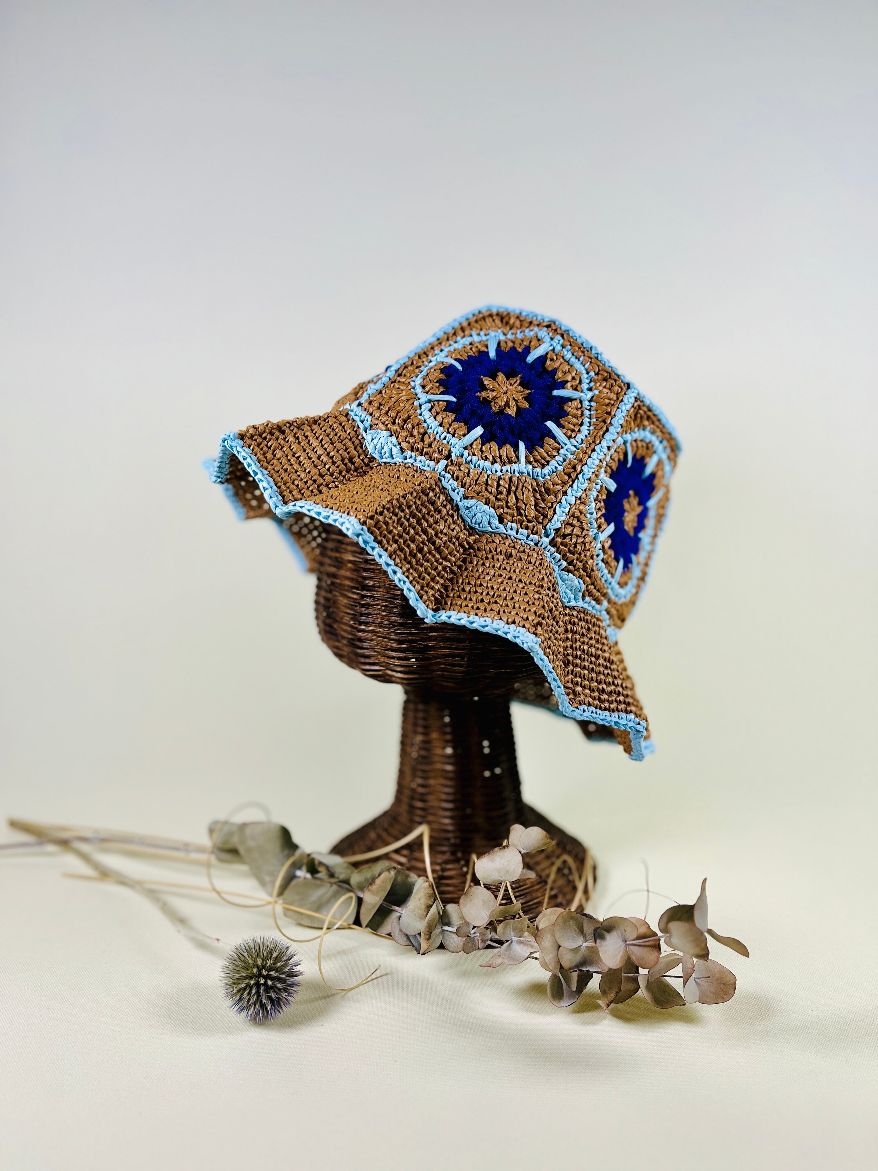 未来的なチューブ状のナイロン糸を伝統的なアフリカンモチーフにアクセントとして加えたら…という発想で出来ました。全体的にはコットンリンター(綿の種)由来の再生繊維で調和をとりました。ギザギザプリーツのブリムもオリエンタルなムードがあります。