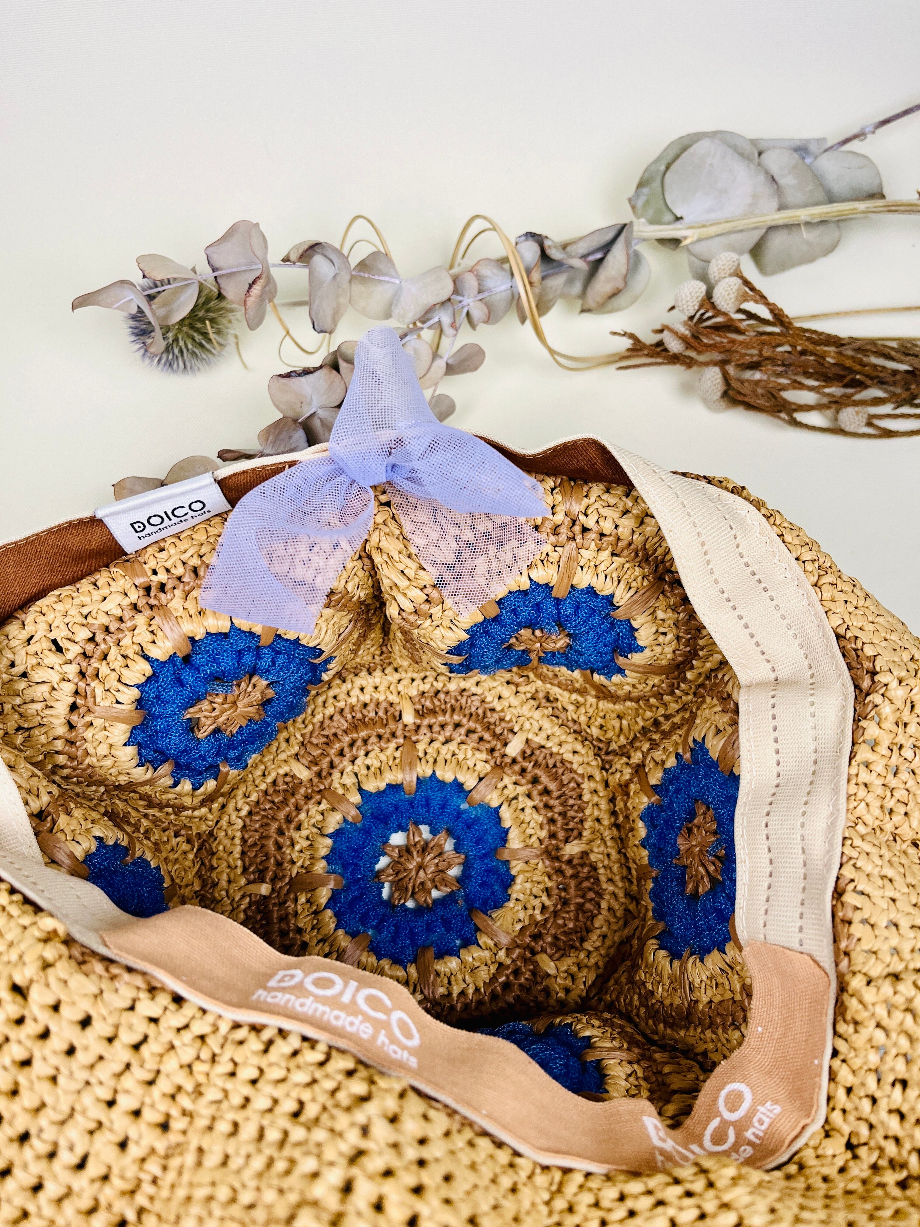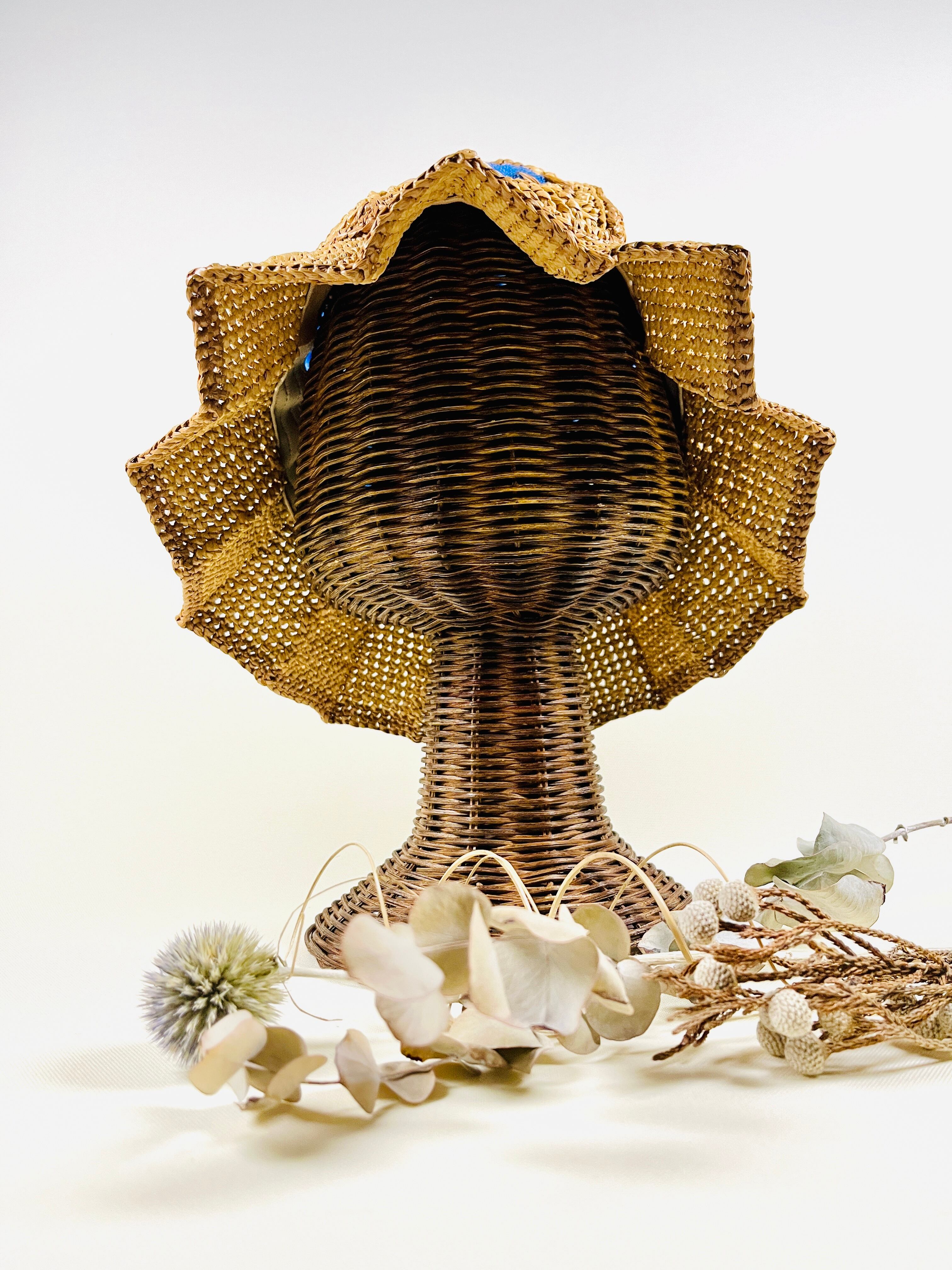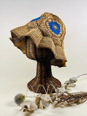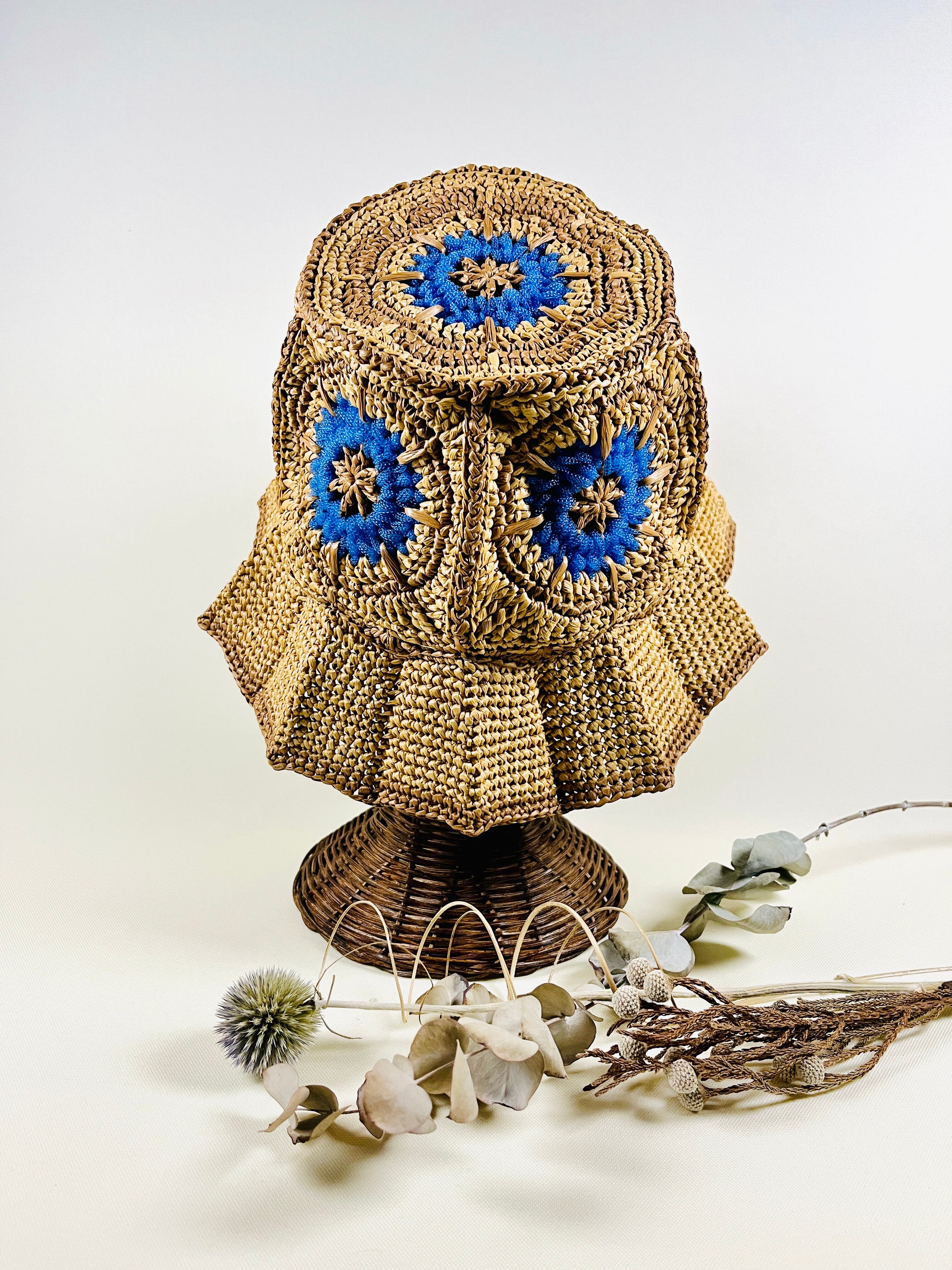 未来的なチューブ状のナイロン糸を伝統的なアフリカンモチーフにアクセントとして加えたら…という発想で出来ました。全体的にはコットンリンター(綿の種)由来の再生繊維で調和をとりました。ギザギザプリーツのブリムもオリエンタルなムードがあります。