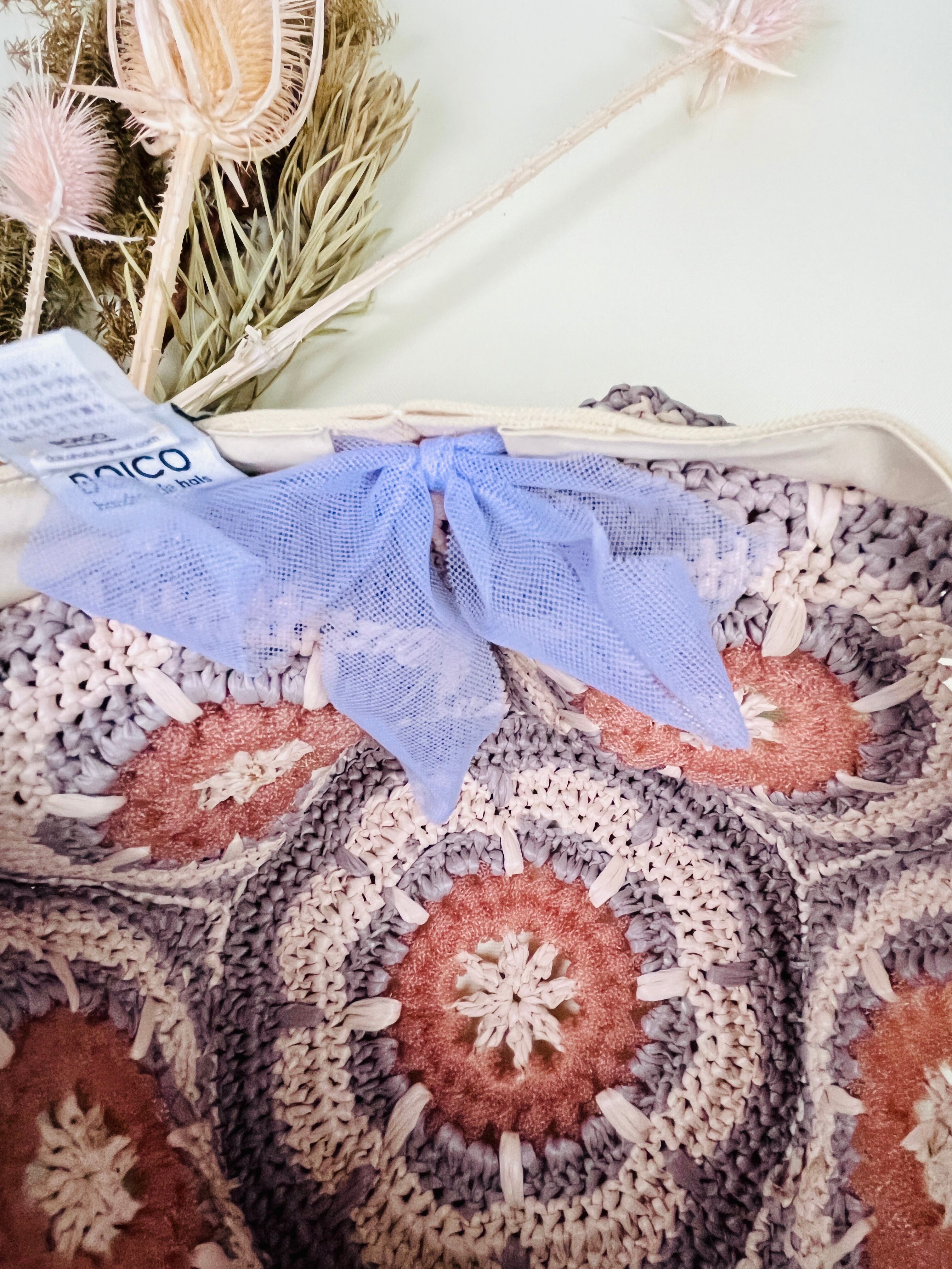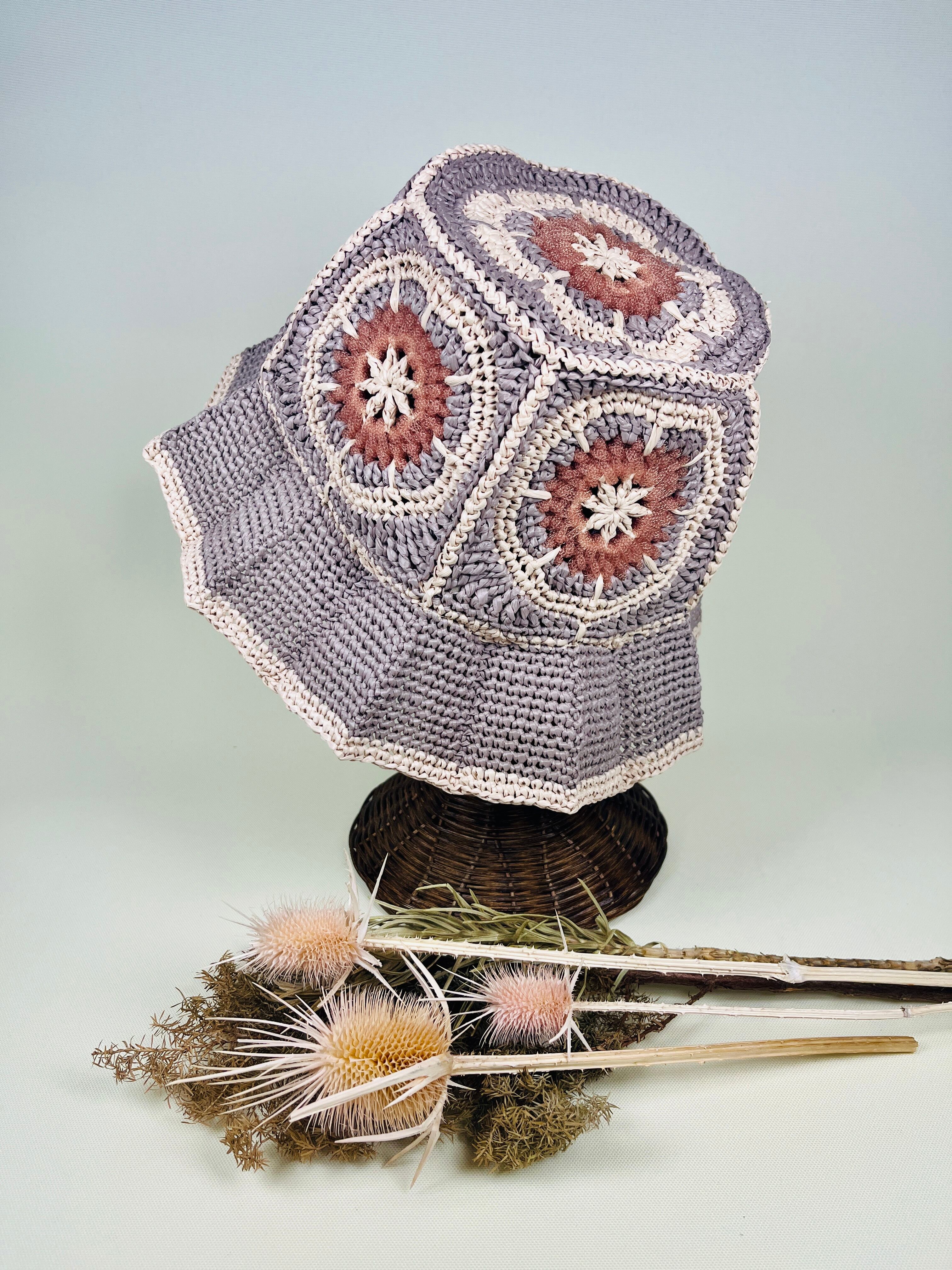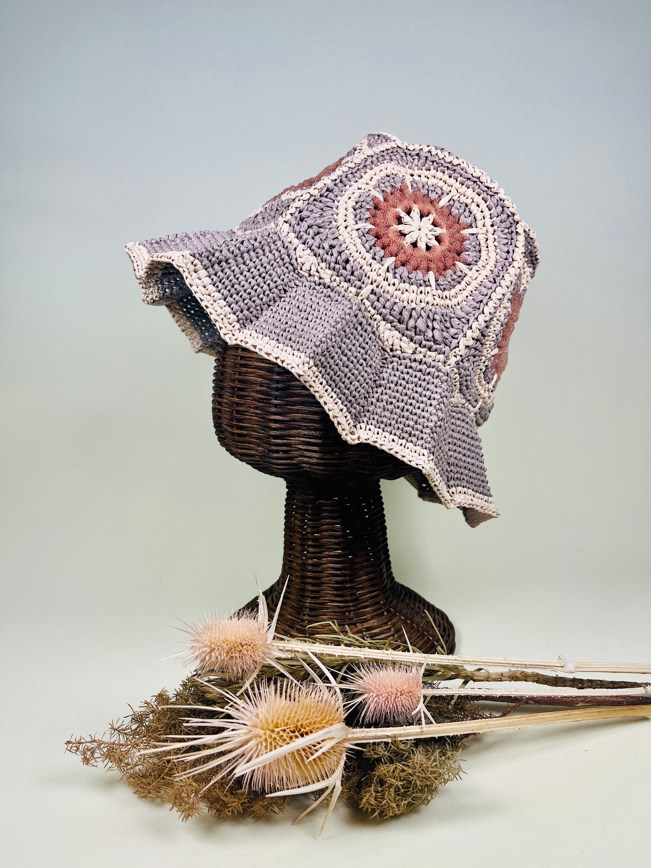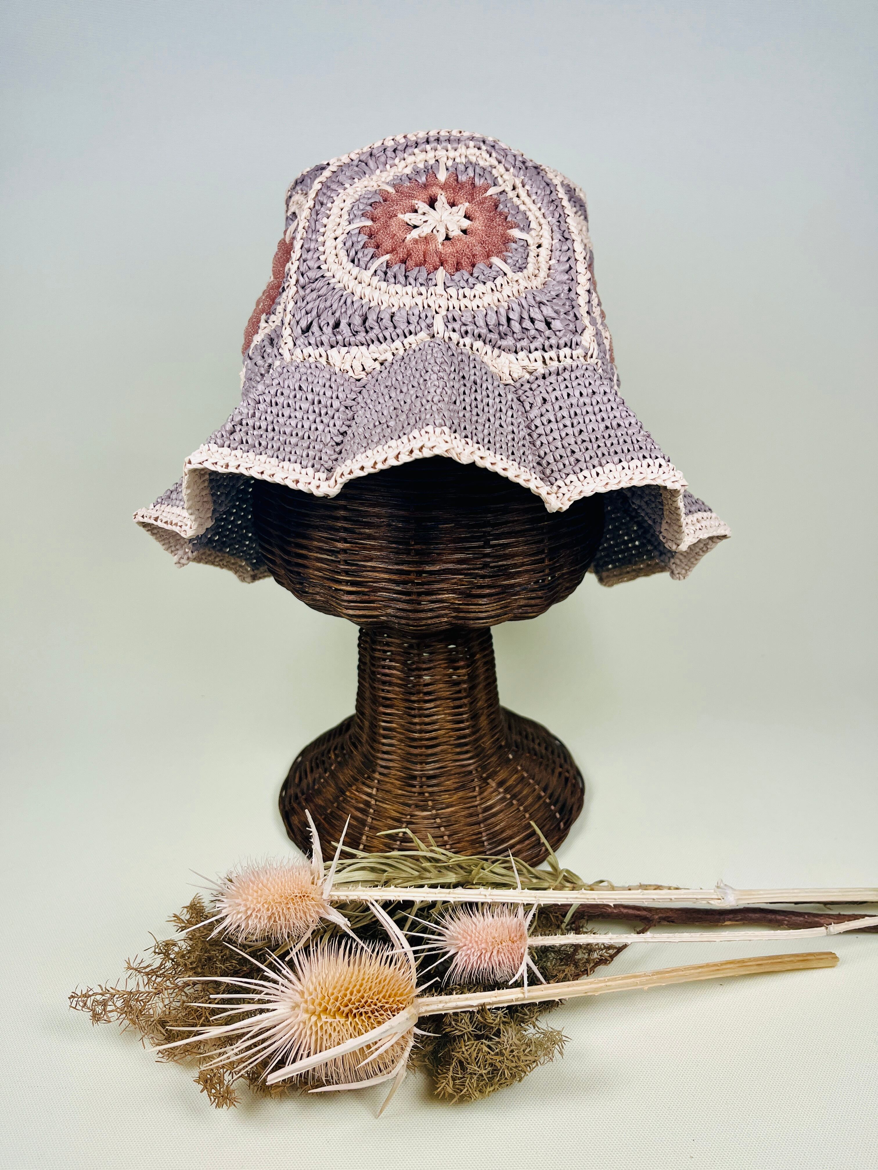 未来的なチューブ状のナイロン糸を伝統的なアフリカンモチーフにアクセントとして加えたら…という発想で出来ました。全体的にはコットンリンター(綿の種)由来の再生繊維で調和をとりました。ギザギザプリーツのブリムもオリエンタルなムードがあります。