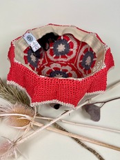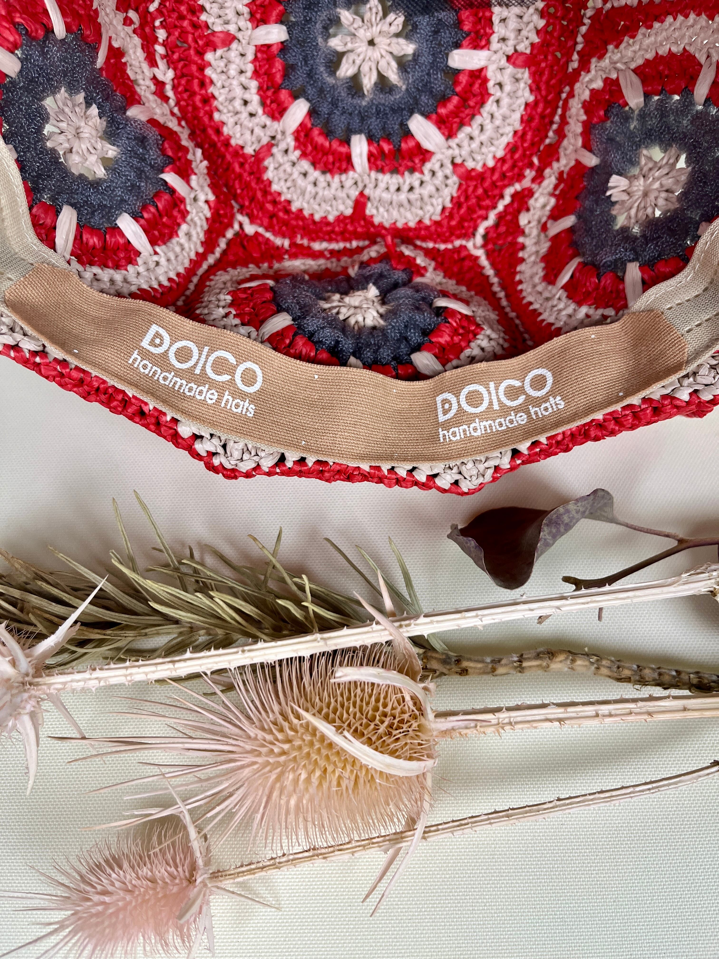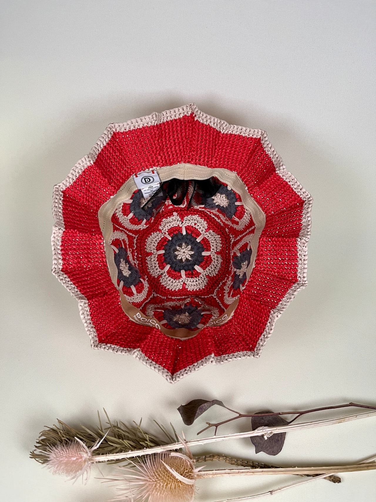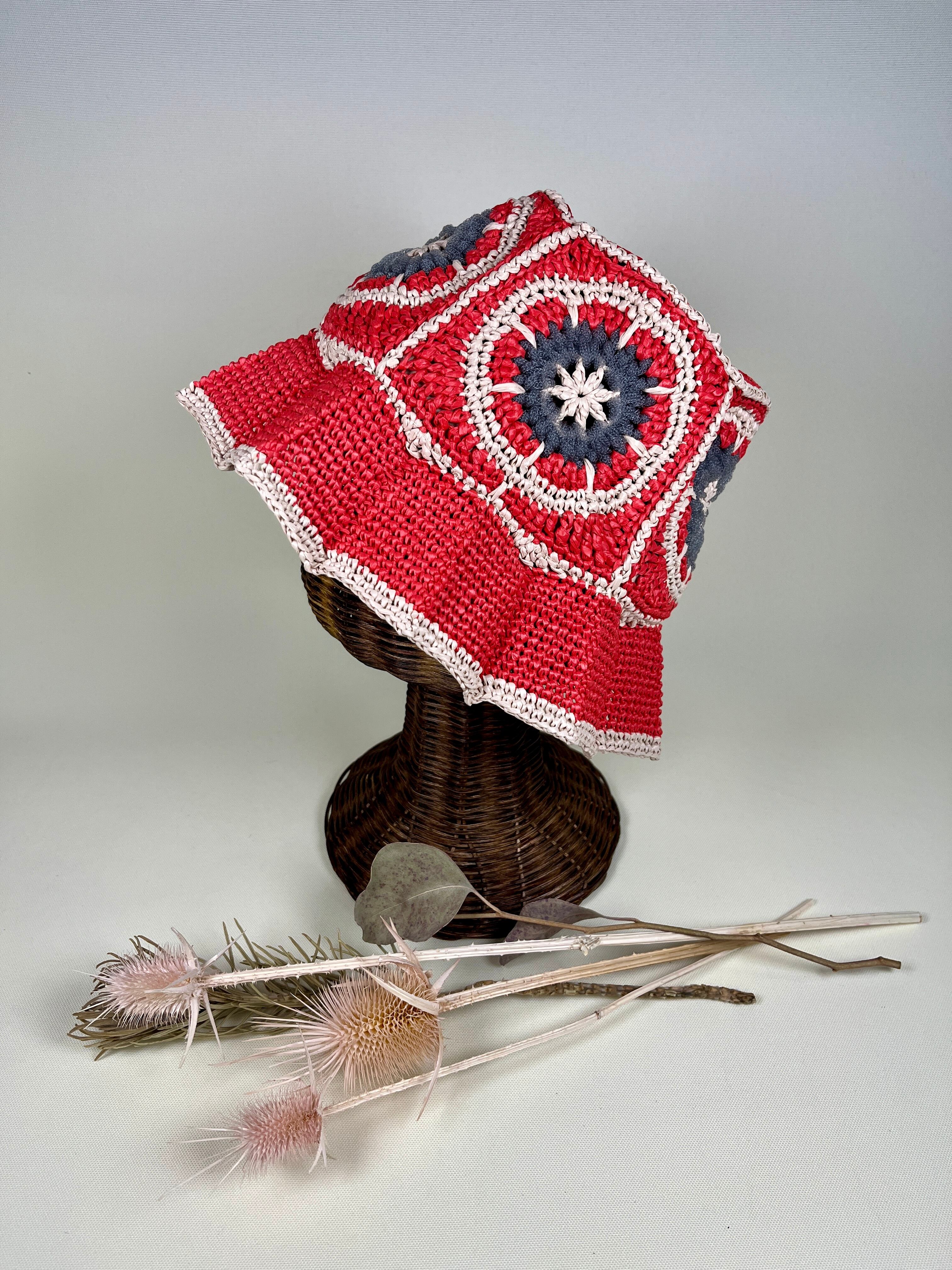 未来的なチューブ状のナイロン糸を伝統的なアフリカンモチーフにアクセントとして加えたら…という発想で出来ました。全体的にはコットンリンター(綿の種)由来の再生繊維で調和をとりました。ギザギザプリーツのブリムもオリエンタルなムードがあります。