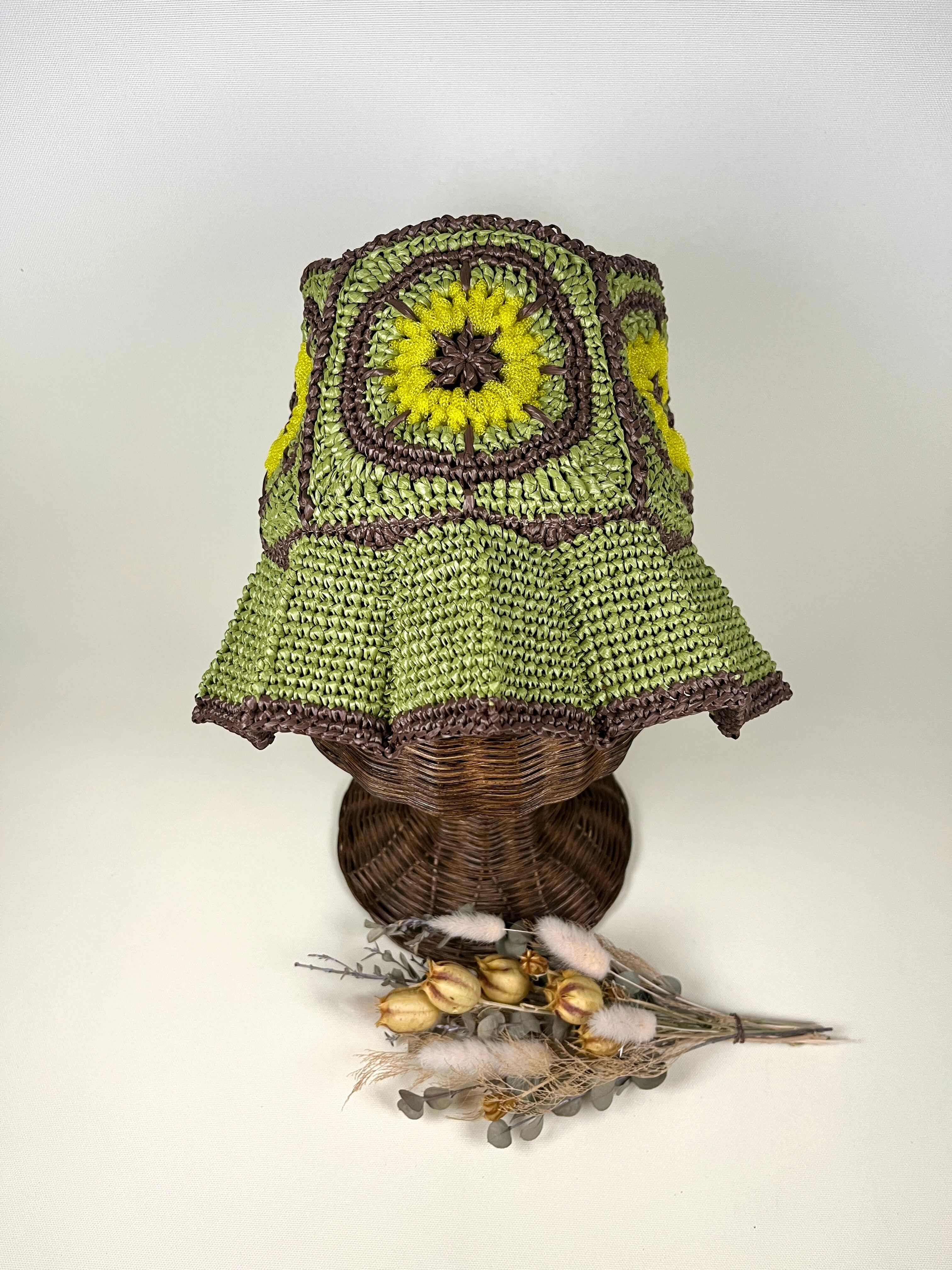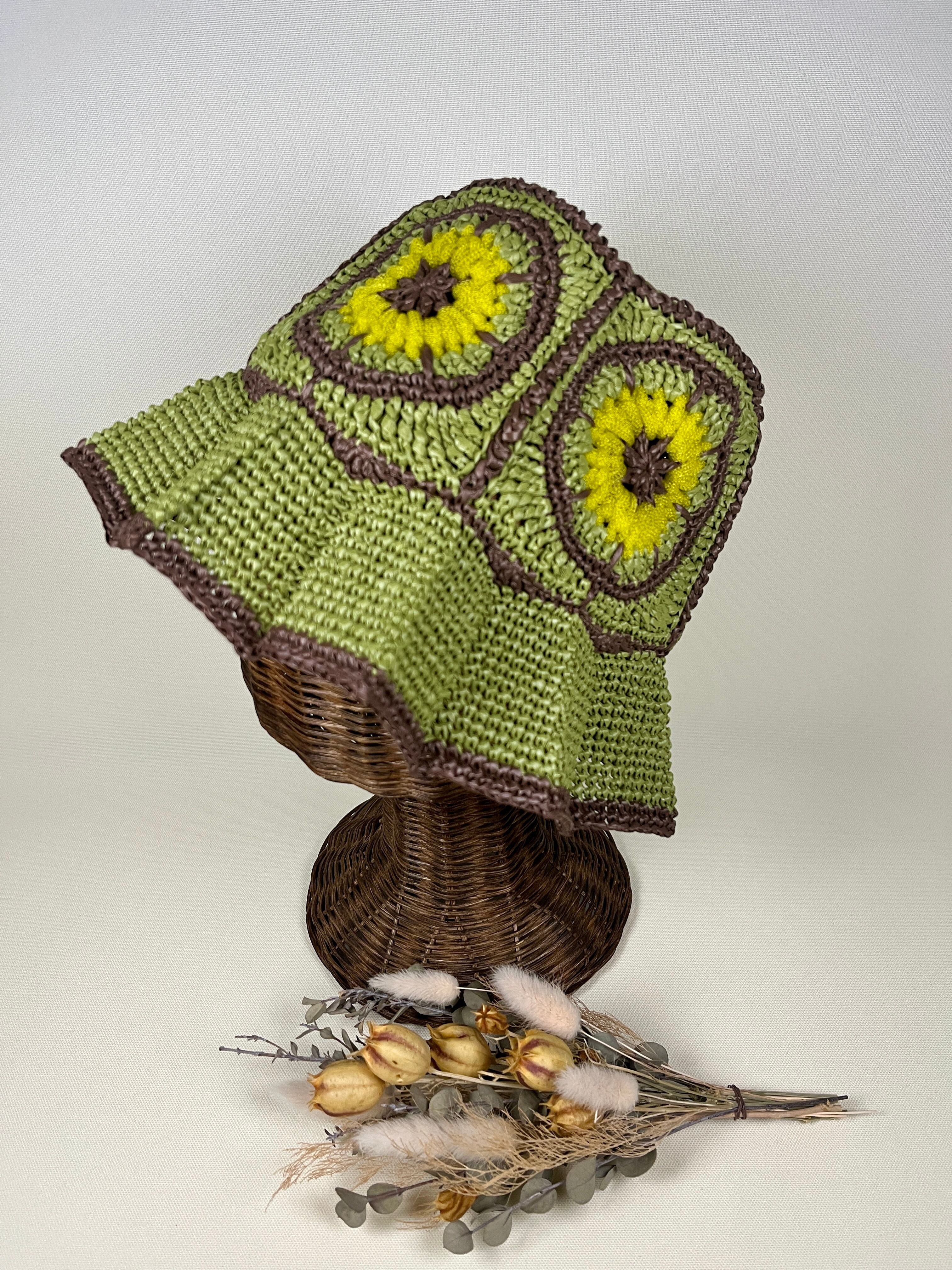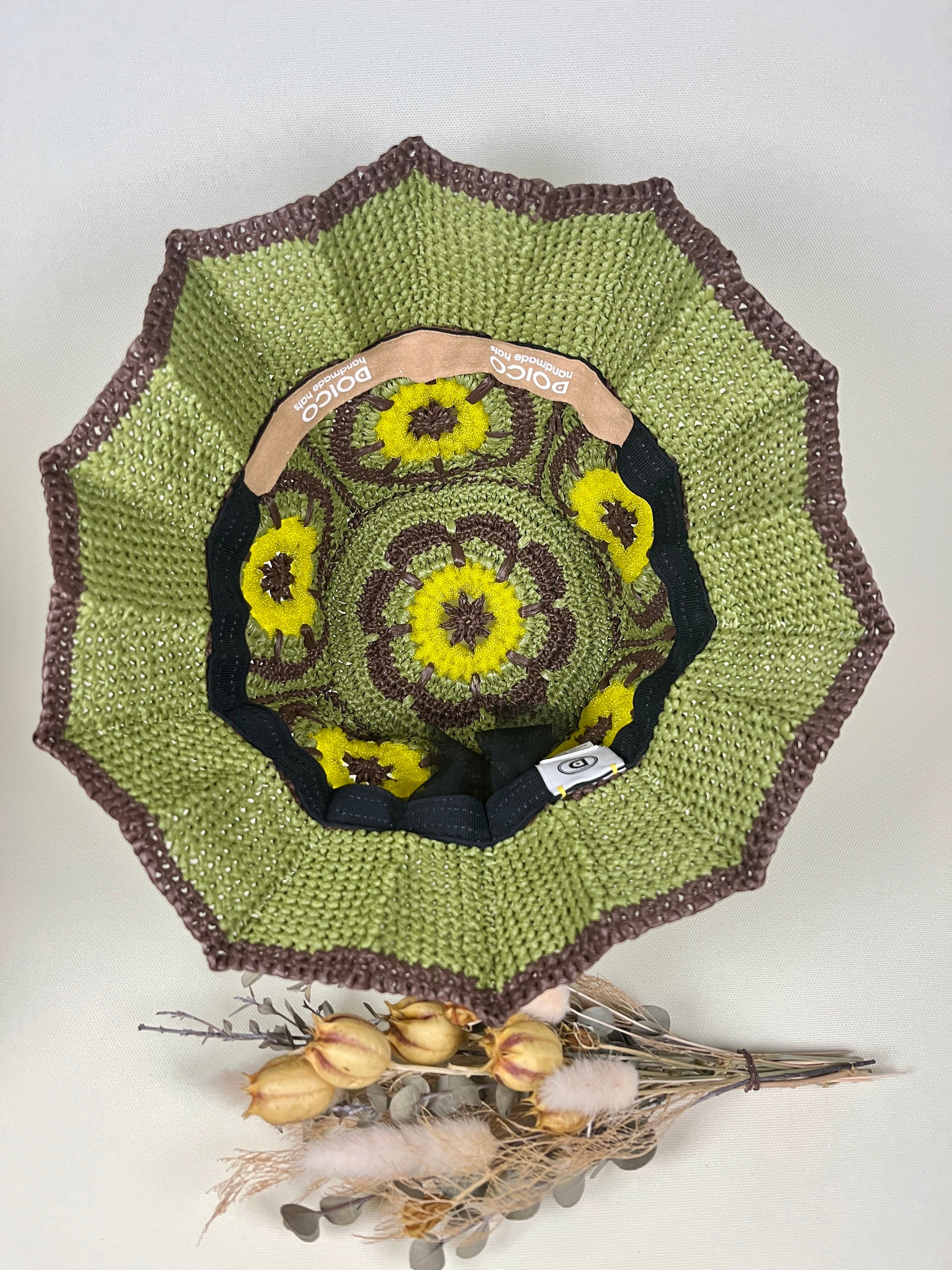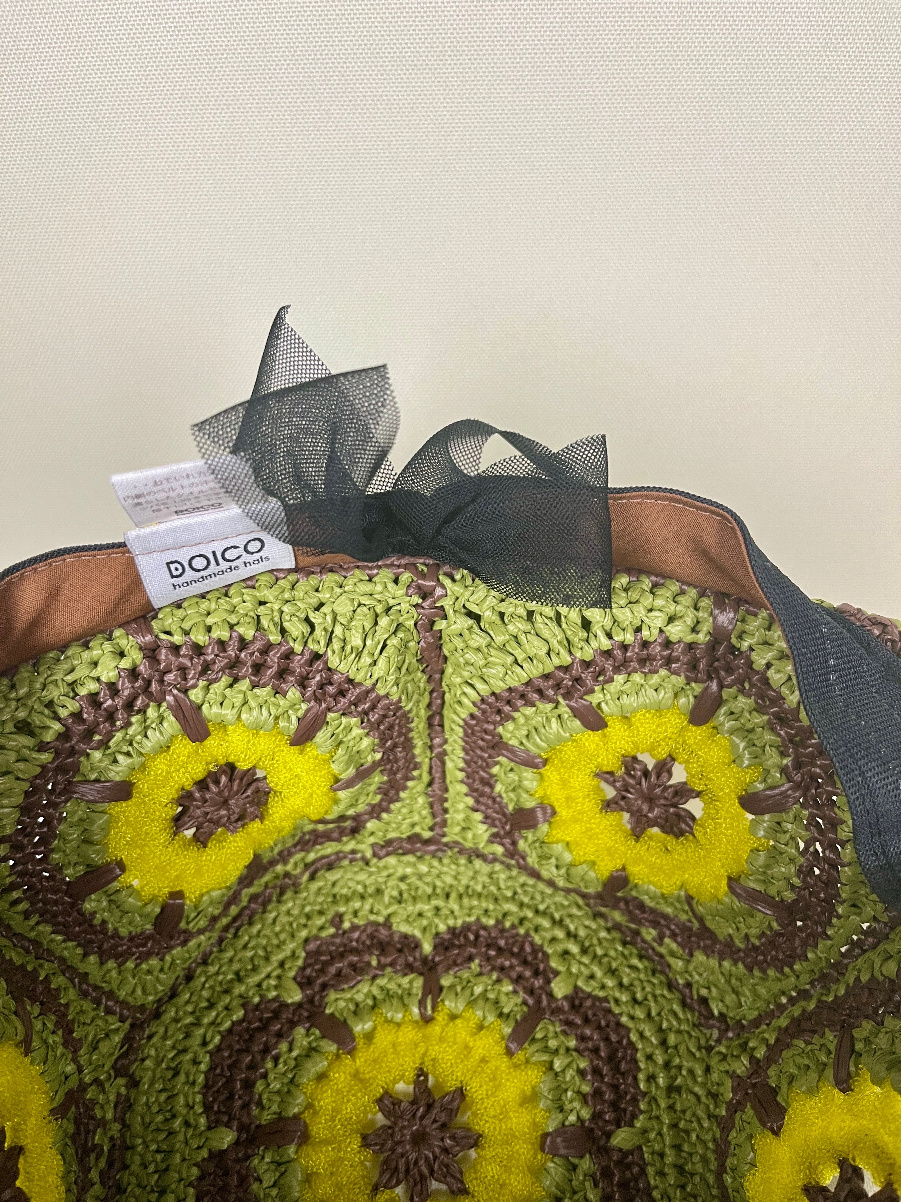 未来的なチューブ状のナイロン糸を伝統的なアフリカンモチーフにアクセントとして加えたら…という発想で出来ました。全体的にはコットンリンター(綿の種)由来の再生繊維で調和をとりました。ギザギザプリーツのブリムもオリエンタルなムードがあります。