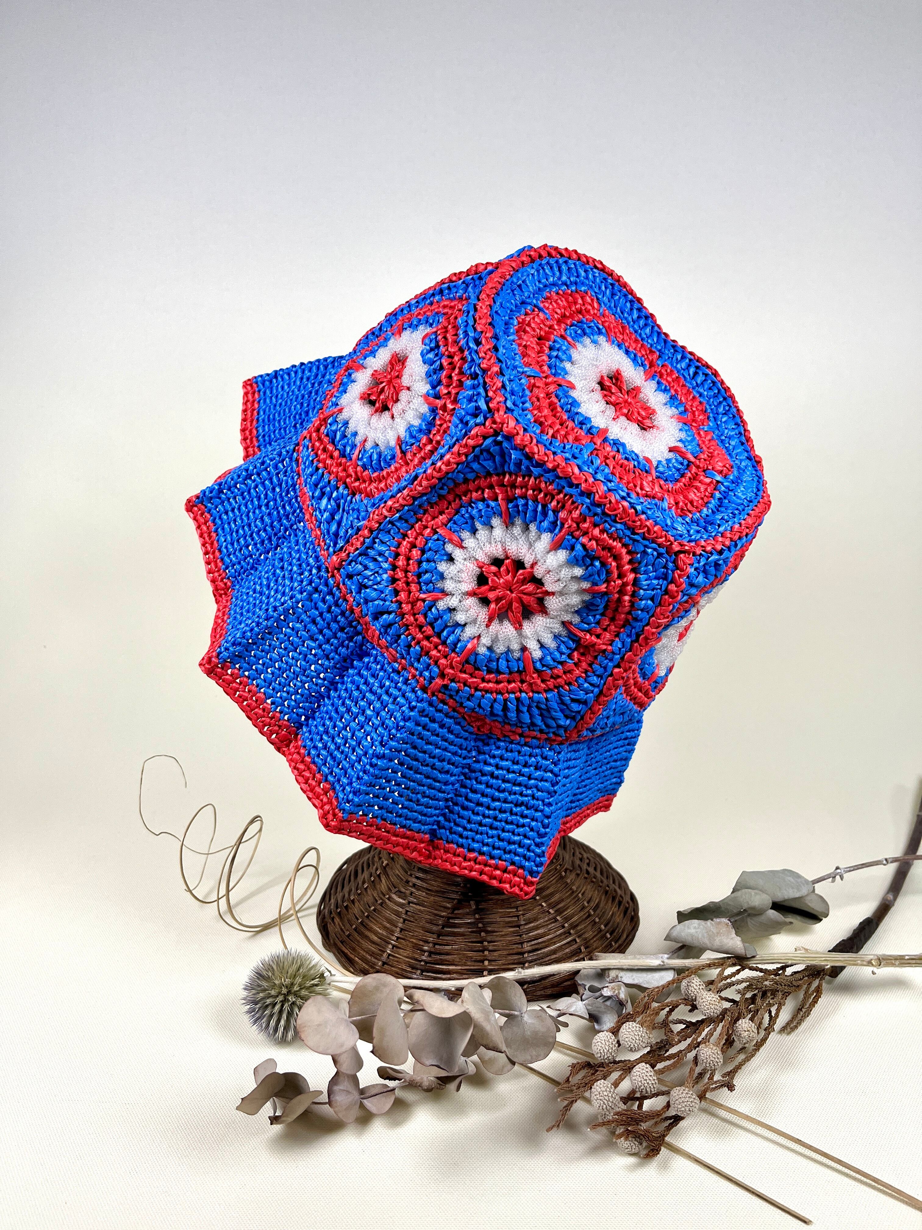 未来的なチューブ状のナイロン糸を伝統的なアフリカンモチーフにアクセントとして加えたら…という発想で出来ました。全体的にはコットンリンター(綿の種)由来の再生繊維で調和をとりました。ギザギザプリーツのブリムもオリエンタルなムードがあります。