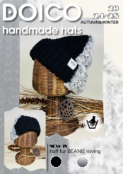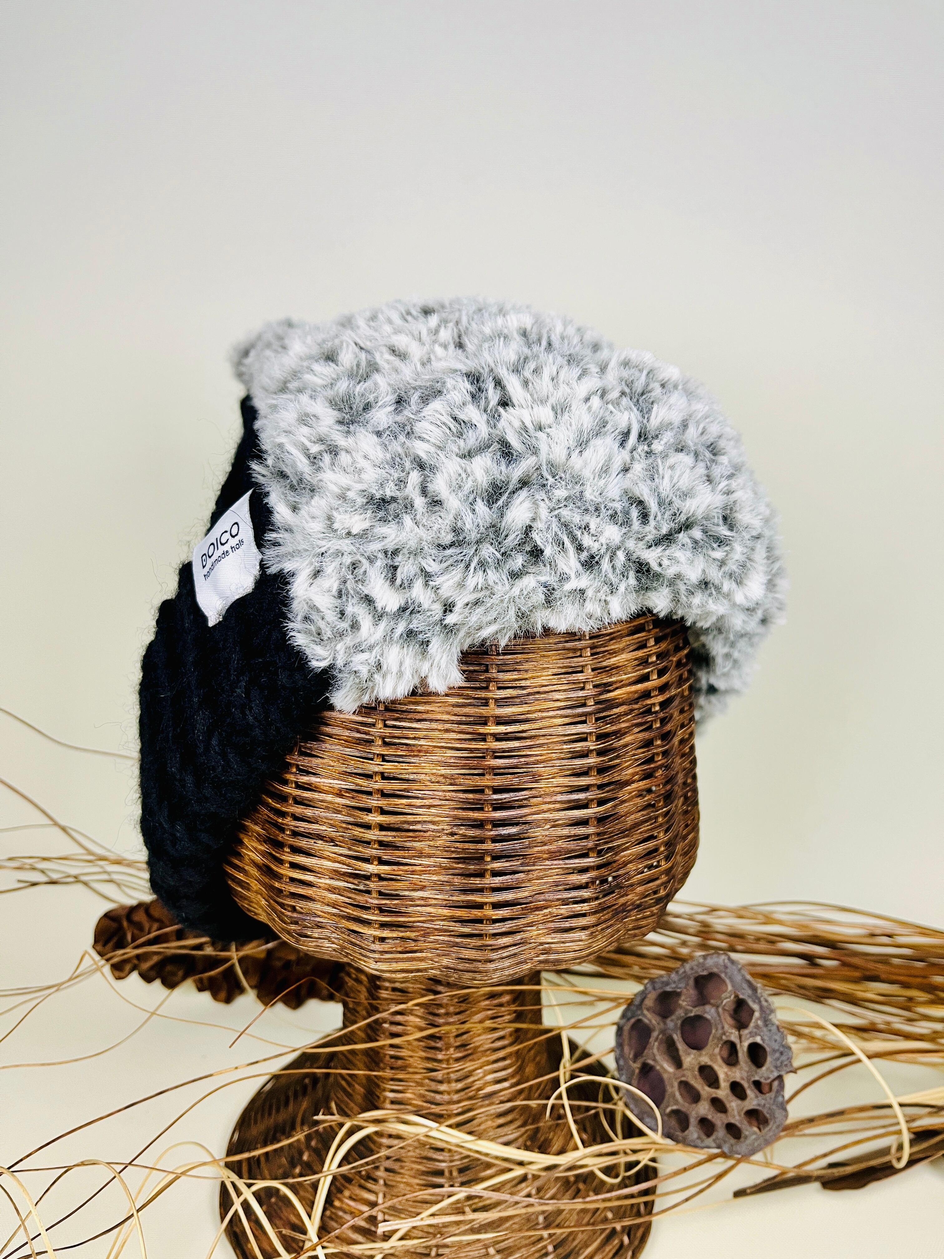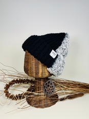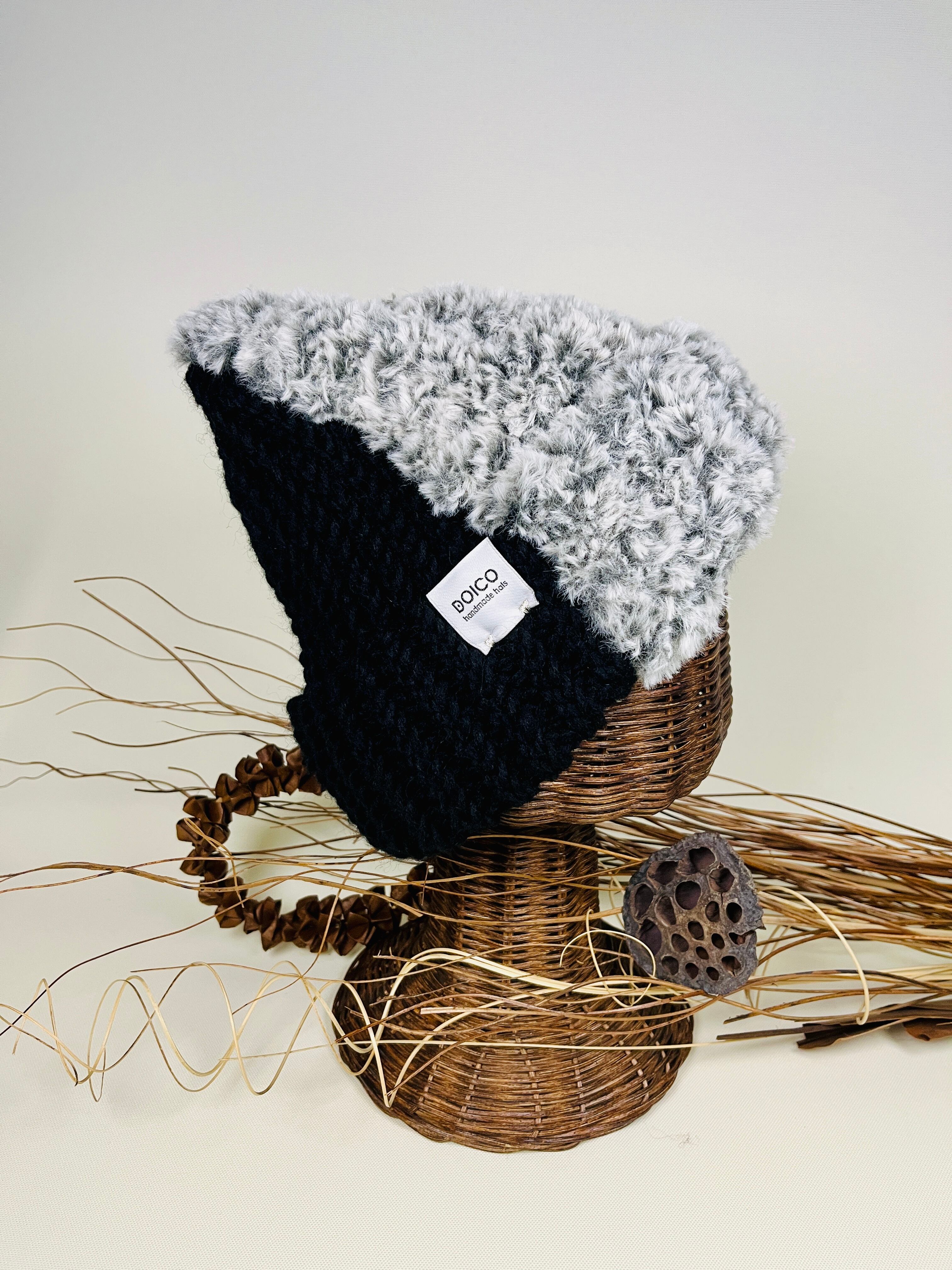 エコファーと太いロービング糸をタテ半分に切り替えたニット帽です。尖った先端がチャームポイントです。多くのビーニー帽では素材をタテに切り替えることはあまり無いように思います。DOICOではよく登場する手法です。