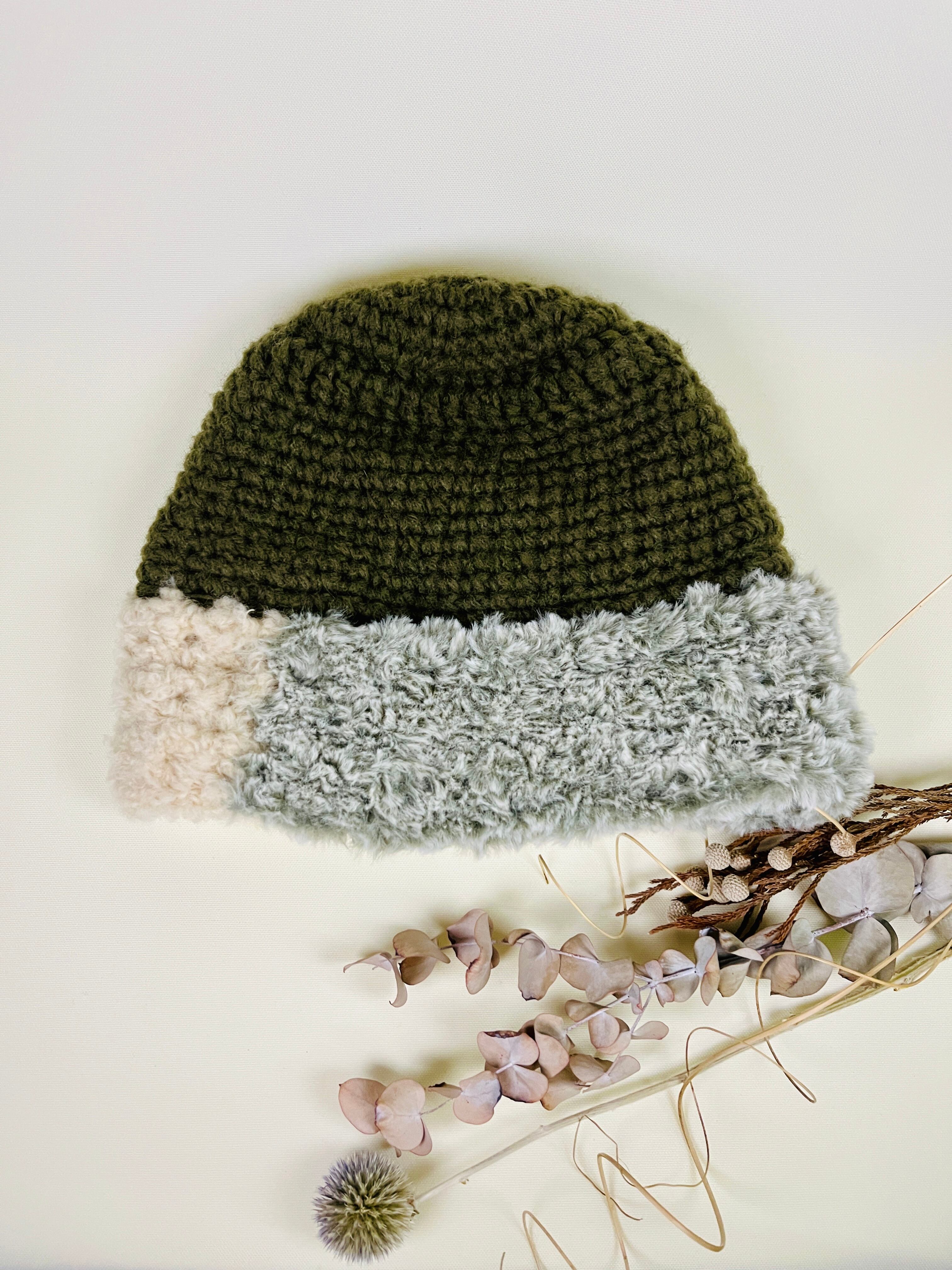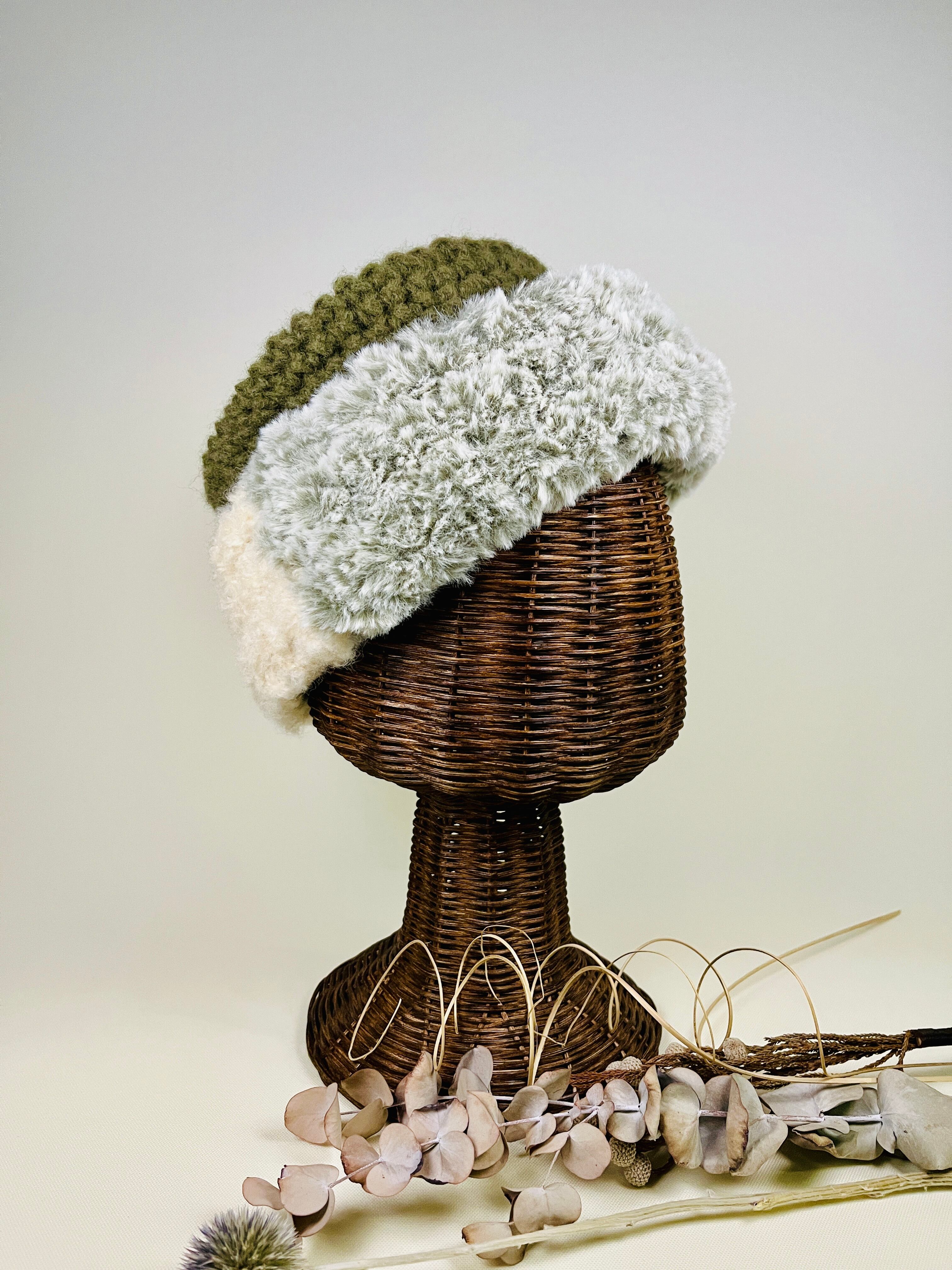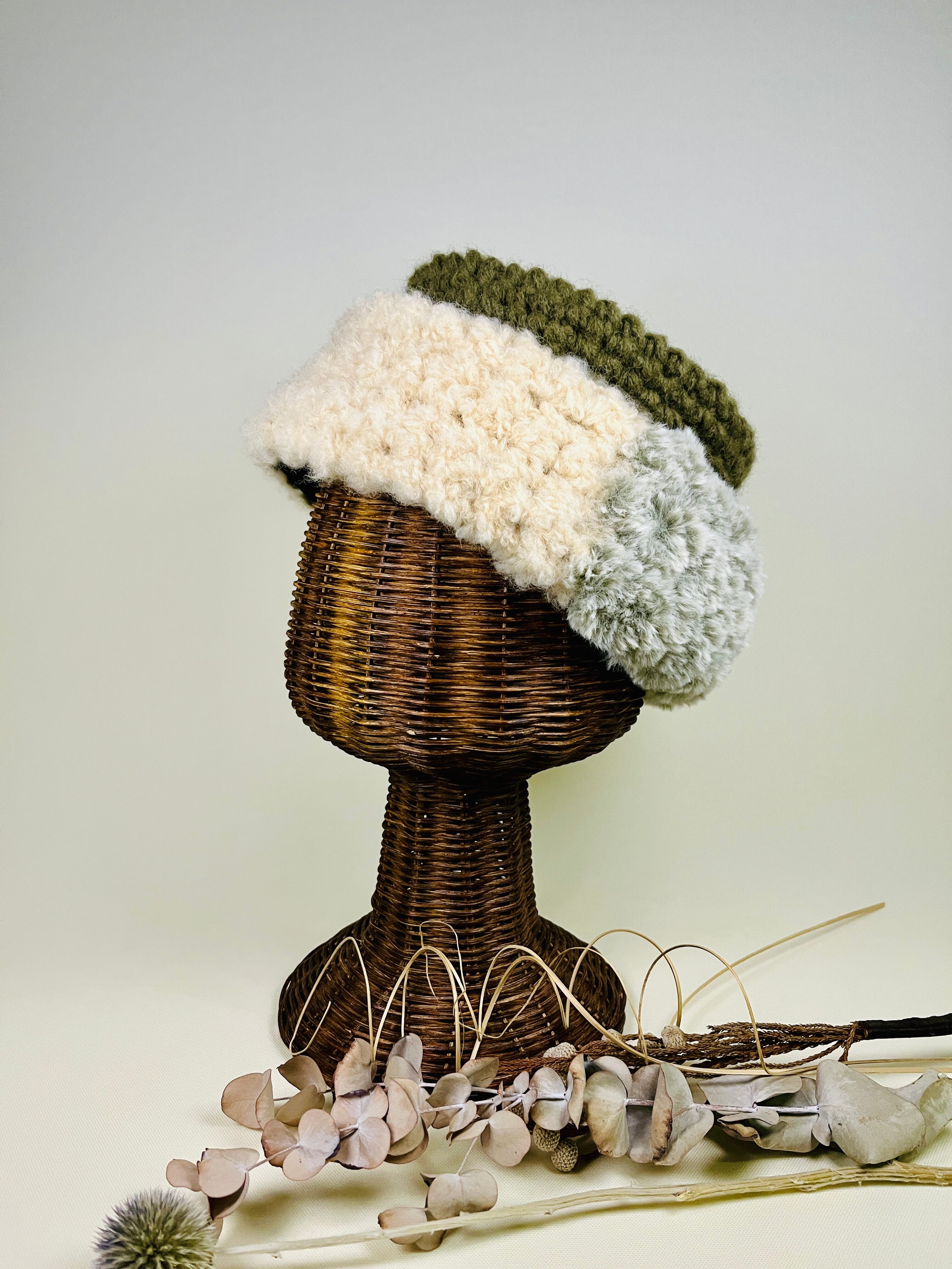 ブリムはクルクルのループヤーンとフワフワのファーヤーンで切り替えてあります。前、後ろ、斜めと多方面からお楽しみいただけます。