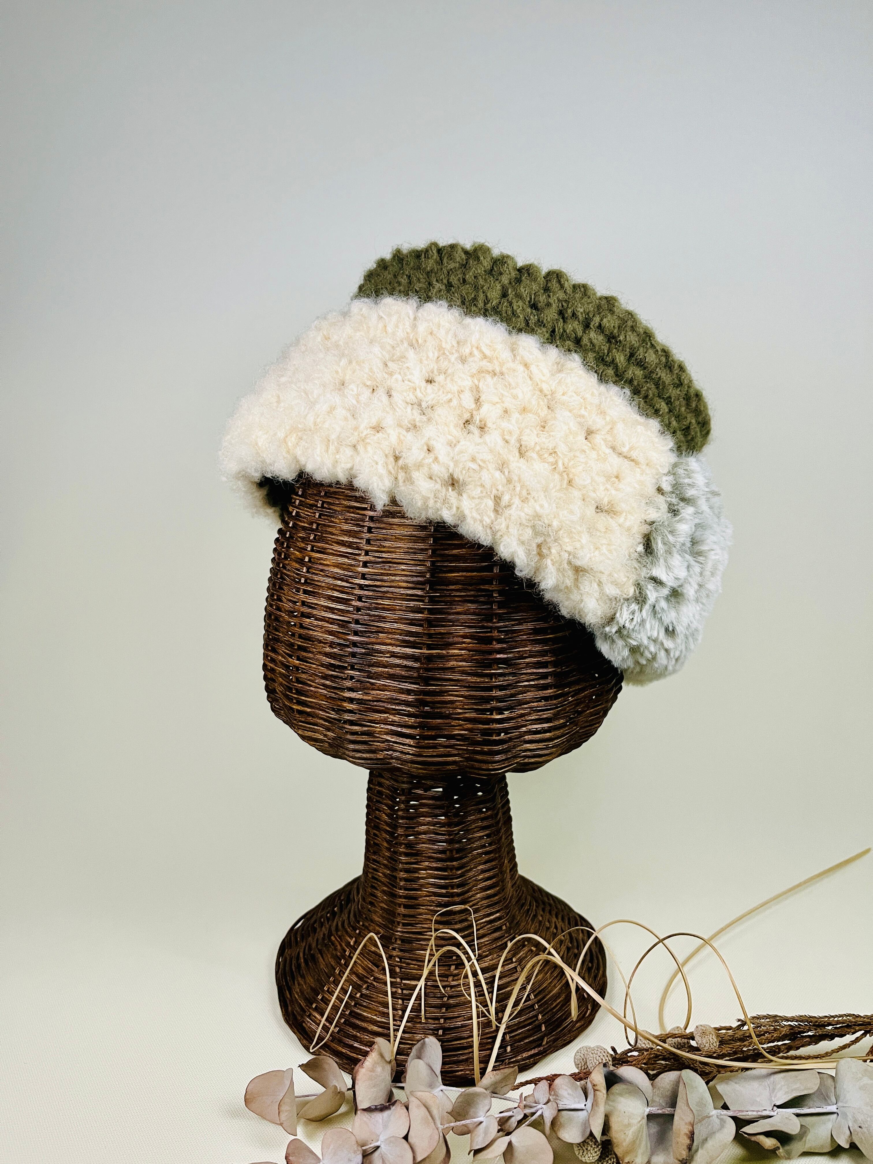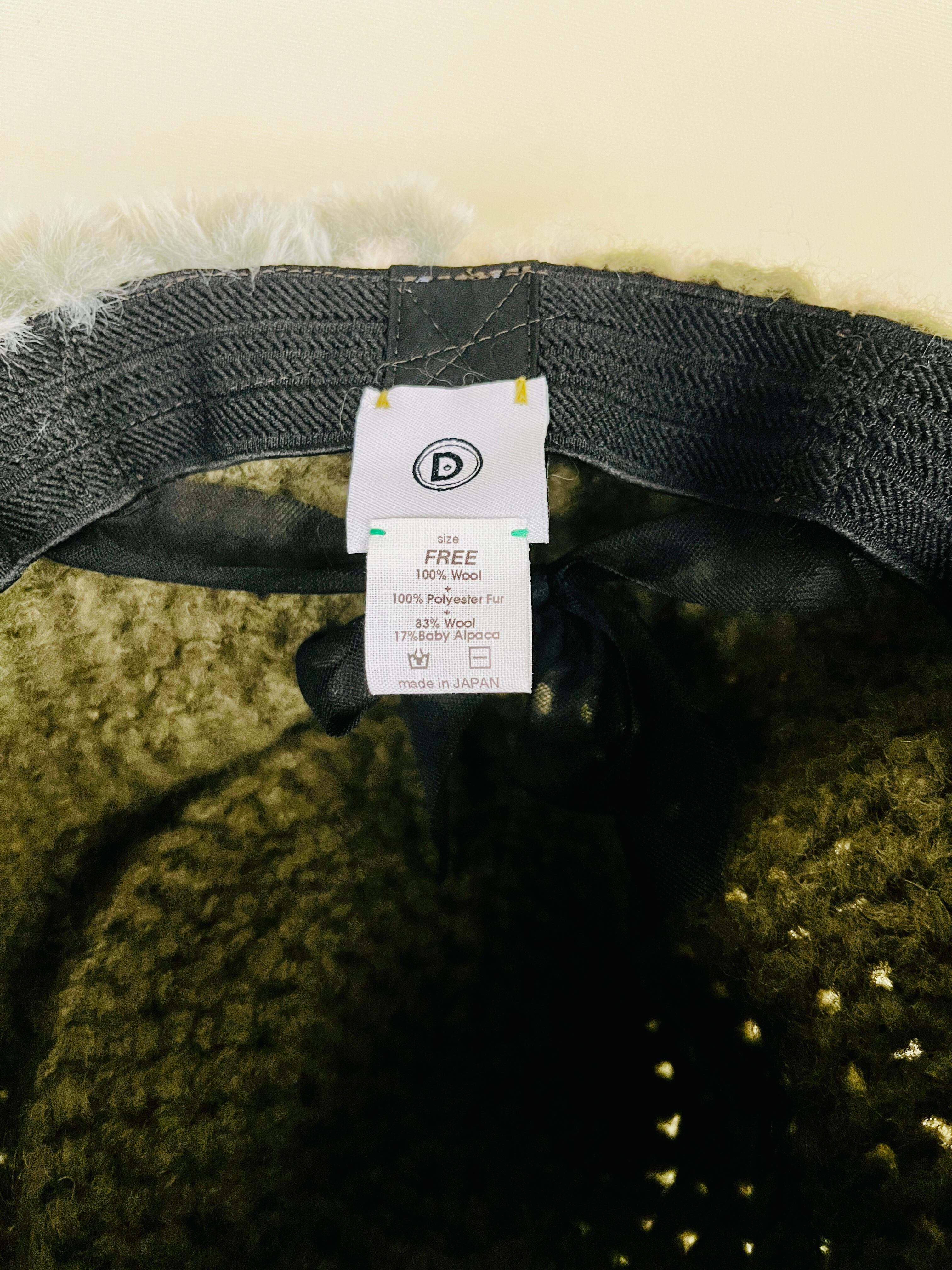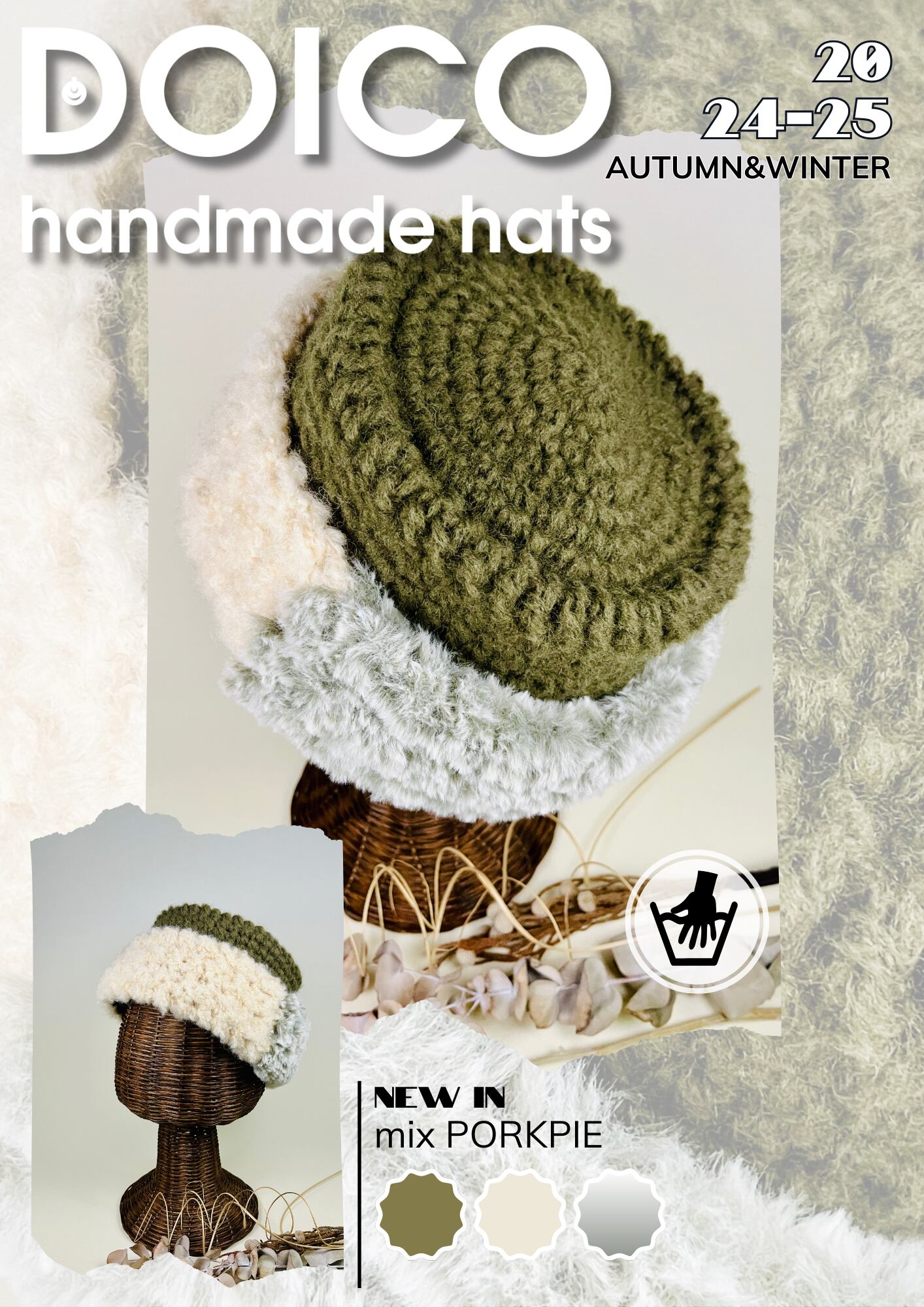 ブリムはクルクルのループヤーンとフワフワのファーヤーンで切り替えてあります。前、後ろ、斜めと多方面からお楽しみいただけます。