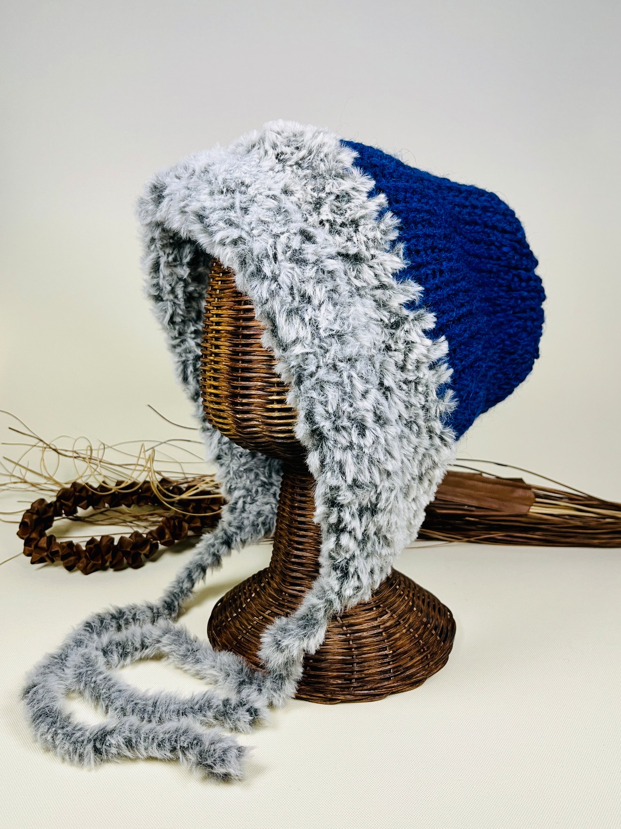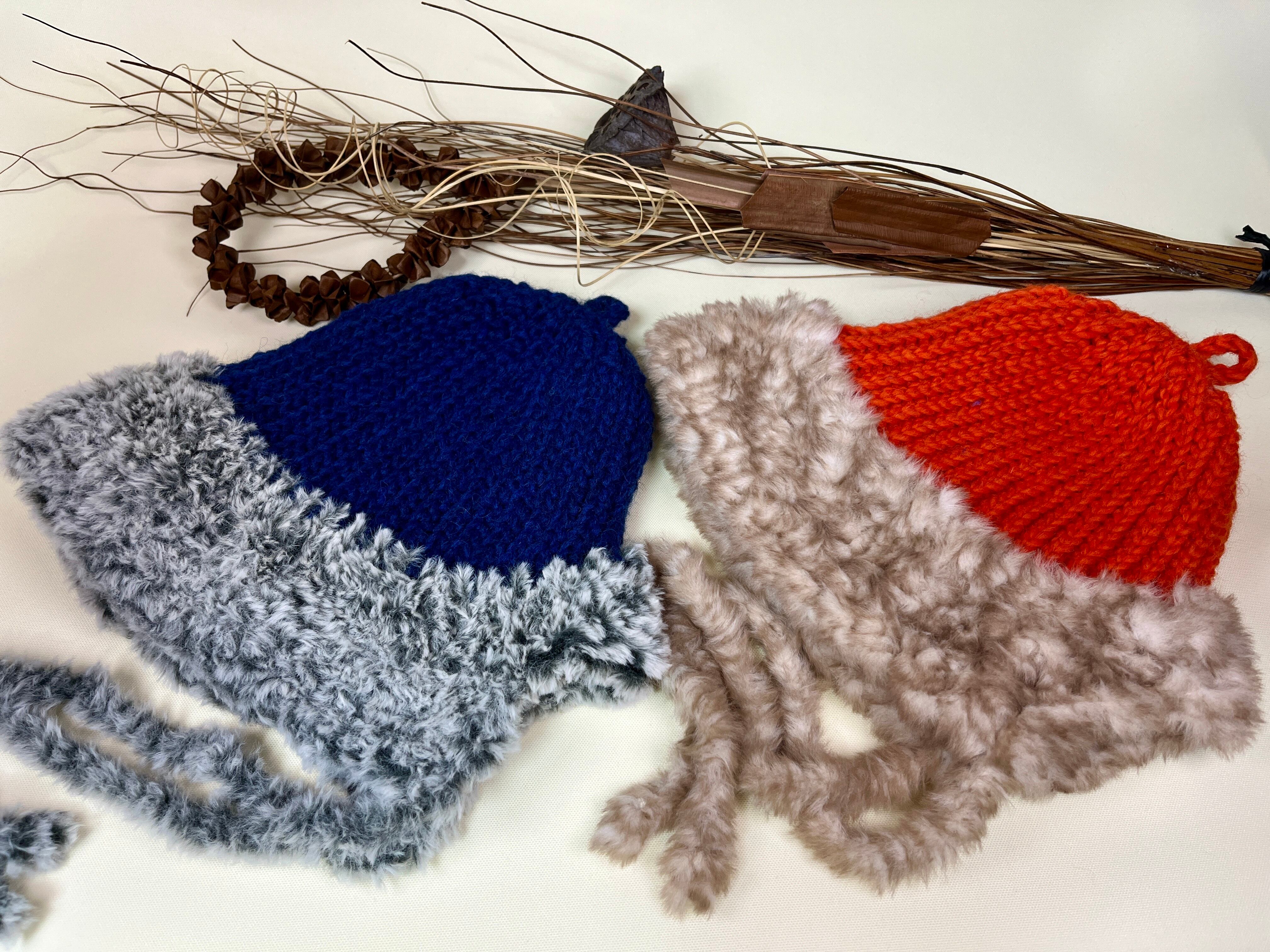 パーカーのフードのようなデザインで、耳まで暖かです。上からではなく、後ろから被ります。あごひもはトップのループで結ぶとフライトキャップみたいなイメージになります。トップのループは横姿のチャームポイントでもあります。
