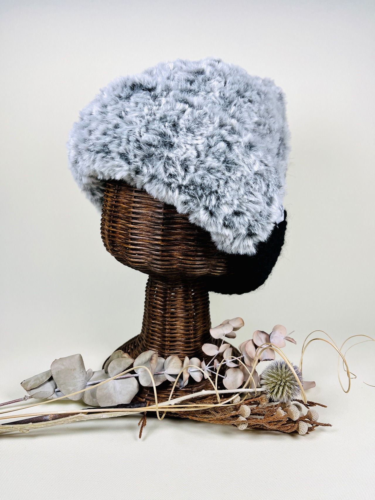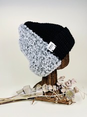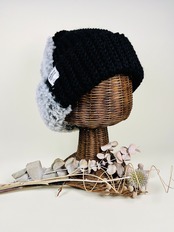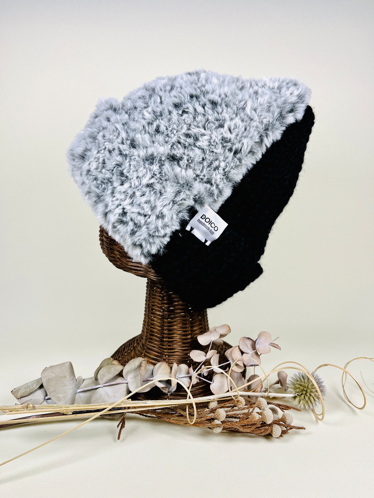エコファーと太いロービング糸をタテ半分に切り替えたニット帽です。尖った先端がチャームポイントです。多くのビーニー帽では異素材をタテに切り替えることはあまり無いように思います。DOICOではよく登場する手法です。