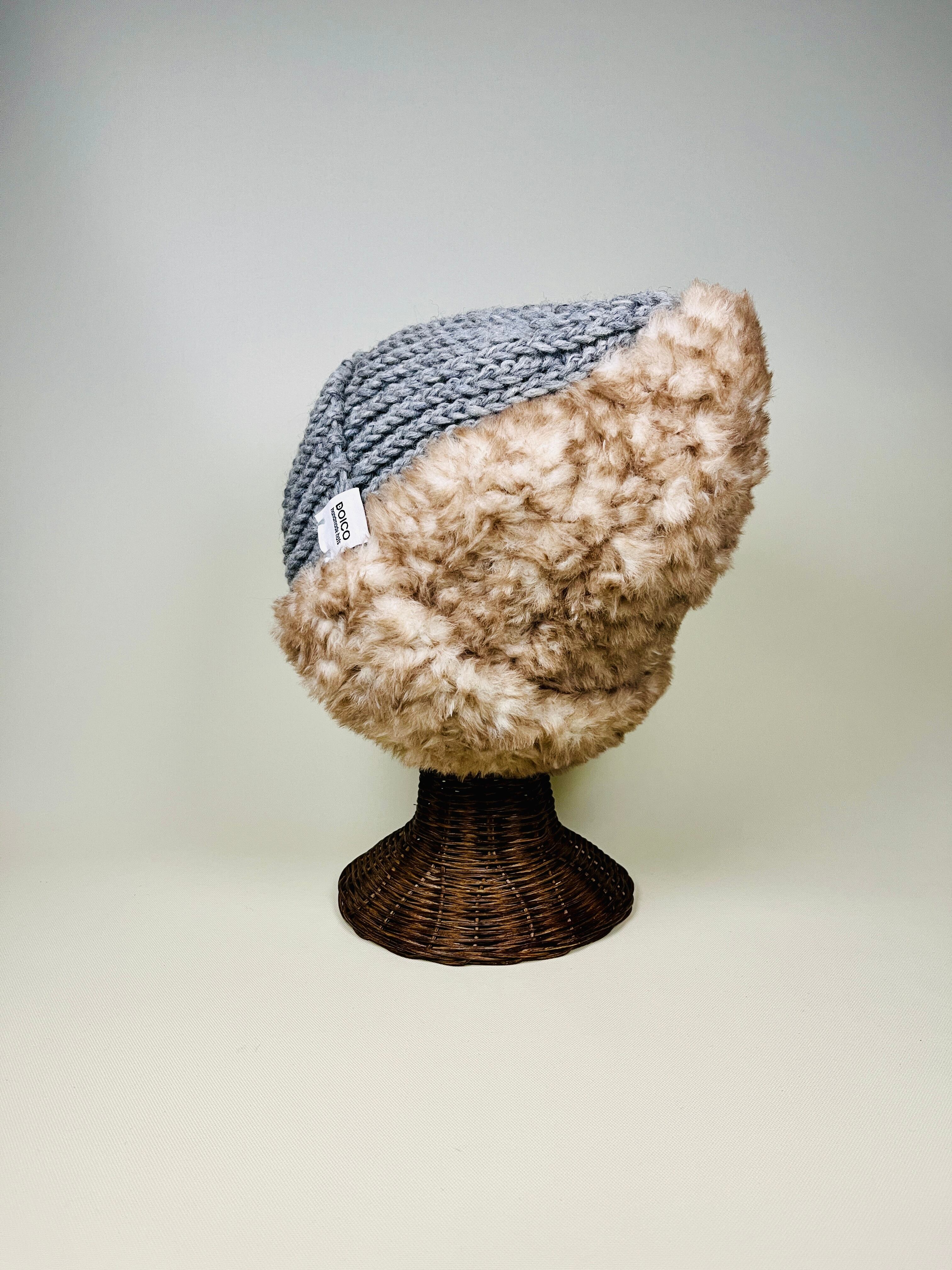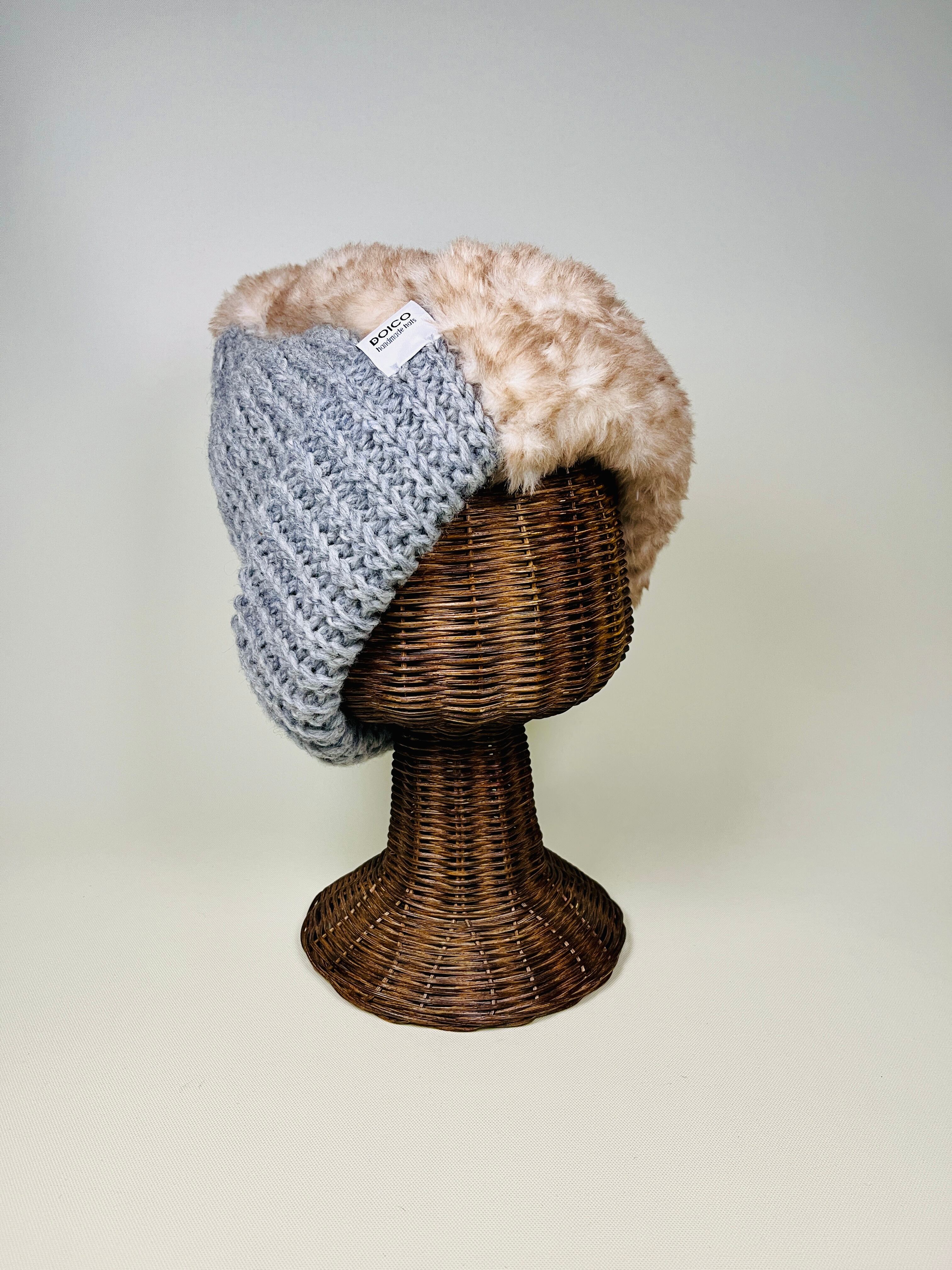 エコファーと太いロービング糸をタテ半分に切り替えたニット帽です。尖った先端がチャームポイントです。多くのビーニー帽では異素材をタテに切り替えることはあまり無いように思います。DOICOではよく登場する手法です。