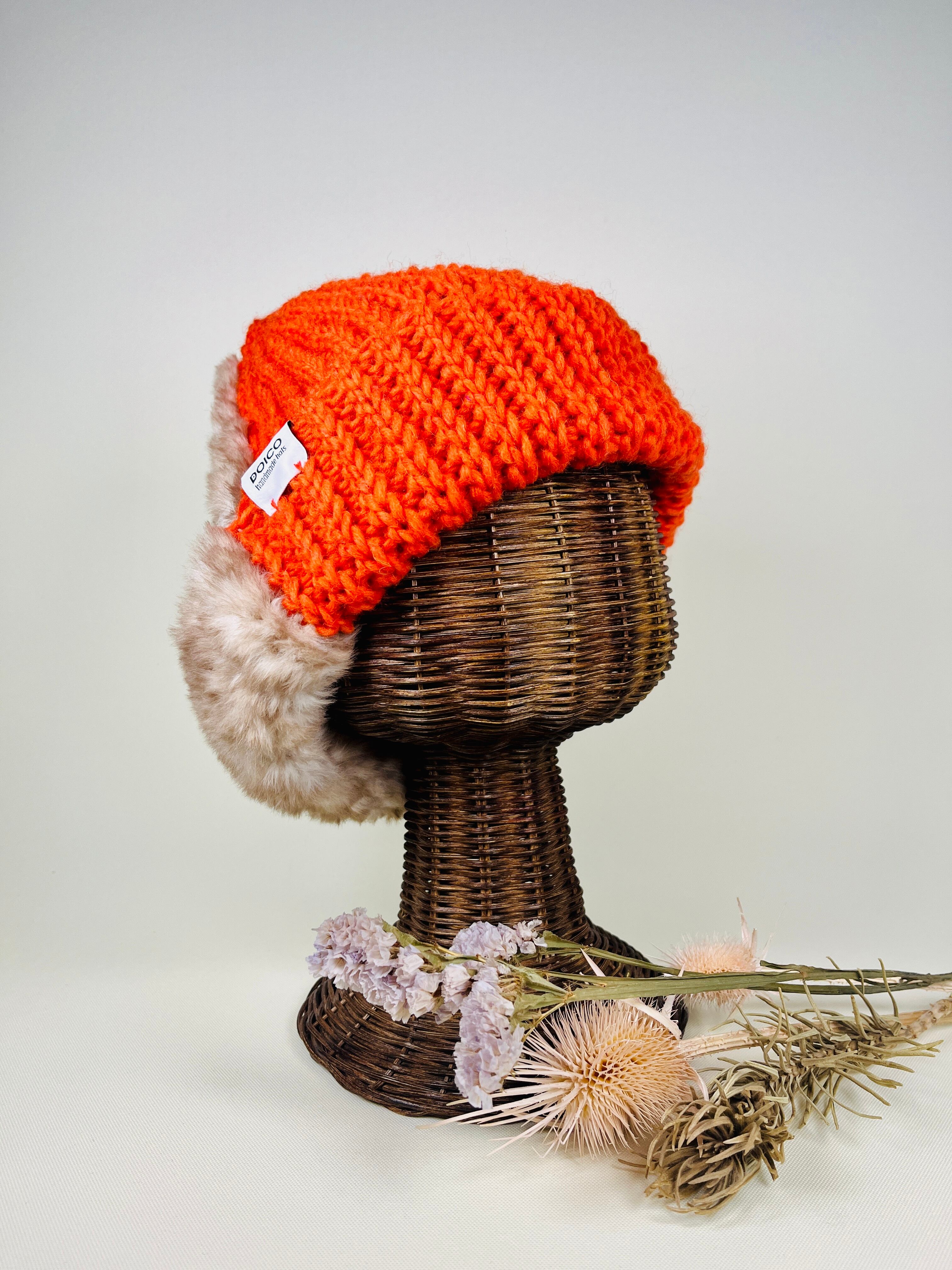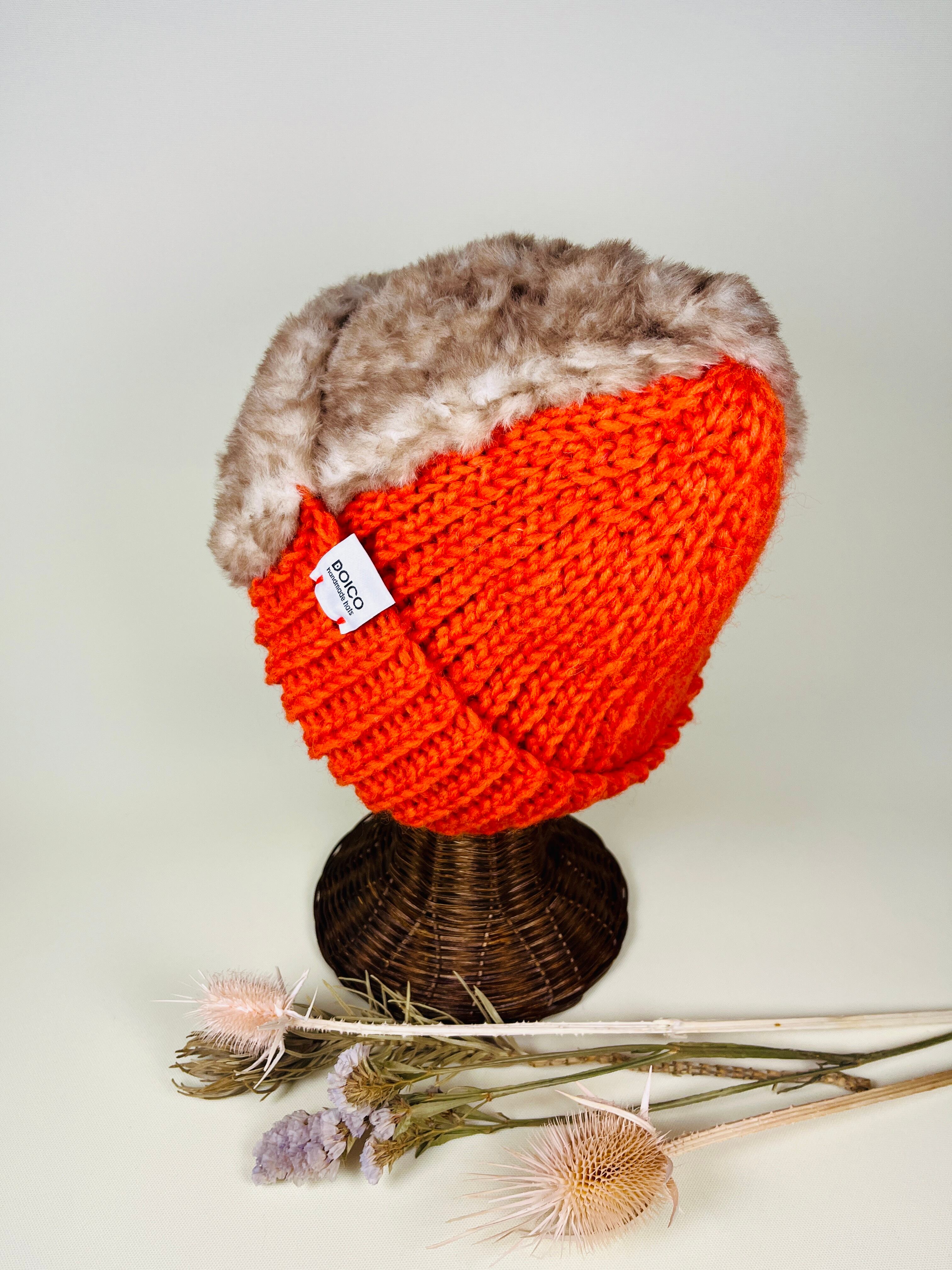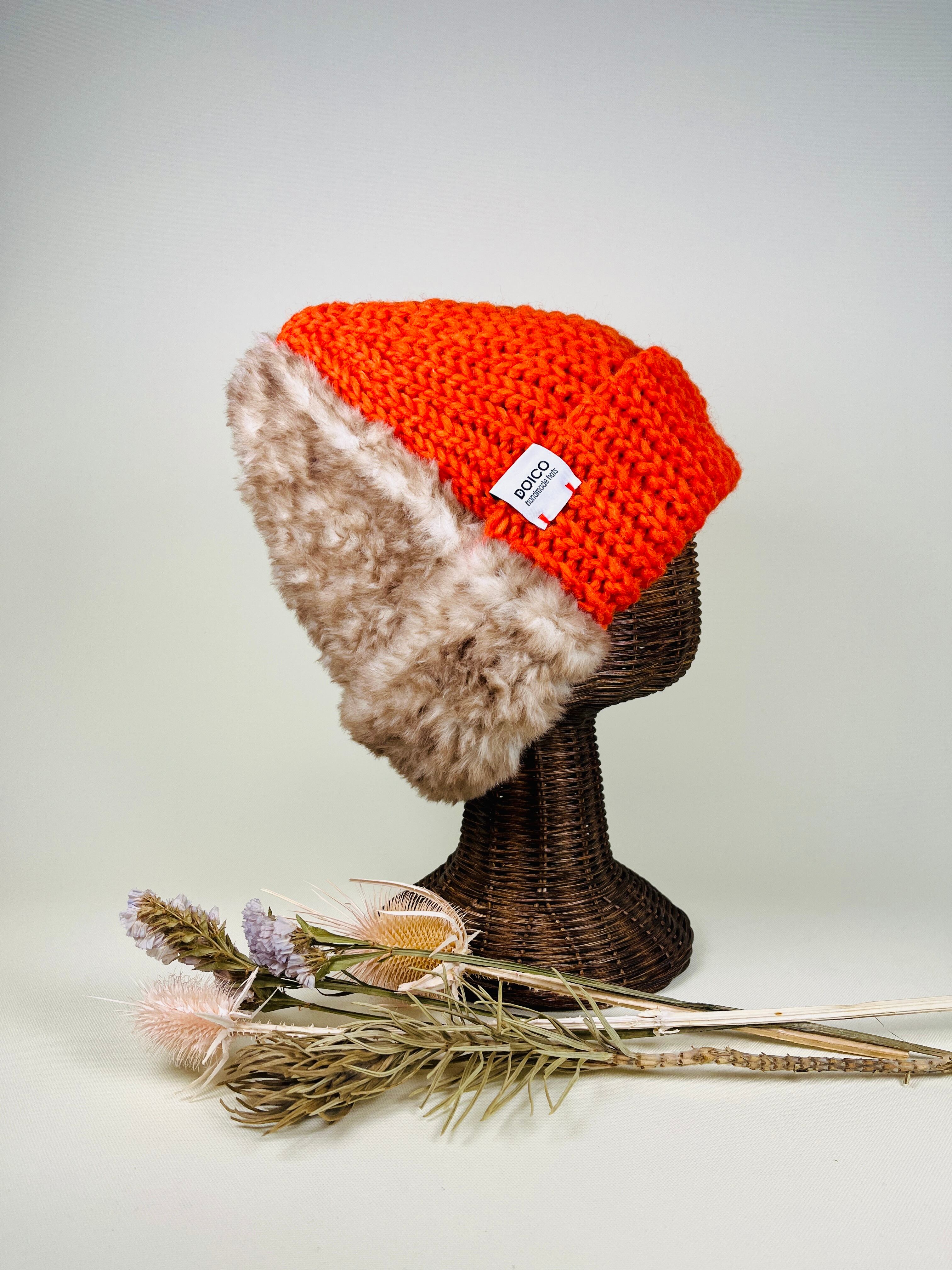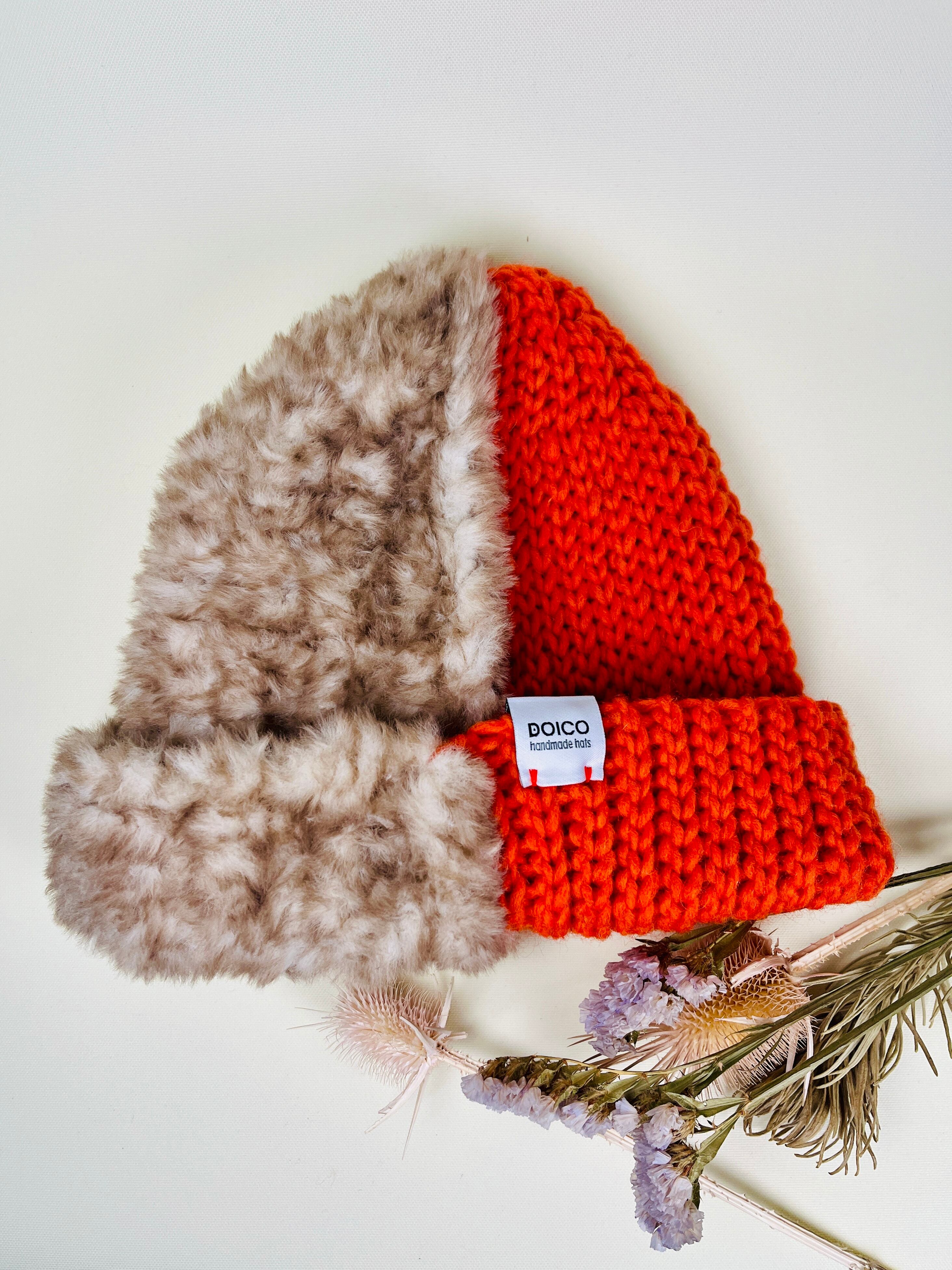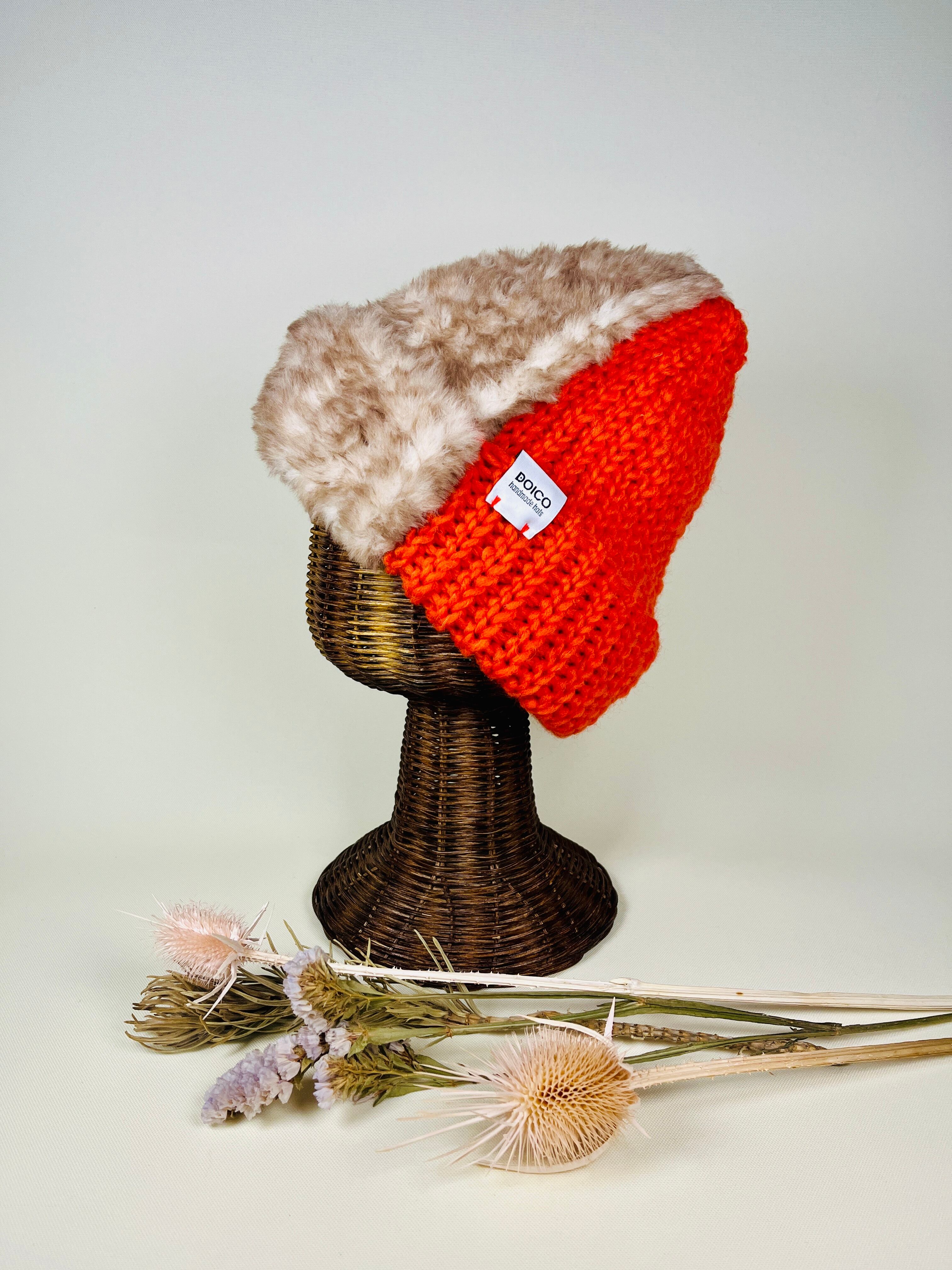 エコファーと太いロービング糸をタテ半分に切り替えたニット帽です。尖った先端がチャームポイントです。多くのビーニー帽では異素材をタテに切り替えることはあまり無いように思います。DOICOではよく登場する手法です。