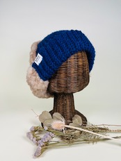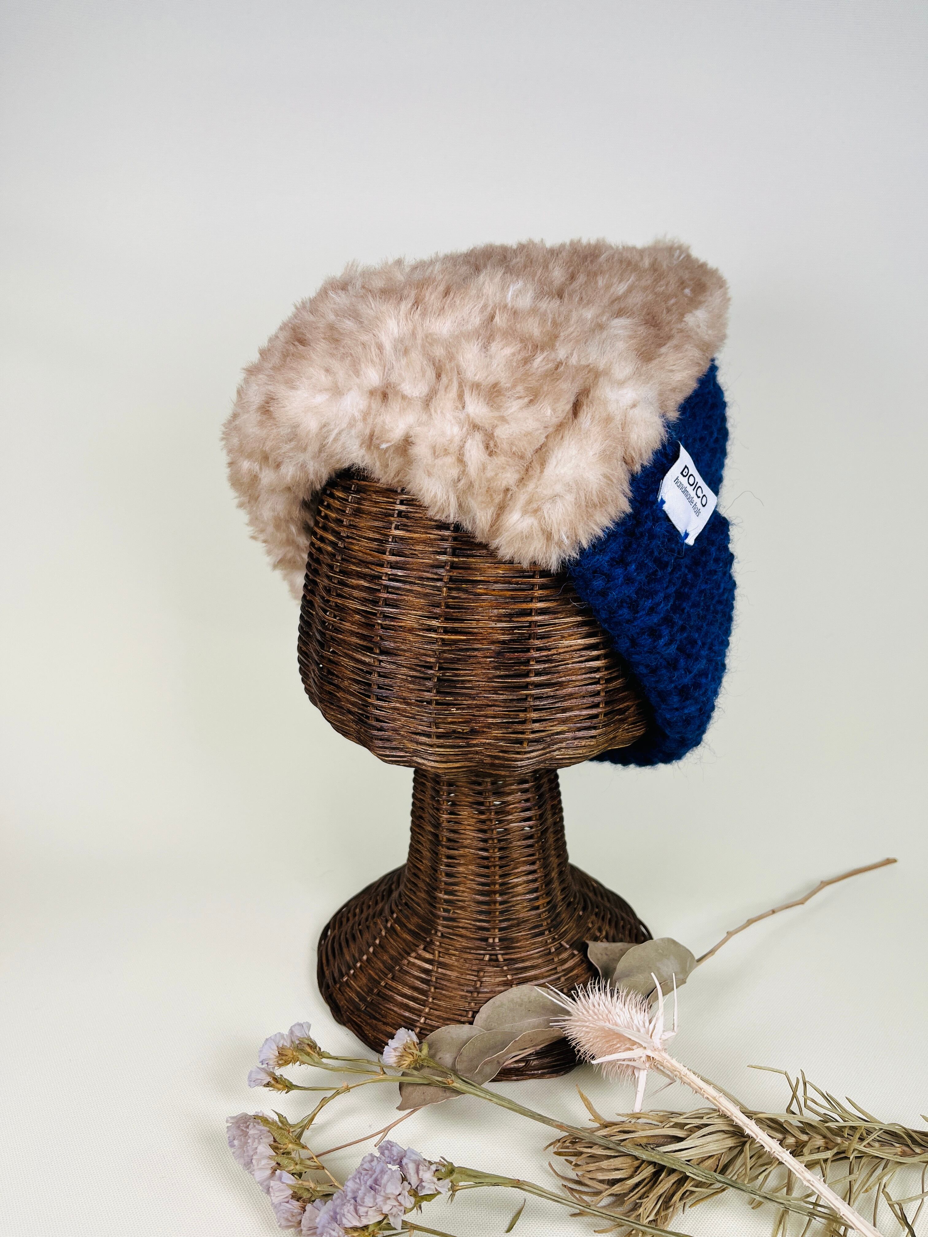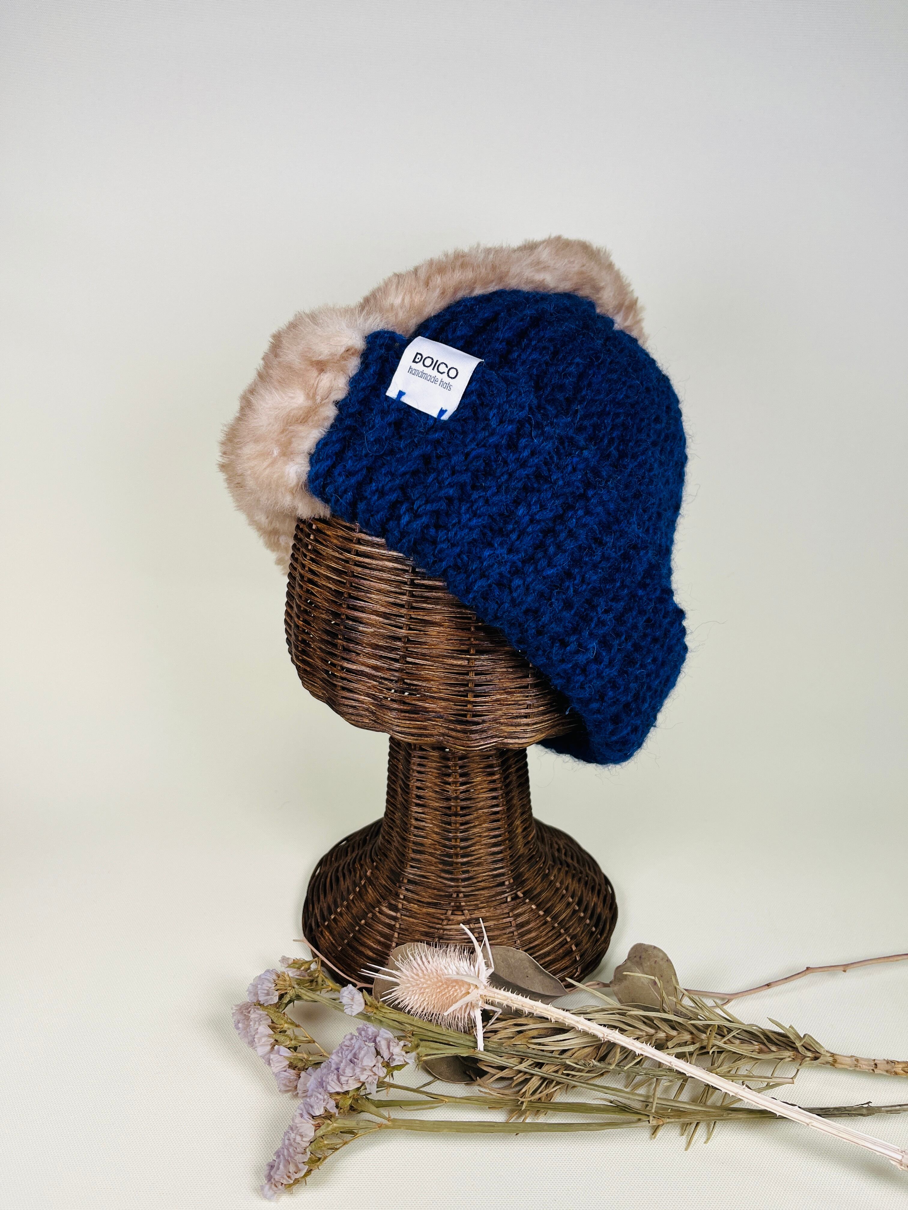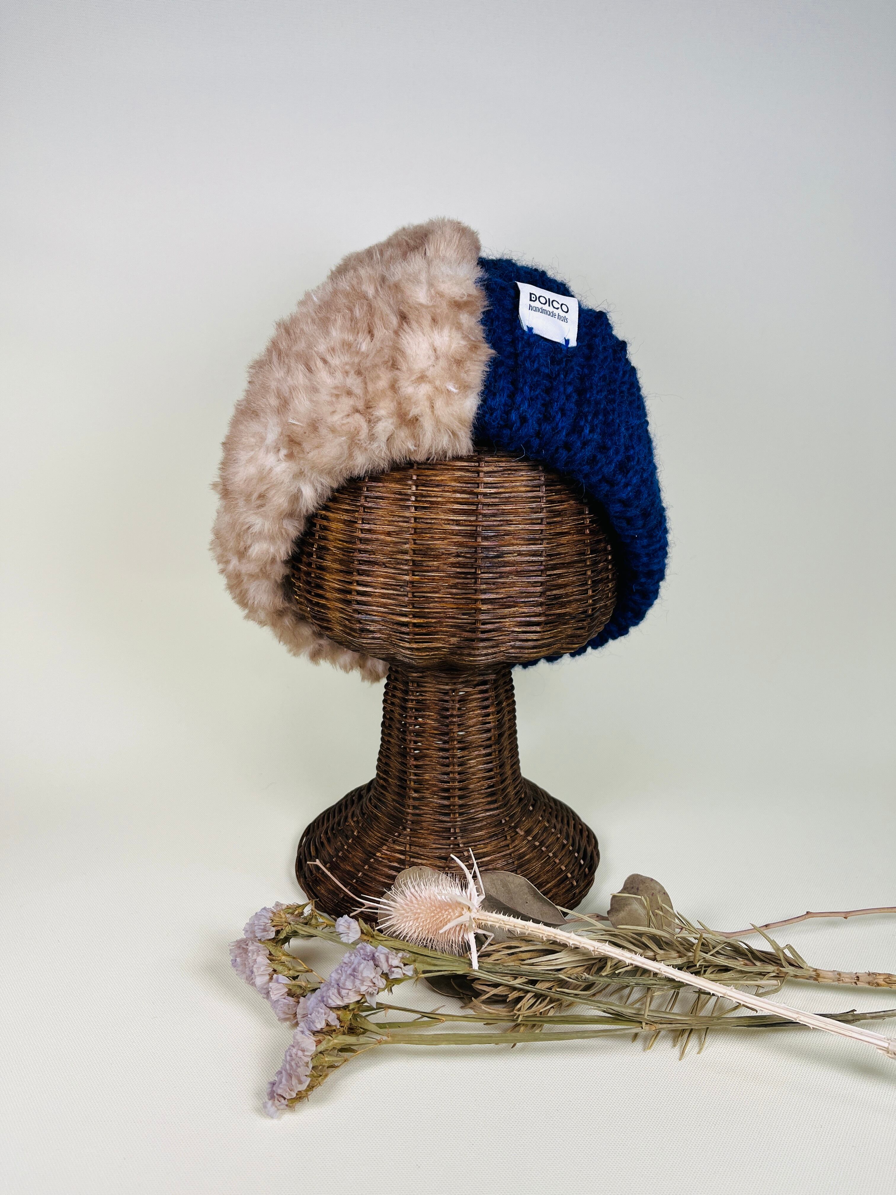 エコファーと太いロービング糸をタテ半分に切り替えたニット帽です。尖った先端がチャームポイントです。多くのビーニー帽では異素材をタテに切り替えることはあまり無いように思います。DOICOではよく登場する手法です。