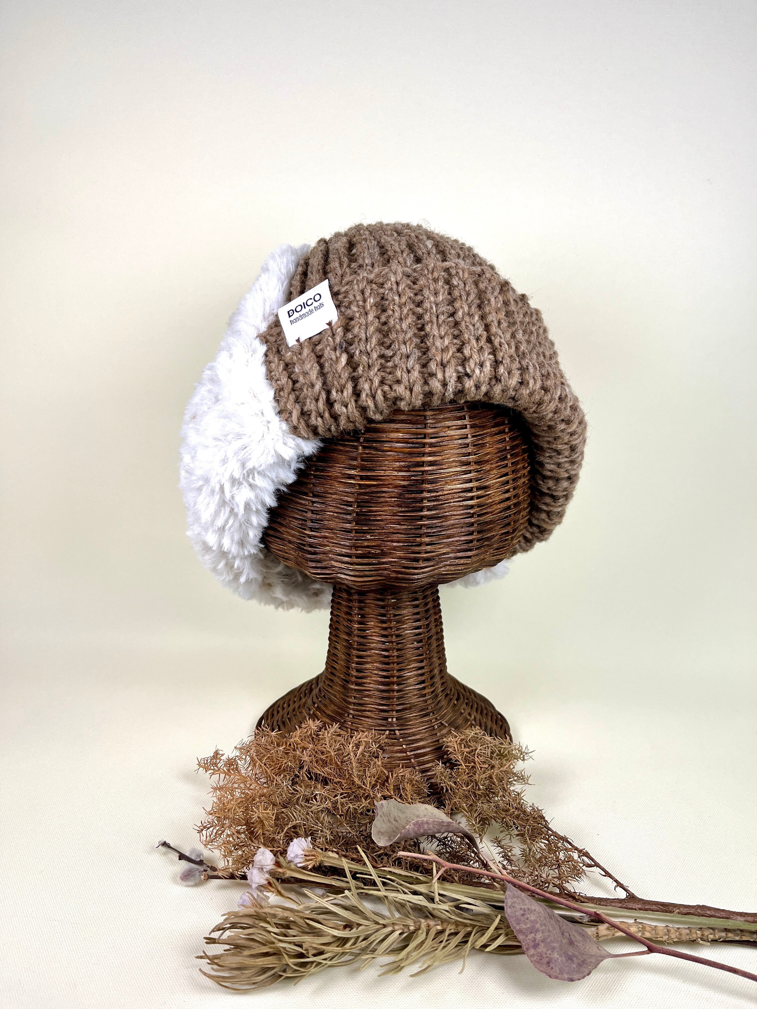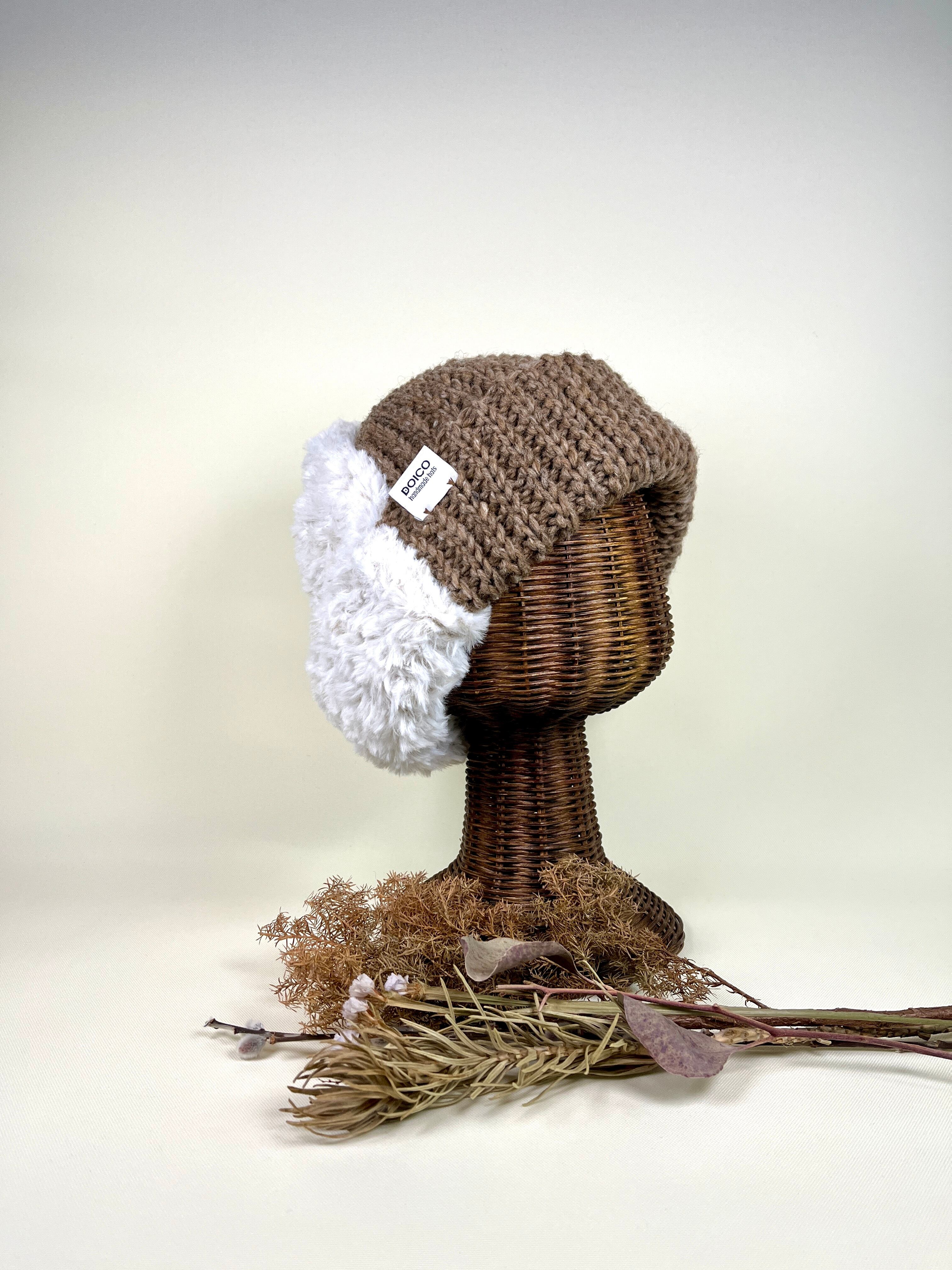エコファーと太いロービング糸をタテ半分に切り替えたニット帽です。尖った先端がチャームポイントです。多くのビーニー帽では異素材をタテに切り替えることはあまり無いように思います。DOICOではよく登場する手法です。