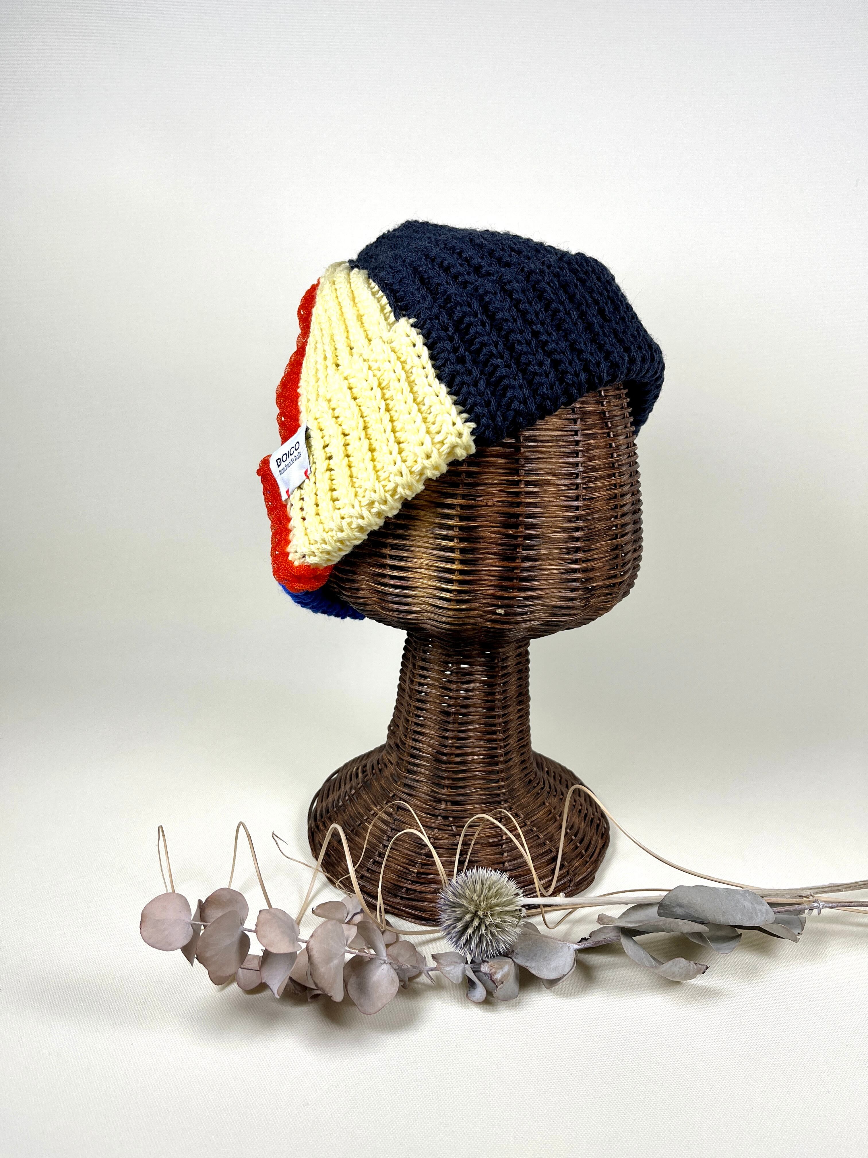 くつ下用の糸3色でビーニー帽を編みました。肌触りもさらっと柔らかです。なんといってもカラーがとっても鮮やかで美しいです。アクセントにナイロンチューブをライン状に入れてスポーティな雰囲気です。